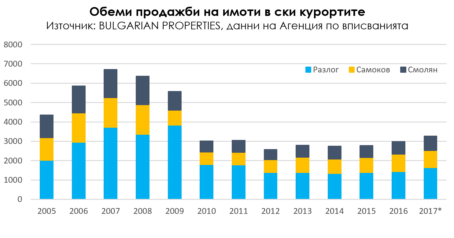 2017 г. постави ново начало за имотите в ски курортите. Нараснала активност, включително и през летните месеци, увеличаващи се обеми продажби, стабилизирани цени и преобладаващи български купувачи – това са основните тенденции за изтичащата вече година.