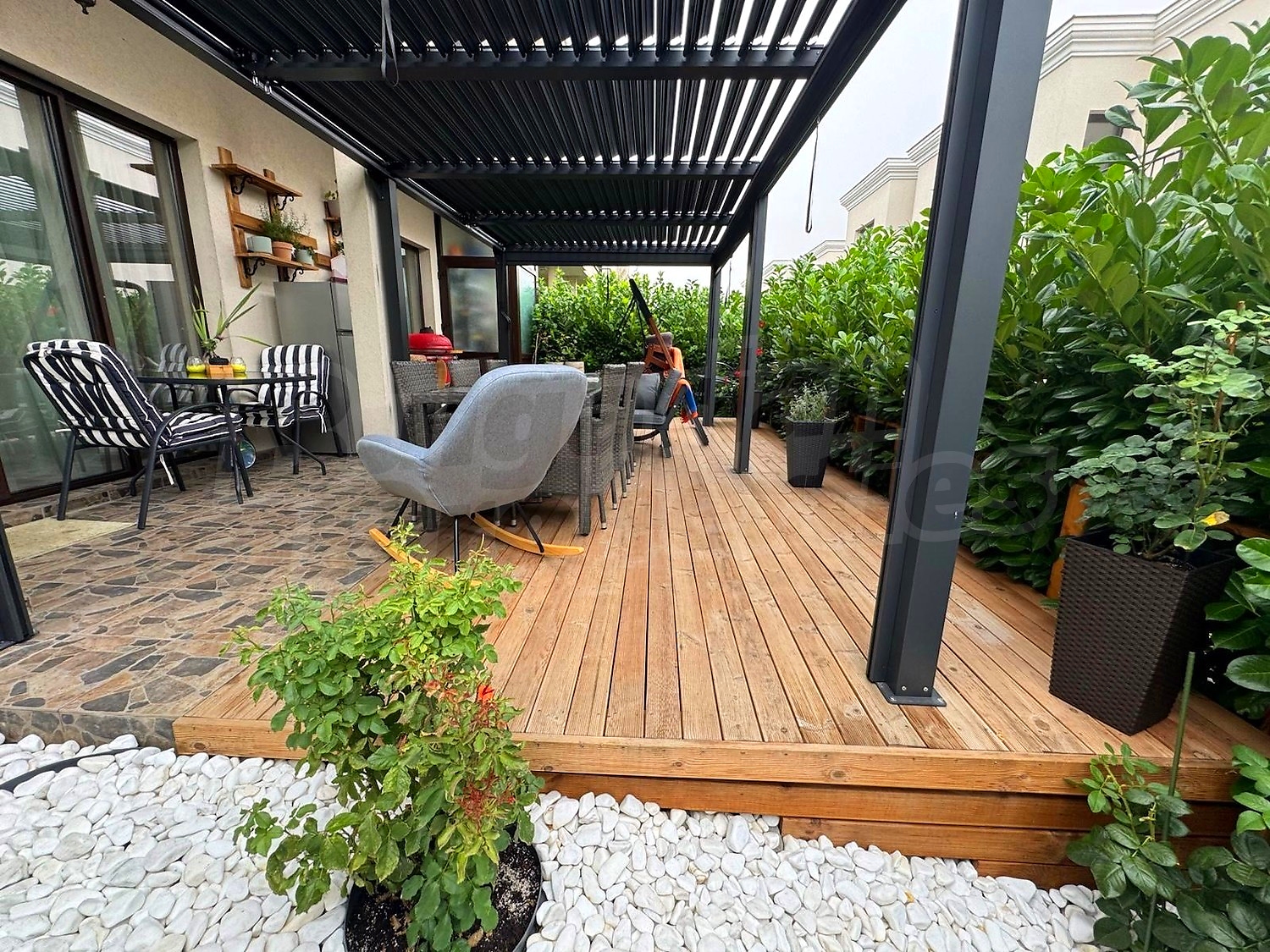 Сад отделан биоклиматической беседкой с настилом из натурального дерева и садовой мебелью + барбекю и дизайнерской мойкой, а также японским садом сбоку от настила, с натуральными камнями и освещением. В ландшафтном дизайне использован лавр + арка с розами и другими видами растений.