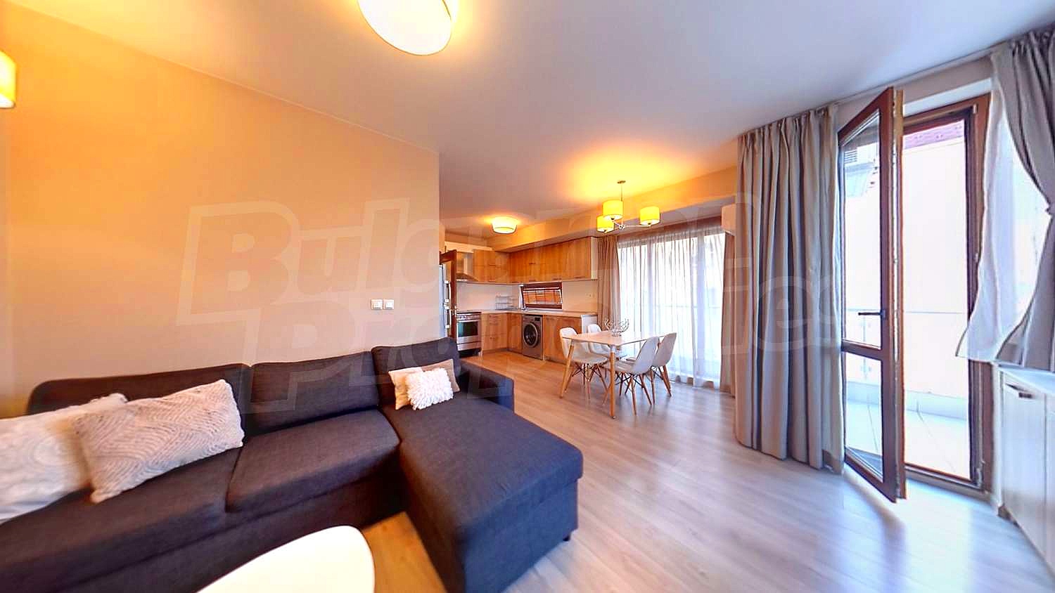 Квартира предлагает просторную гостиную с большими окнами и выходом на балкон, откуда открывается вид на город и горы Витоша. Солнечная гостиная обставлена удобным диваном, обеденным столом и стильными шкафами в теплых древесных тонах. Кухня полностью оборудована бытовой техникой - духовкой, варочной панелью, вытяжкой, стиральной машиной, холодильником - и множеством шкафов для хранения. Практичный ѝ дизайн в светлых древесных тонах создает ощущение простора и легкости. Спальня светлая и уютная, с большим шкафом, рабочим столом и кроватью в классическом стиле. Мягкие цвета и обилие естественного света делают ее прекрасным местом для отдыха.