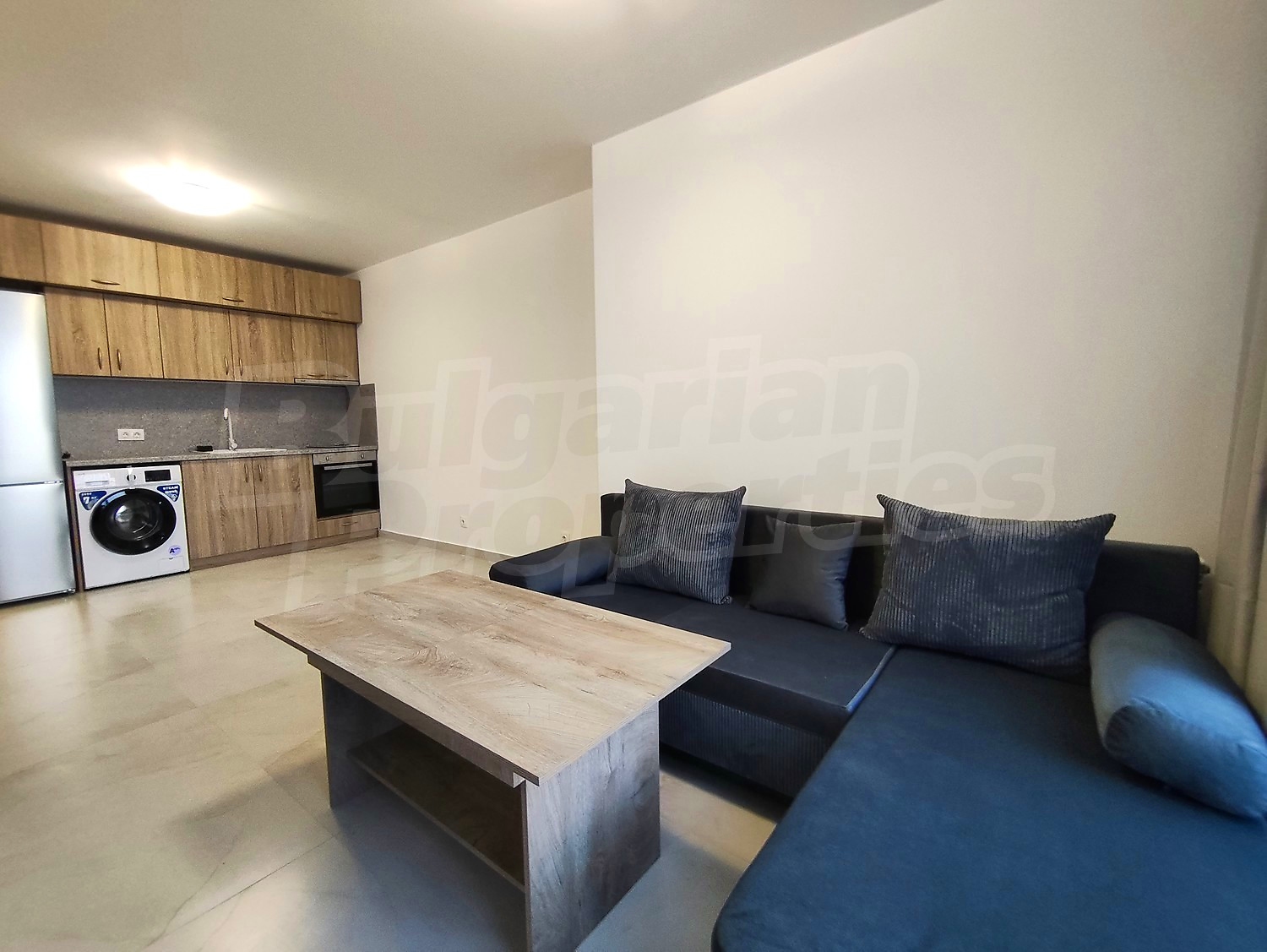 Общая площадь квартиры составляет 66 кв.м. Планировка включает прихожую, светлую гостиную с кухонной зоной, отдельную спальню, ванную комнату с туалетом и террасу. Квартира полностью меблирована новой мебелью и оборудована современной бытовой техникой.