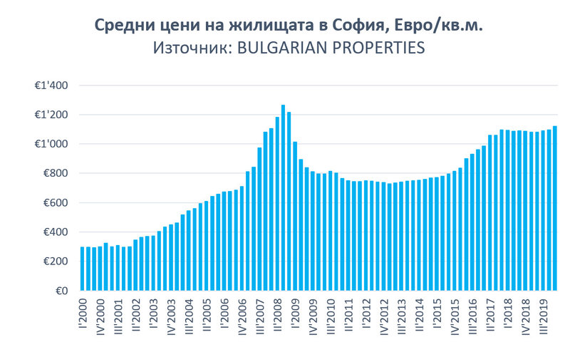 През първото тримесечие на 2020 г. ценовите ръстове се ускориха, а средната цена в София подмина границата от 1100 евро/кв.м., около която гравитираше от края на 2017 г.