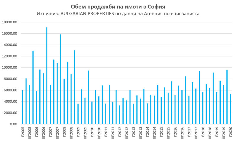 Според данните на Агенцията по вписванията през 1-вото тримесечие на 2020 г. в София са вписани 5 285 имотни продажби при 5 641 за същия период на 2019 г., което е спад с около 6.3% на годишна база. Това са данни за нотариално изповядани покупко-продажби, а не само за сключени през периода сделки. Този спад има обективни причини и се дължи на извънредното положение и специалния режим на работа на нотариусите, на невъзможността за явяване за нотариално изповядване и отлагането на сделки, както и на все още големия дял на новото строителство в продажбите в София - сделки, които ще бъдат вписвани при прехвърляне на собствеността.