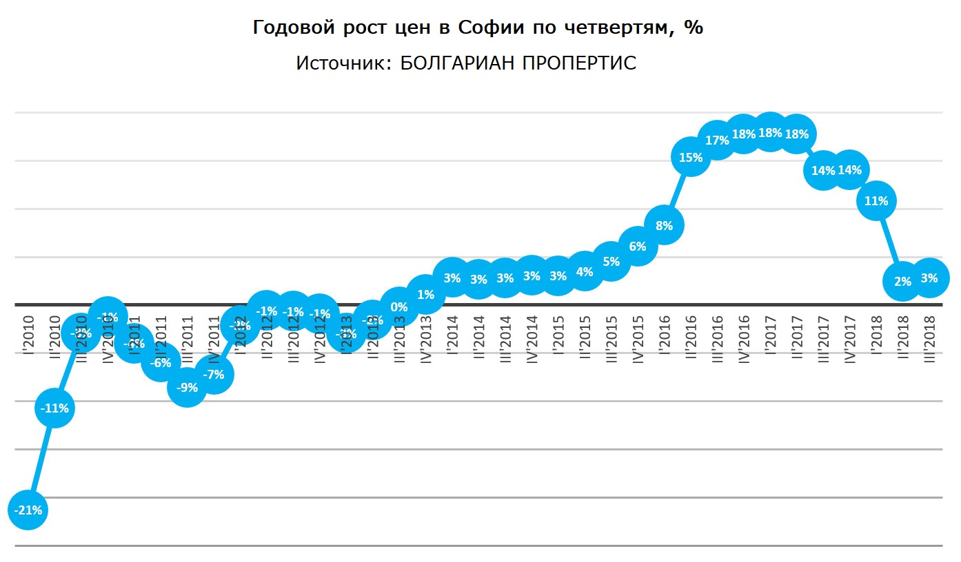 Данные БОЛГАРИАН ПРОПЕРТИС показывают, что в 2018 году цены в Софии сохранили уровни, достигнутые в конце 2017 года, и остаются неизменными в течение трех последних кварталов года.