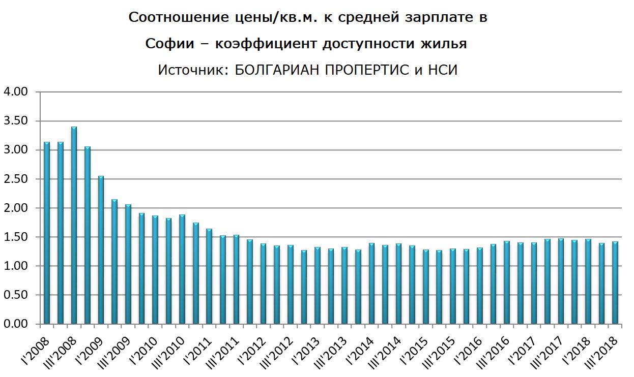 Это связано как с замедлением роста цен, так и с увеличением заработка, рост которого также замедляется и даже снижается в третьем квартале. Напомним, что это соотношение далеко от пикового значения коэффициента 10 лет назад (3.5) и показывает, что в целом свойства в Софии по меньшей мере вдвое больше, чем в 2008 году.