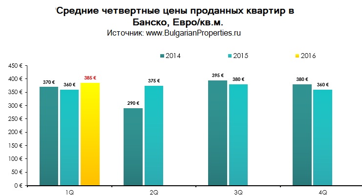 Средняя цена проданных квартир в Банско в первом квартале составляет 385 евро/кв.м., а средняя общая стоимость покупки составляет 25 000 евро. Цены на крупнейшем зимнем курорте страны отмечают рост по сравнению со средней стоимостью в 2015 году примерно на 5%.
