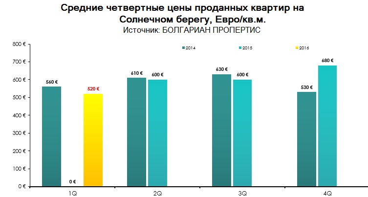 Средняя стоимость заключаемых сделок на Солнечном берегу - 520 евро/кв.м. – снижение до уровня около 600 евро/кв.м., отмечаемого в 2015 году. Общая стоимость покупки апартаментов на Солнечном берегу за последние месяцы - около 27 700 евро – и здесь заметно сокращение бюджетов с уровня около 35 000 евро.