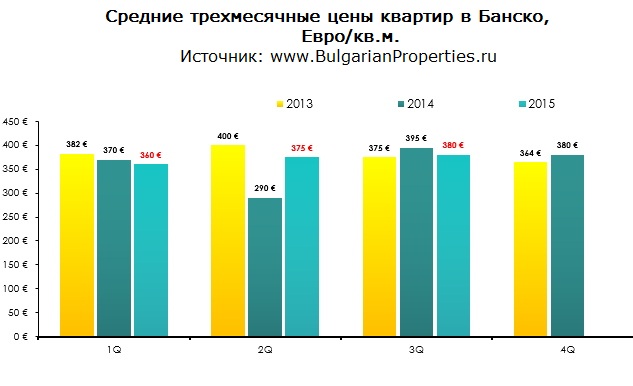 Средняя стоимость проданных квартир в Банско в третьем квартале - 380 евро/кв.м., а средняя общая закупочная цена - 26 000 евро (при 23 920 евро в предыдущем квартале).