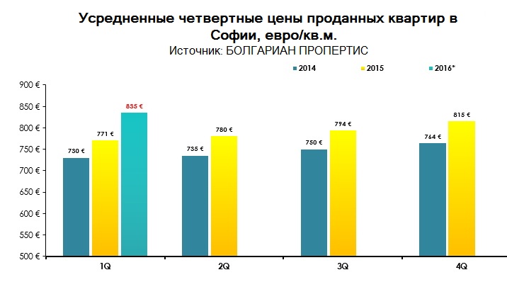 По данным БОЛГАРИАН ПРОПЕРТИС в 1-м квартале 2016 года средняя стоимость проданных квартир в Софии составляет 835 евро/кв.м.