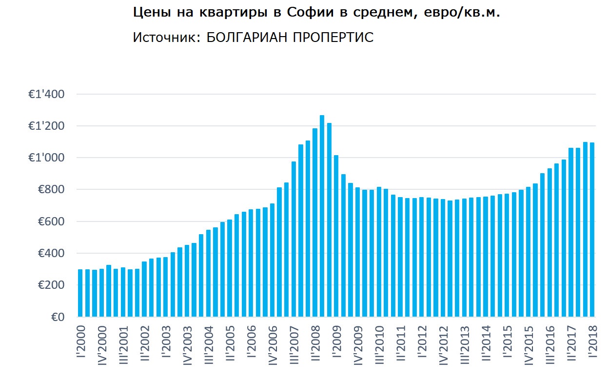 Средняя цена квартир в Софии в первые месяцы года составила 1 092 евро / кв.м. на 1 095 евро / кв.м. в конце 2017 года. Похоже, что после скоростного пересечения границ 900 и 1000 евро / кв.м цены не торопятся пересечь следующую отметку в 1100 евро.
