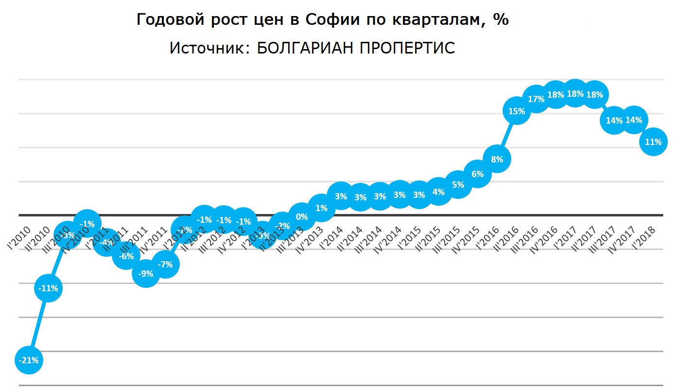 Уже в первые месяцы года рынок жилья в Софии улучшается в результате увеличения числа предложений, что привело к замедлению роста цен в Софии до 10%, ожидаемых в 2018 году. Рынок в столице продолжает активно развиваться, и в этом году он снова станет одним из самых привлекательных для инвестиций.