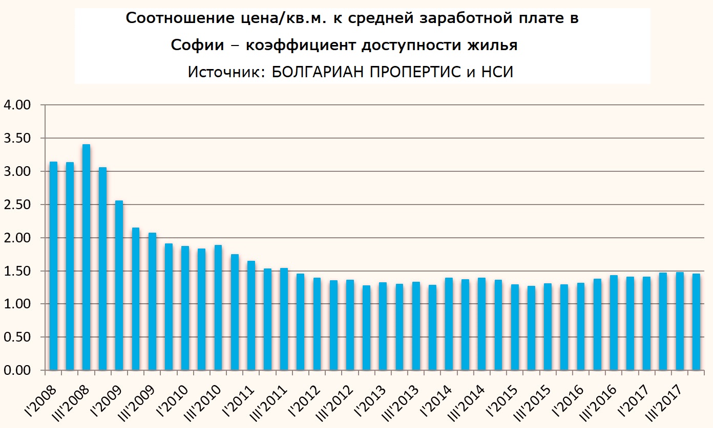 Индекс цен в Софии (соотношение цены жилья на кв.м. к средней зарплате в столице) составляет 1.45 в конце 2017 года и находится на хорошем уровне. Заметно небольшое улучшение по сравнению с осенью 2017 года, когда показатель составил 1.48, так как и при повышении цен на недвижимость вырос доход (на 10.4% в 2017 году по данным Национальной статистики), и соотношение остается относительно стабильным и далеким от значений предыдущего бума, когда он достиг почти 3.5.