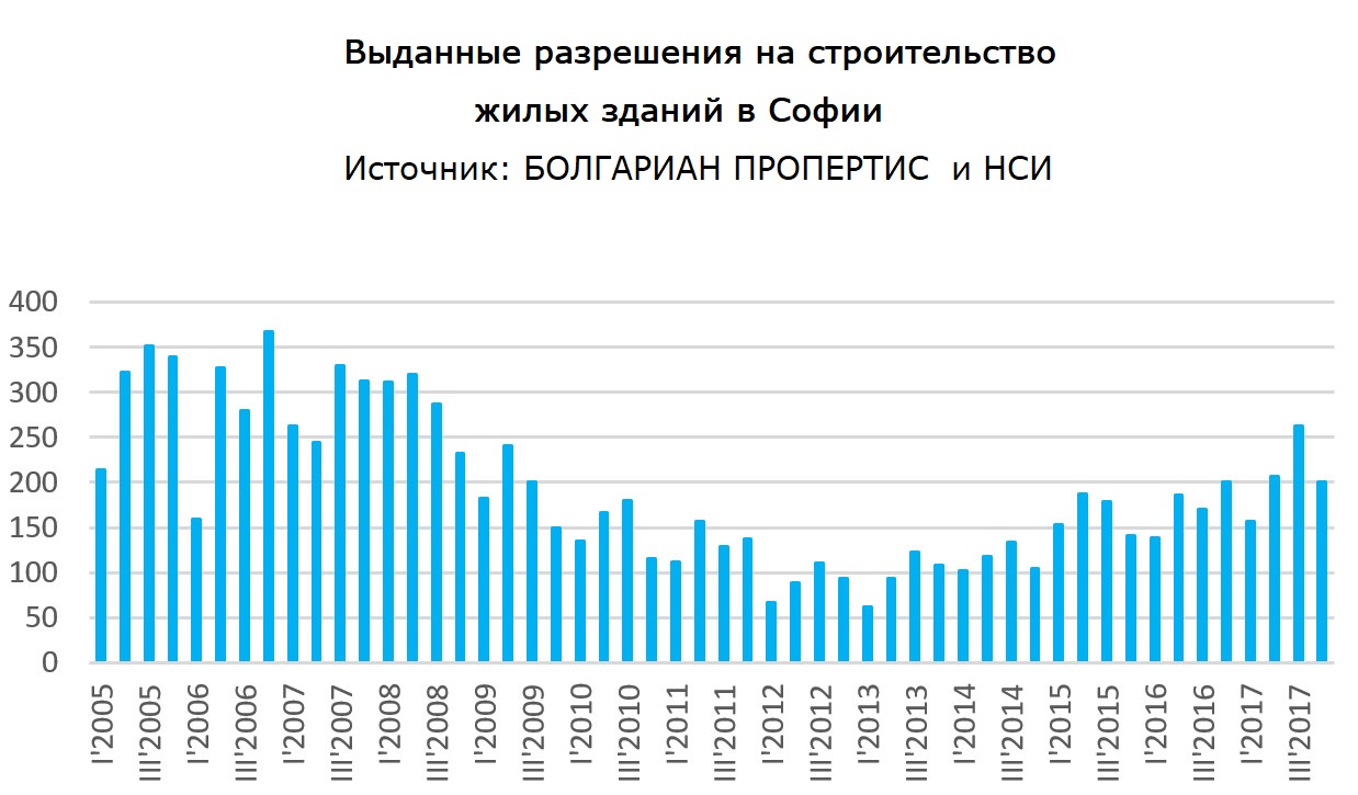 Новые разрешения на строительство, выданные в Софии по данным Национальной статистики составляют 201 год в 4-м квартале 2017 года. Таким образом, 2017 год завершился 827 выданными разрешениями на строительство новых жилых зданий в столице по сравнению с 695 за 2016 год, рост составил 19 %.