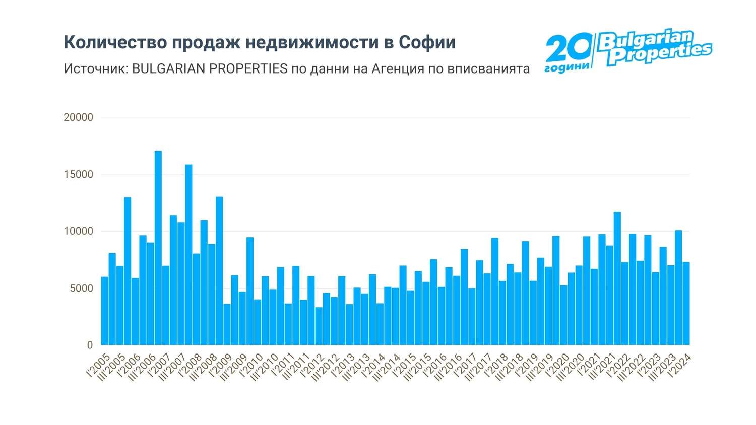 Было зарегистрировано 7298 сделок с недвижимостью по сравнению с 6381 в 2023 году. Это зафиксировало рост на 14,4% в годовом исчислении, что является одним из самых больших приростов сделок в Софии, а с точки зрения объема, относит этот квартал к самым сильным первым кварталам для рынка недвижимости.