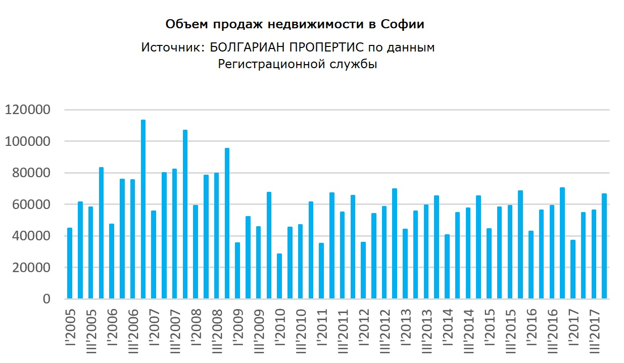 В течение всего 2017 года в столице было зарегистрировано 28 175 продаж, при 26 480 в 2016 году, что показывает годовой рост продаж в Софии в размере 6.4%.