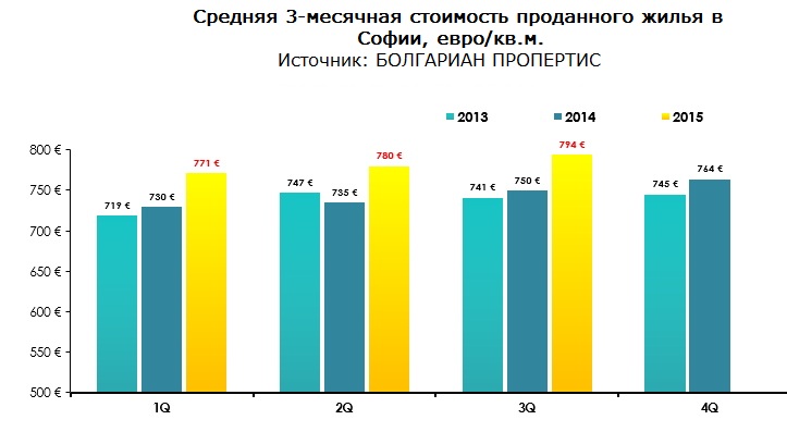 «С января по сентябрь этого года средняя цена квадратного метра в Софии составила 781 евро, а в этом же периоде прошлого года она была 738 евро. По данным Регистрационной службы на основании вычислений БОЛГАРИАН ПРОПЕРТИС, за первые девять месяцев этого года количество сделок с жилой недвижимостью в столице Болгарии увеличилось на 20% по сравнению с этим же периодом прошлого года. Таким образом, к концу одного довольно динамичного для рынка недвижимости в Софии года появилась ясная картина результатов его итога, а именно – рост цен составит около 6%, а количество сделок купли-продажи увеличится на 20-30%»,— заявила исполнительный директор БОЛГАРИАН ПРОПЕРТИС Полина Стойкова MRICS.