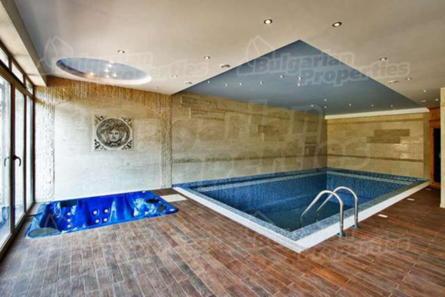 На этом этаже расположена просторная гостиная со столовой, встроенная итальянская кухня фирмы “Scavolini” с барной стойкой и бытовой техникой „Siemens”. Везде установлены французские окна, которые обеспечивают солнечный свет и настроение. Потолок навесной с встроенным осветлением. Массивные колонны из мрамора также дополняют интерьер дома. Стены окрашены латексом, на полу азиатский паркет из мербо, а кафель - фирмы „Versace”. Из гостиной можно пройти к большому внутреннему бассейну и джакузи. Есть отдельное помещение для сауны, ванной и туалета. Имеется спальня для гостей и предусмотрена комната для библиотеки.