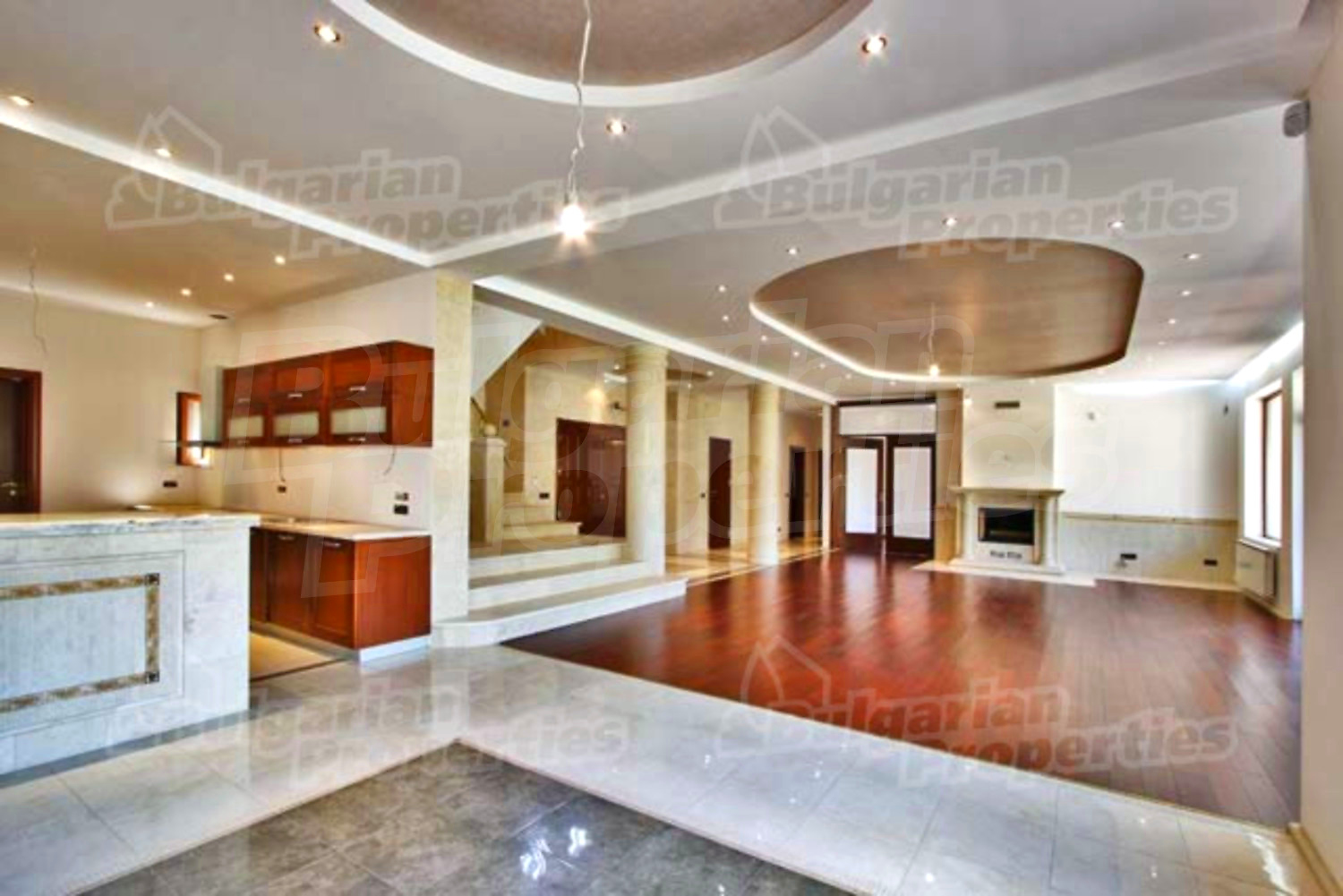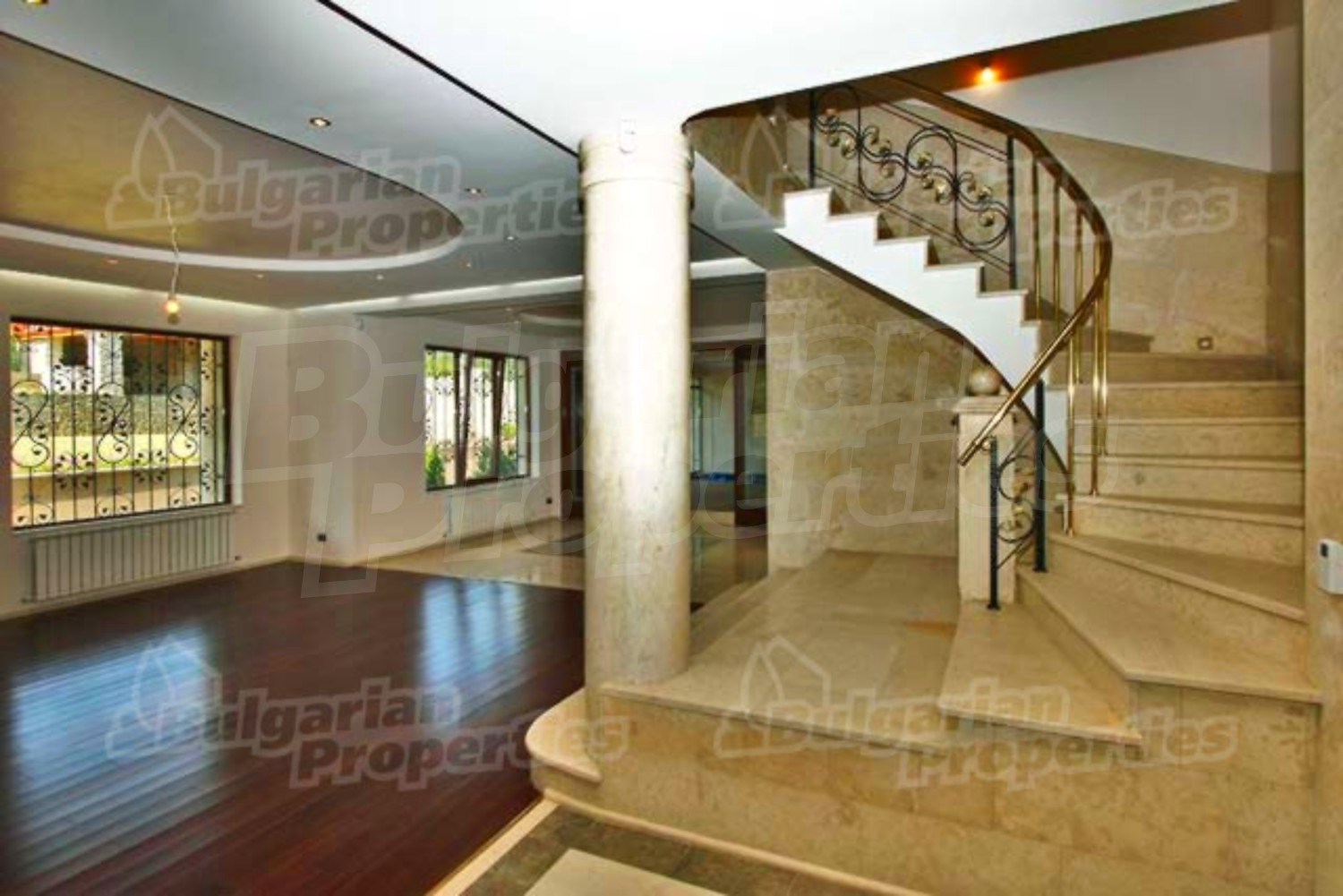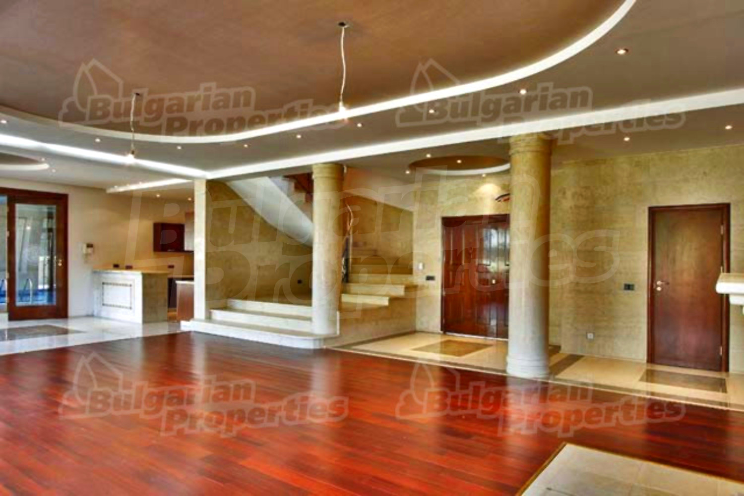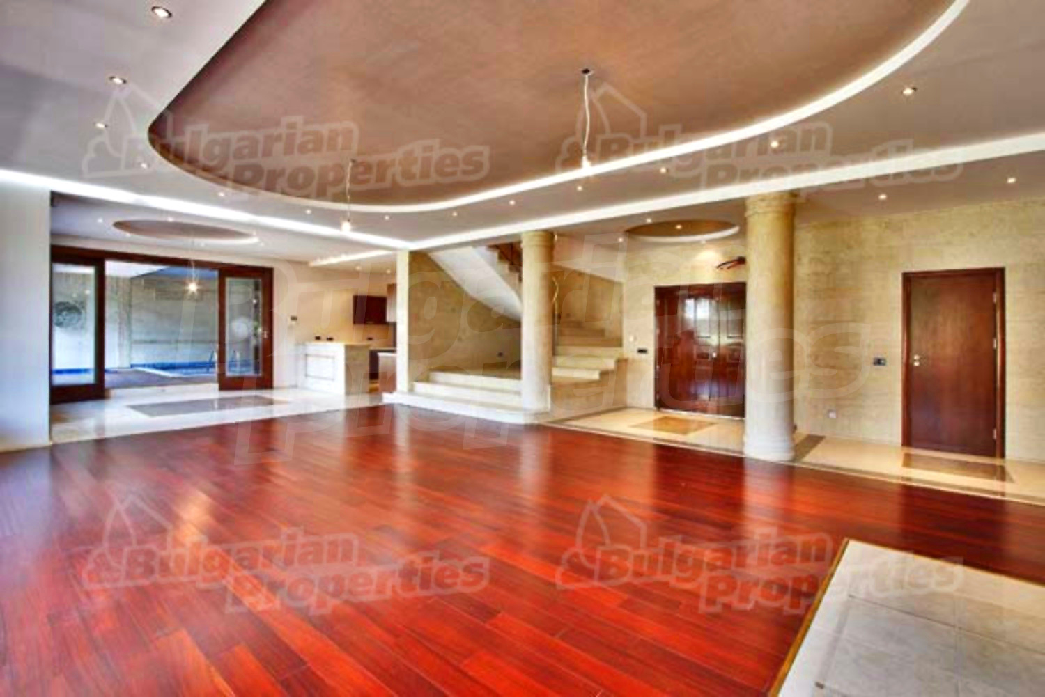 На этом этаже расположена просторная гостиная со столовой, встроенная итальянская кухня фирмы “Scavolini” с барной стойкой и бытовой техникой „Siemens”. Везде установлены французские окна, которые обеспечивают солнечный свет и настроение. Потолок навесной с встроенным осветлением. Массивные колонны из мрамора также дополняют интерьер дома. Стены окрашены латексом, на полу азиатский паркет из мербо, а кафель - фирмы „Versace”. Из гостиной можно пройти к большому внутреннему бассейну и джакузи. Есть отдельное помещение для сауны, ванной и туалета. Имеется спальня для гостей и предусмотрена комната для библиотеки.