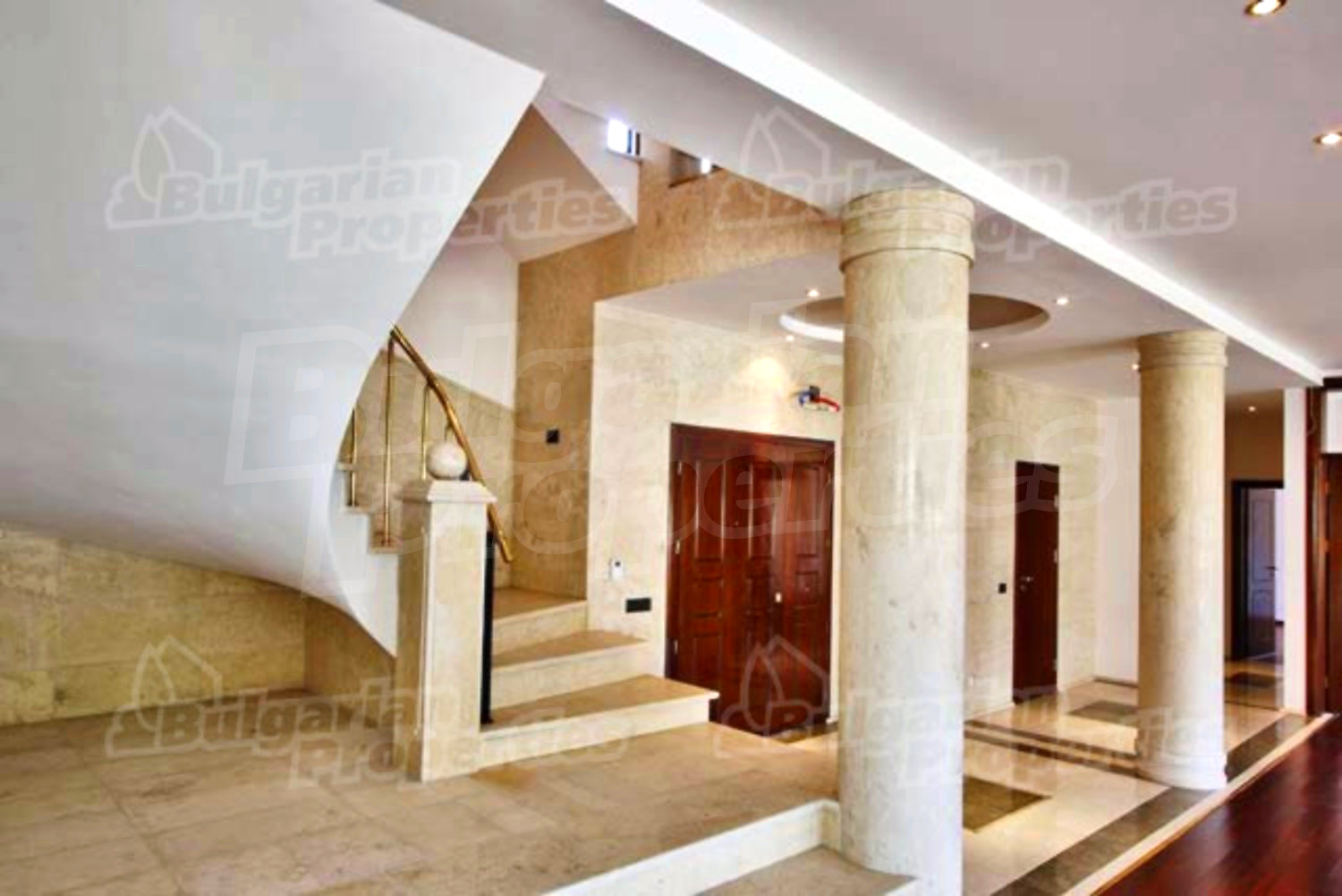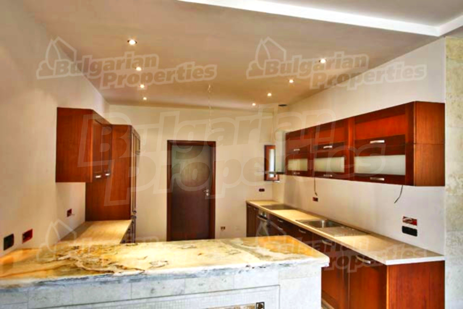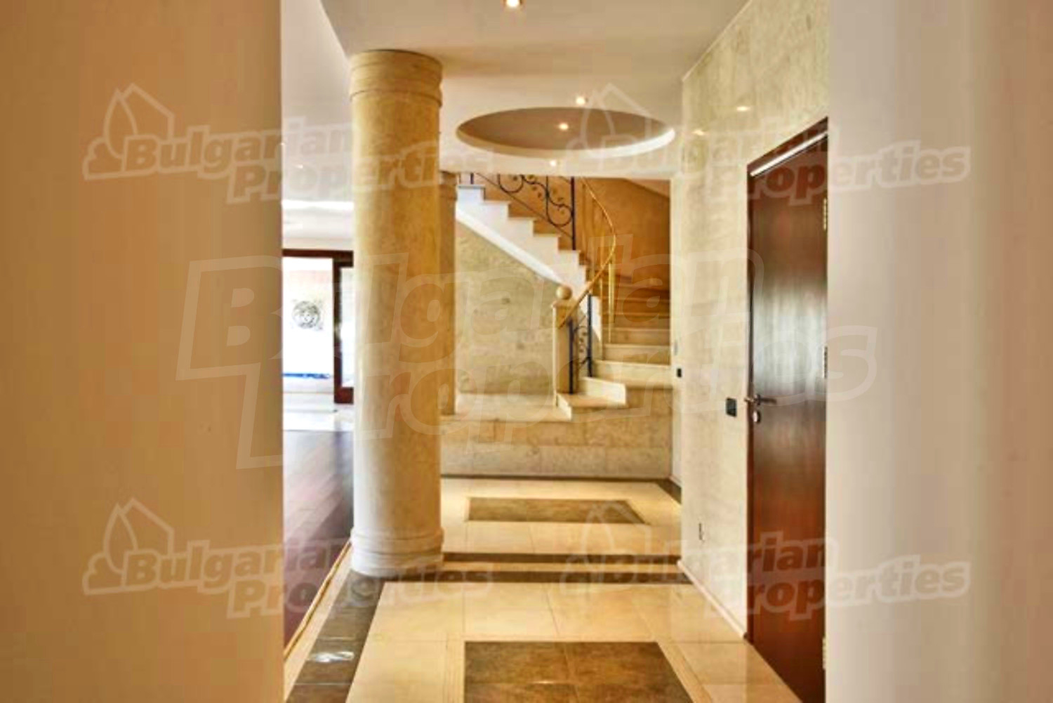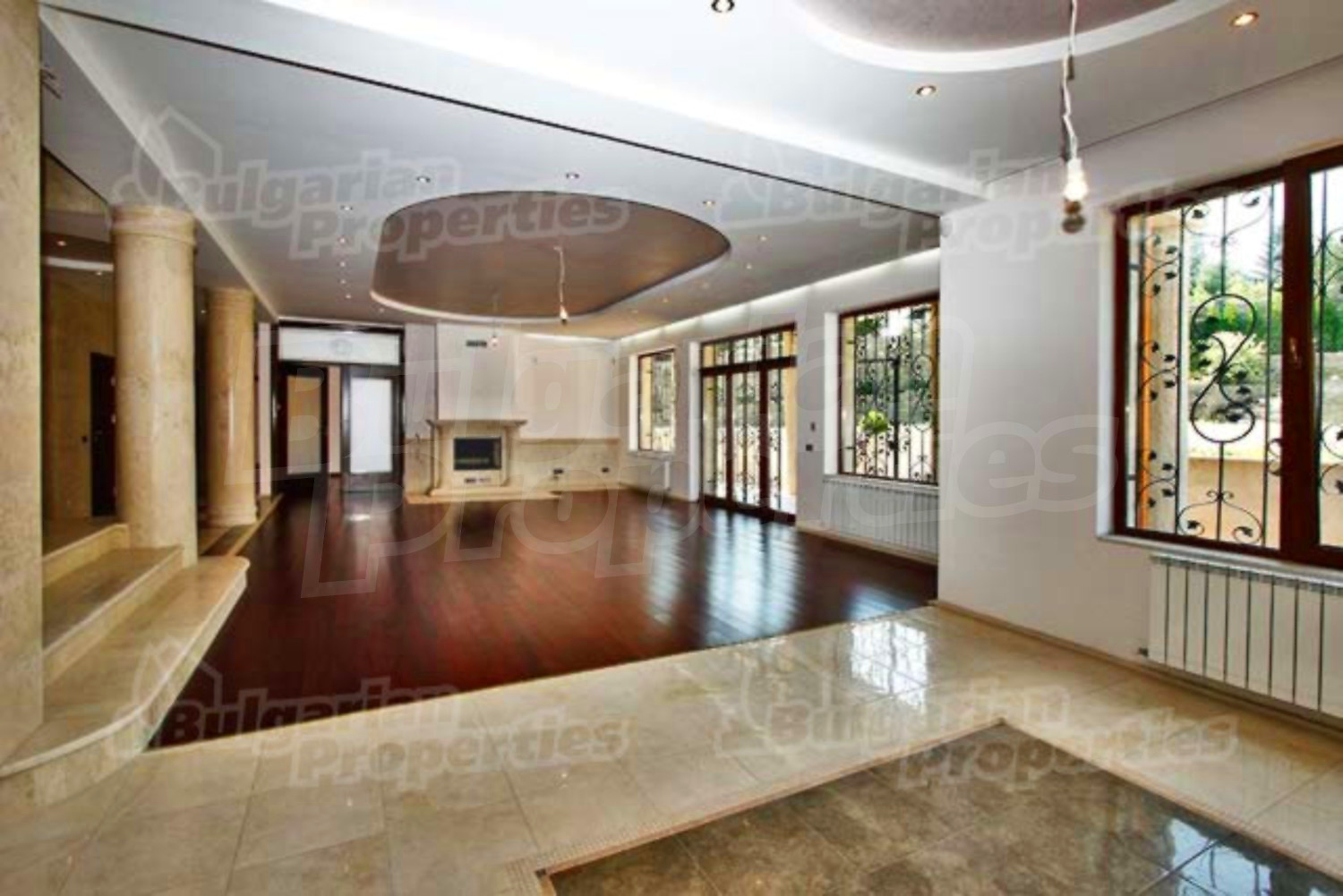 На этом этаже расположена просторная гостиная со столовой, встроенная итальянская кухня фирмы “Scavolini” с барной стойкой и бытовой техникой „Siemens”. Везде установлены французские окна, которые обеспечивают солнечный свет и настроение. Потолок навесной с встроенным осветлением. Массивные колонны из мрамора также дополняют интерьер дома. Стены окрашены латексом, на полу азиатский паркет из мербо, а кафель - фирмы „Versace”. Из гостиной можно пройти к большому внутреннему бассейну и джакузи. Есть отдельное помещение для сауны, ванной и туалета. Имеется спальня для гостей и предусмотрена комната для библиотеки.