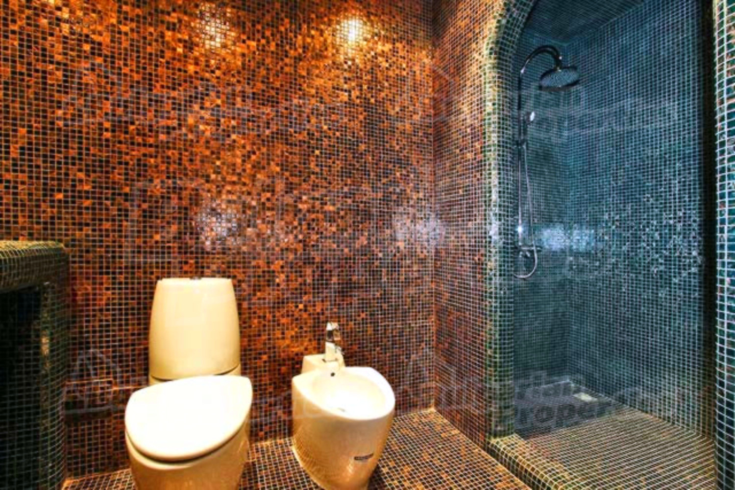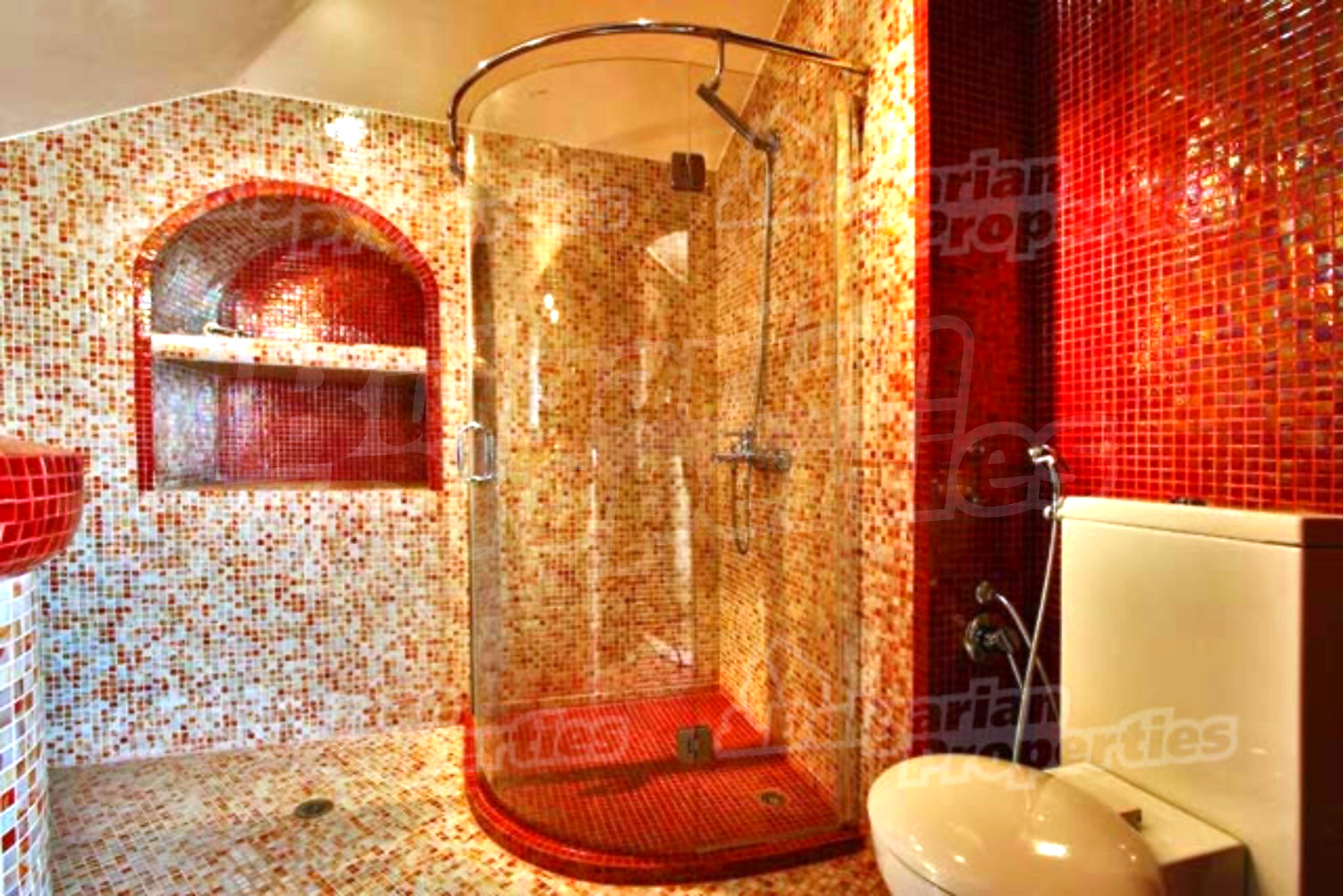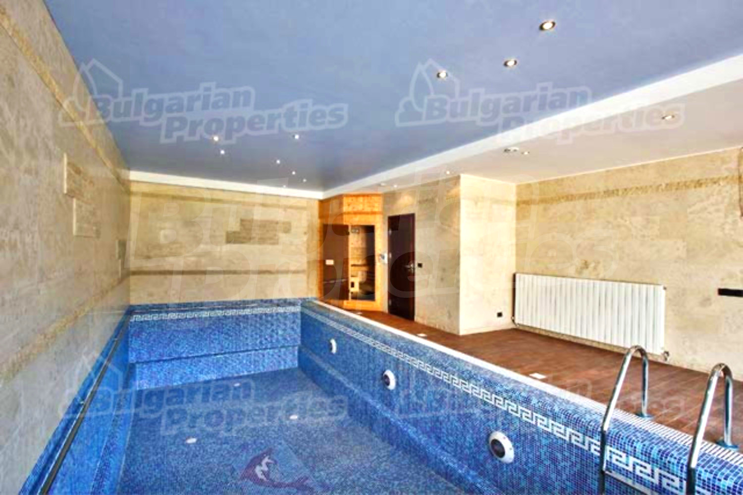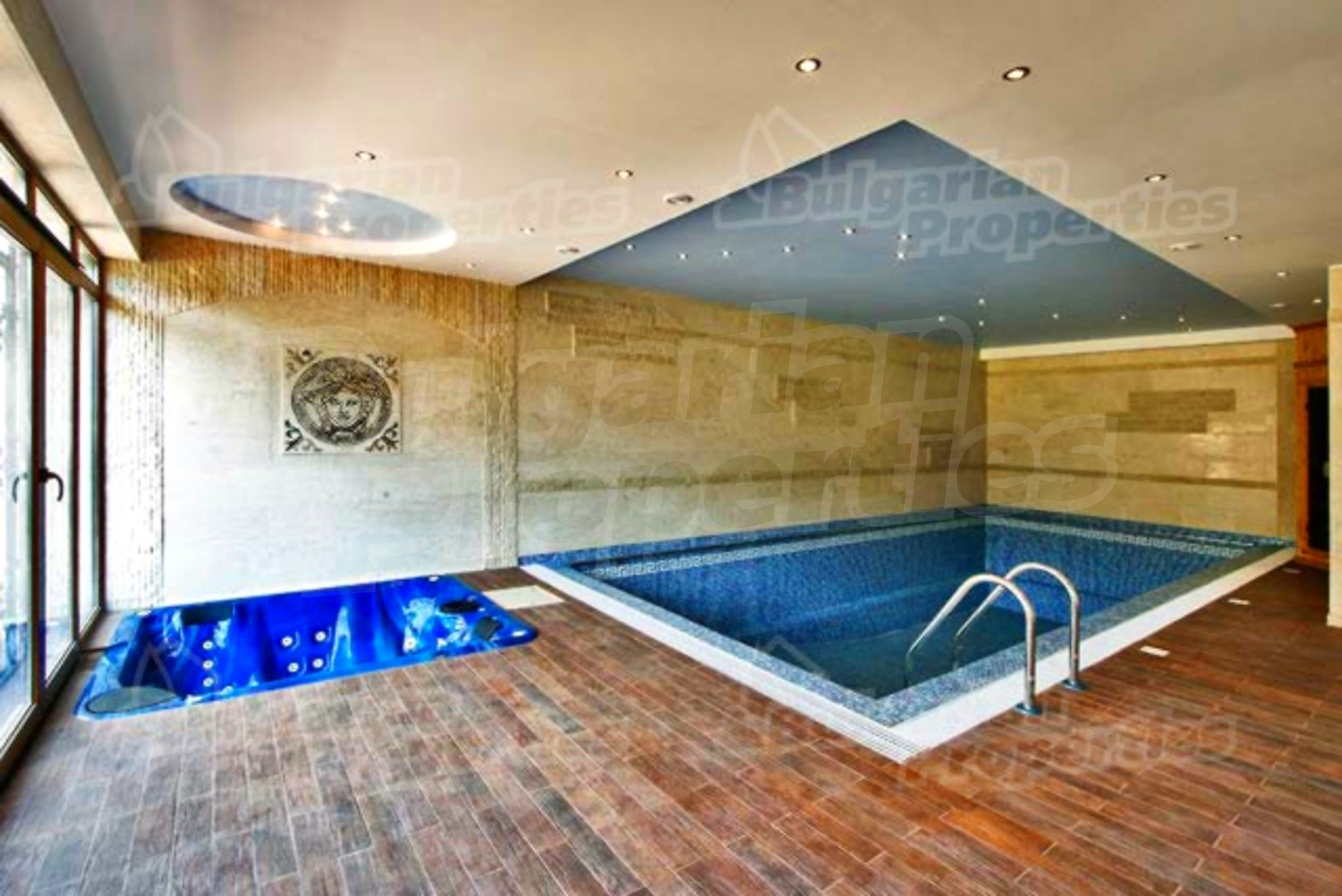 На этом этаже расположена просторная гостиная со столовой, встроенная итальянская кухня фирмы “Scavolini” с барной стойкой и бытовой техникой „Siemens”. Везде установлены французские окна, которые обеспечивают солнечный свет и настроение. Потолок навесной с встроенным осветлением. Массивные колонны из мрамора также дополняют интерьер дома. Стены окрашены латексом, на полу азиатский паркет из мербо, а кафель - фирмы „Versace”. Из гостиной можно пройти к большому внутреннему бассейну и джакузи. Есть отдельное помещение для сауны, ванной и туалета. Имеется спальня для гостей и предусмотрена комната для библиотеки.