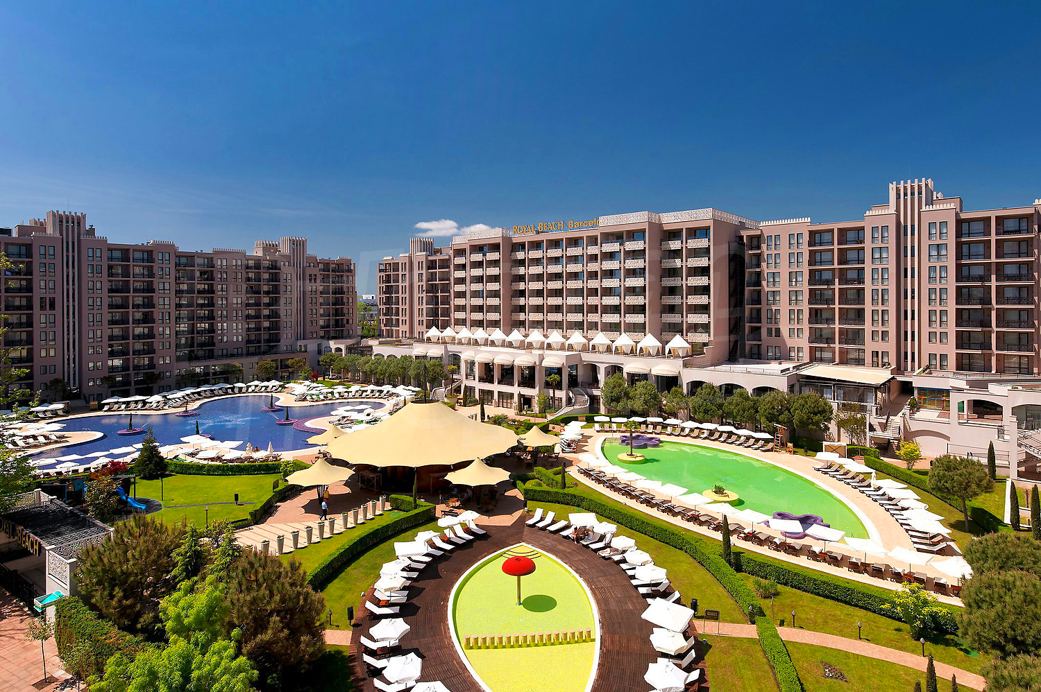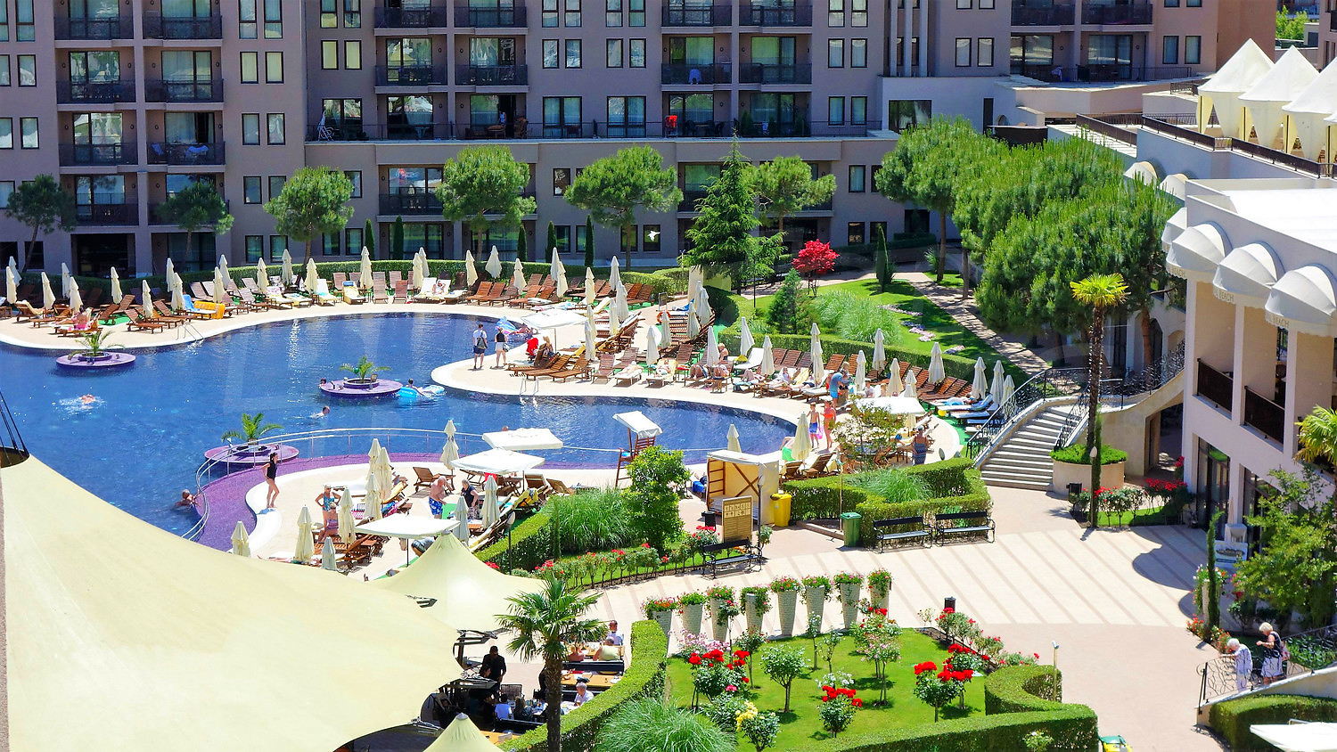 В этом новом комплексе расположены пятизвездочный отель с 143 номерами, 6 здании с 504 апартаментами, детская площадка и сад на площади 9000 кв.м. Множество возможностей для развлечений сделают Ваш отдых незабываемым: 6 ресторанов и кондитерские, пиано-бар и лобби-бар. Комплекс «Royal Beach» отличается интересной архитектурой и уровнем пять звезд, которые делают его самым желанным местом на Солнечном берегу.