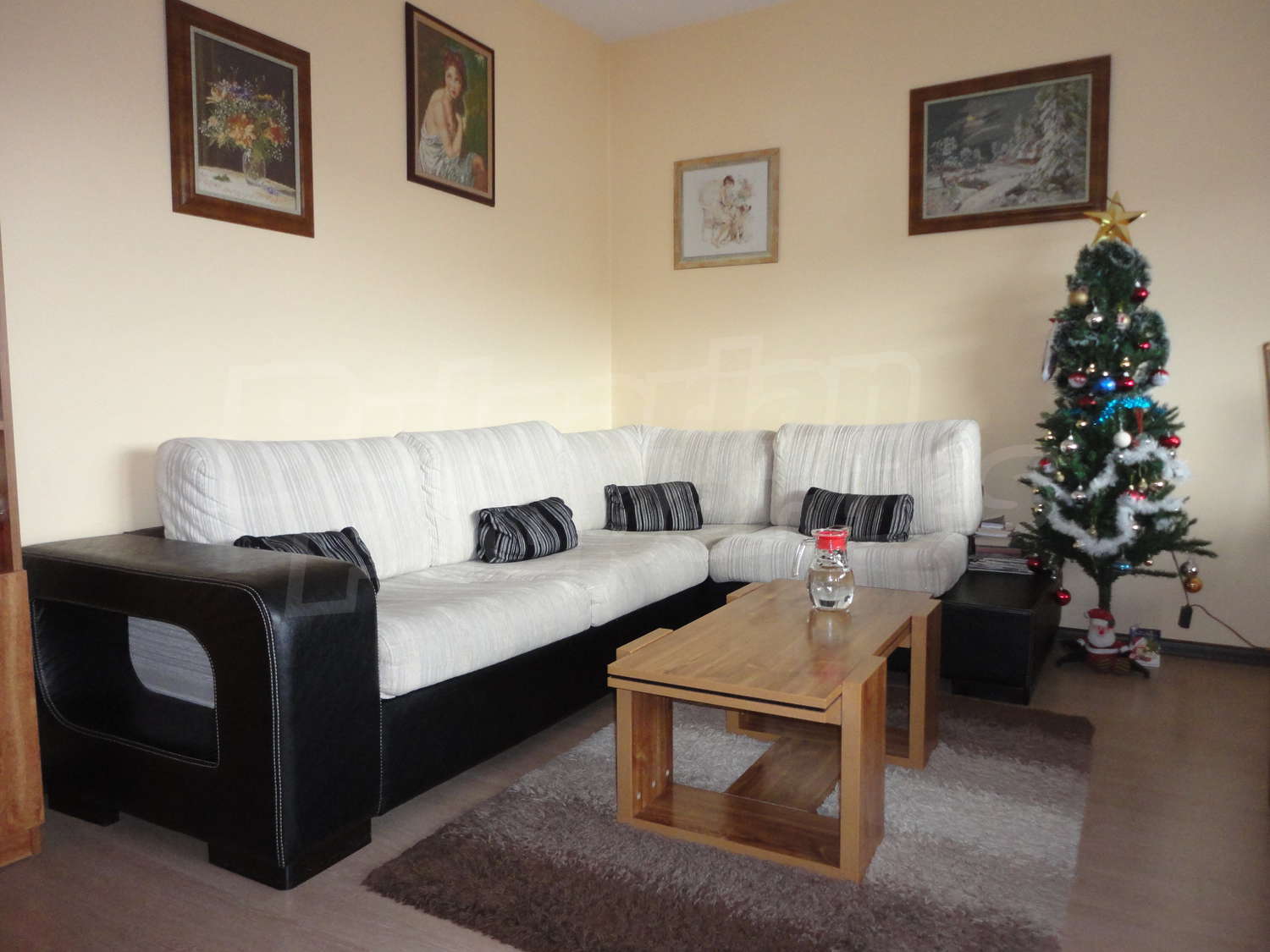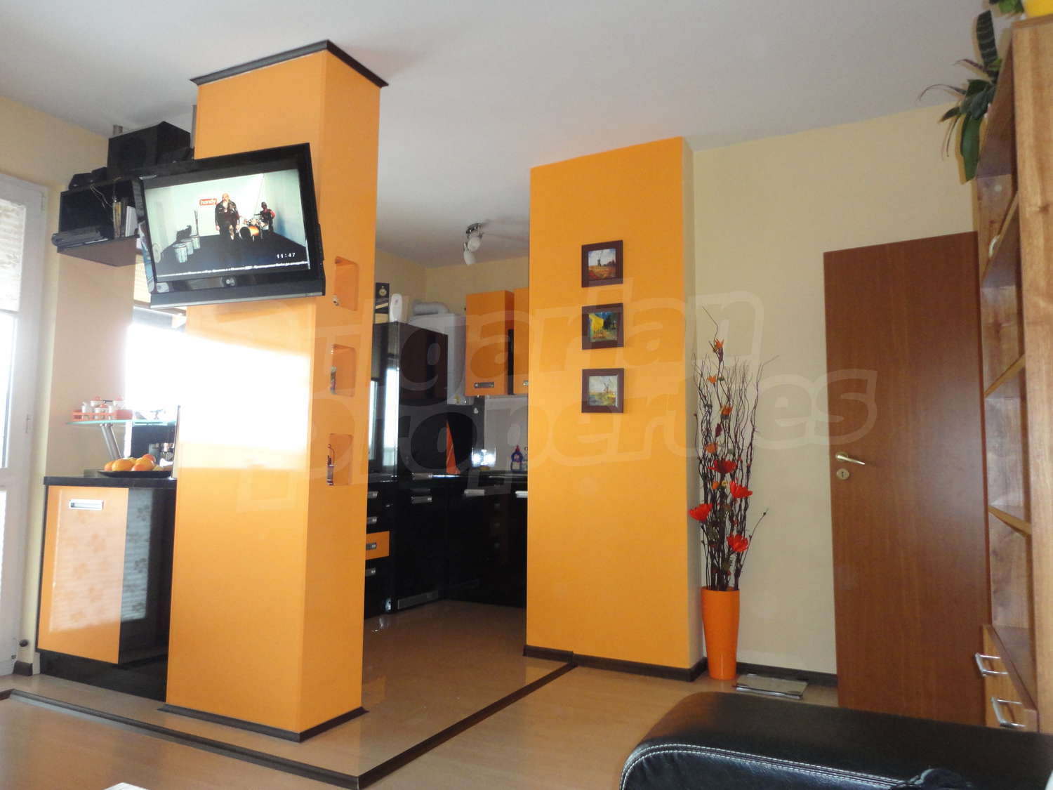 В квартире есть коридор, просторная и светлая гостиная с кухней, две спальни, гостевая комната с кухней, ванная комната с туалетом и большая терраса окружающая всю квартиру. Стены во всех комнатах окрашены латексом, полы покрыты ламинатом, а окна ПВХ.