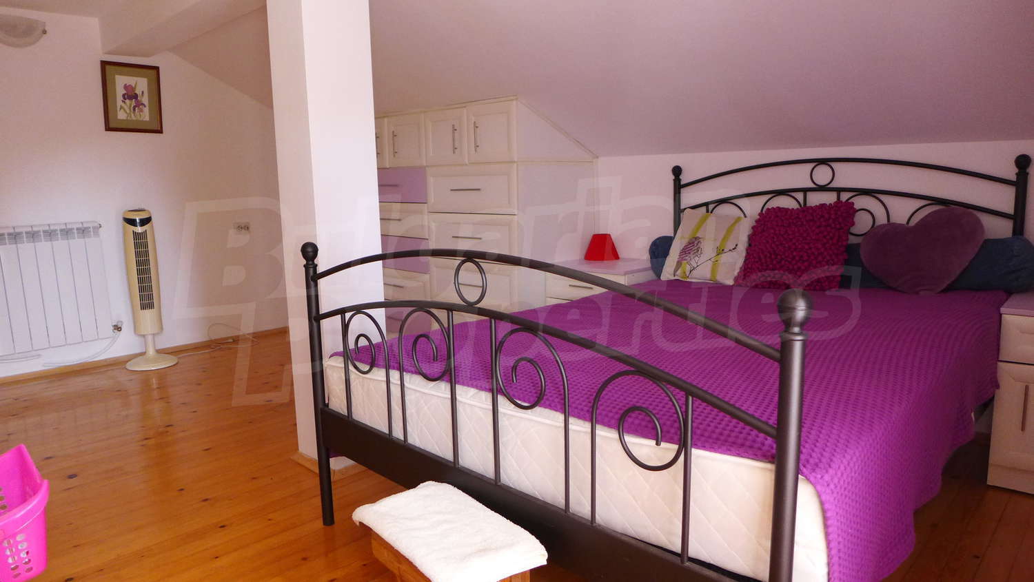 Второй этаж: Внутренняя лестница ведет к нему. Здесь есть коридор, 3 спальни, туалет / ванная комната и терраса. Стены латекс, пол деревянный, окна деревянные. Установлены радиаторы.