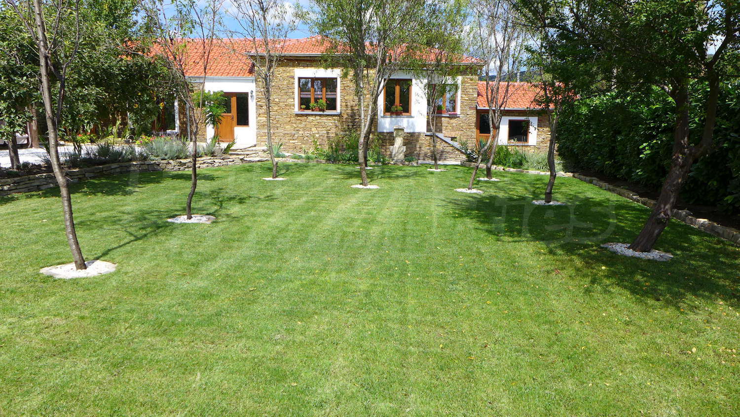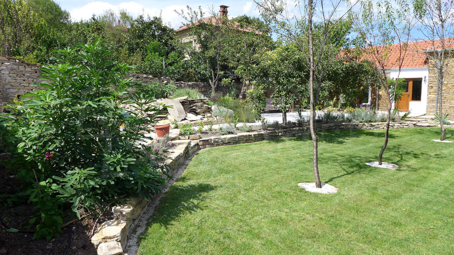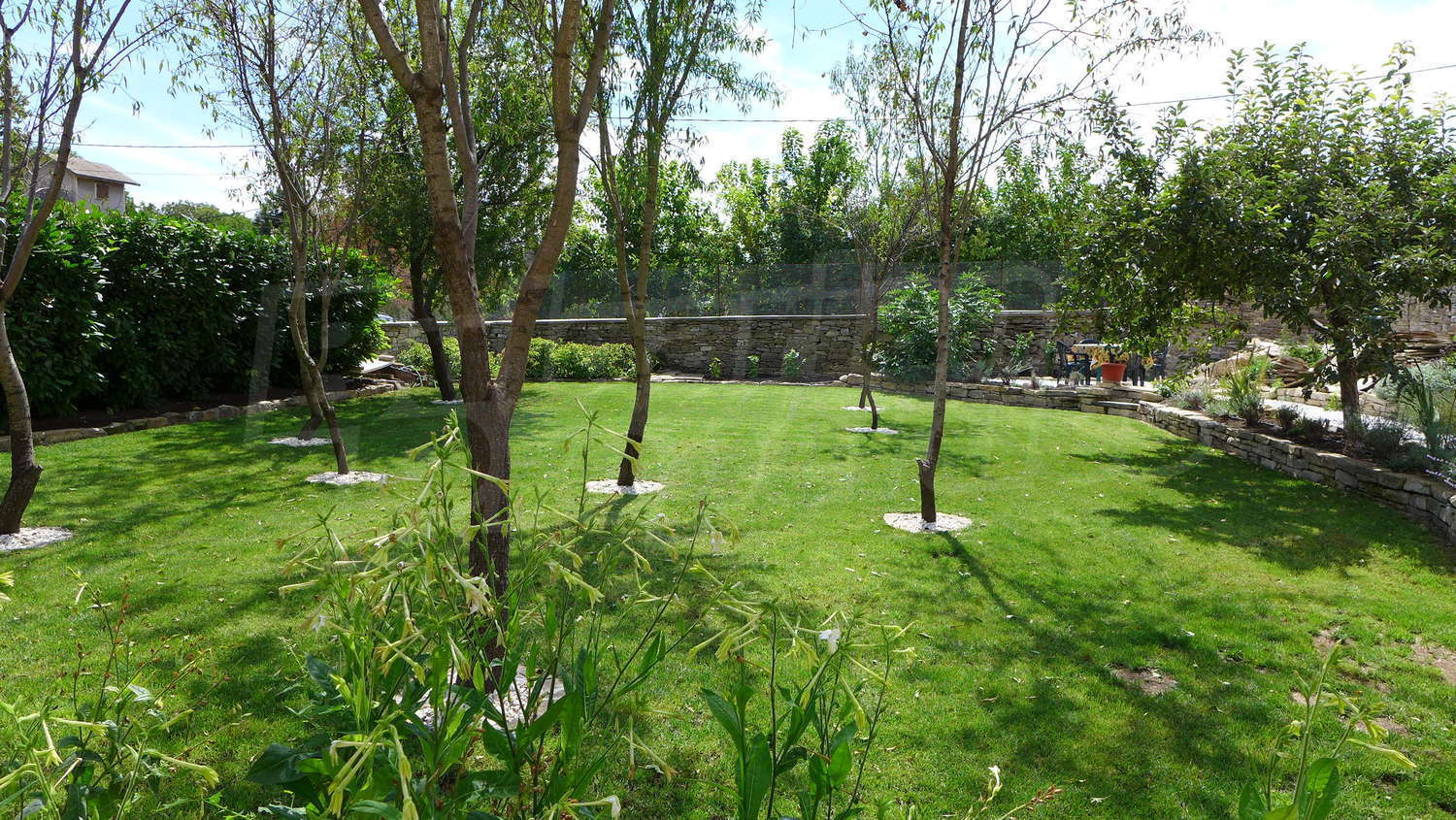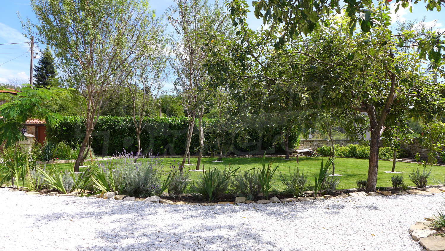 Сад хорошо ухоженный. В настоящее время здесь высажены миндаль, фруктовые деревья, фиговые деревья, виноградная лоза и декоративные кустарники. Есть система полива с капельным орошением.