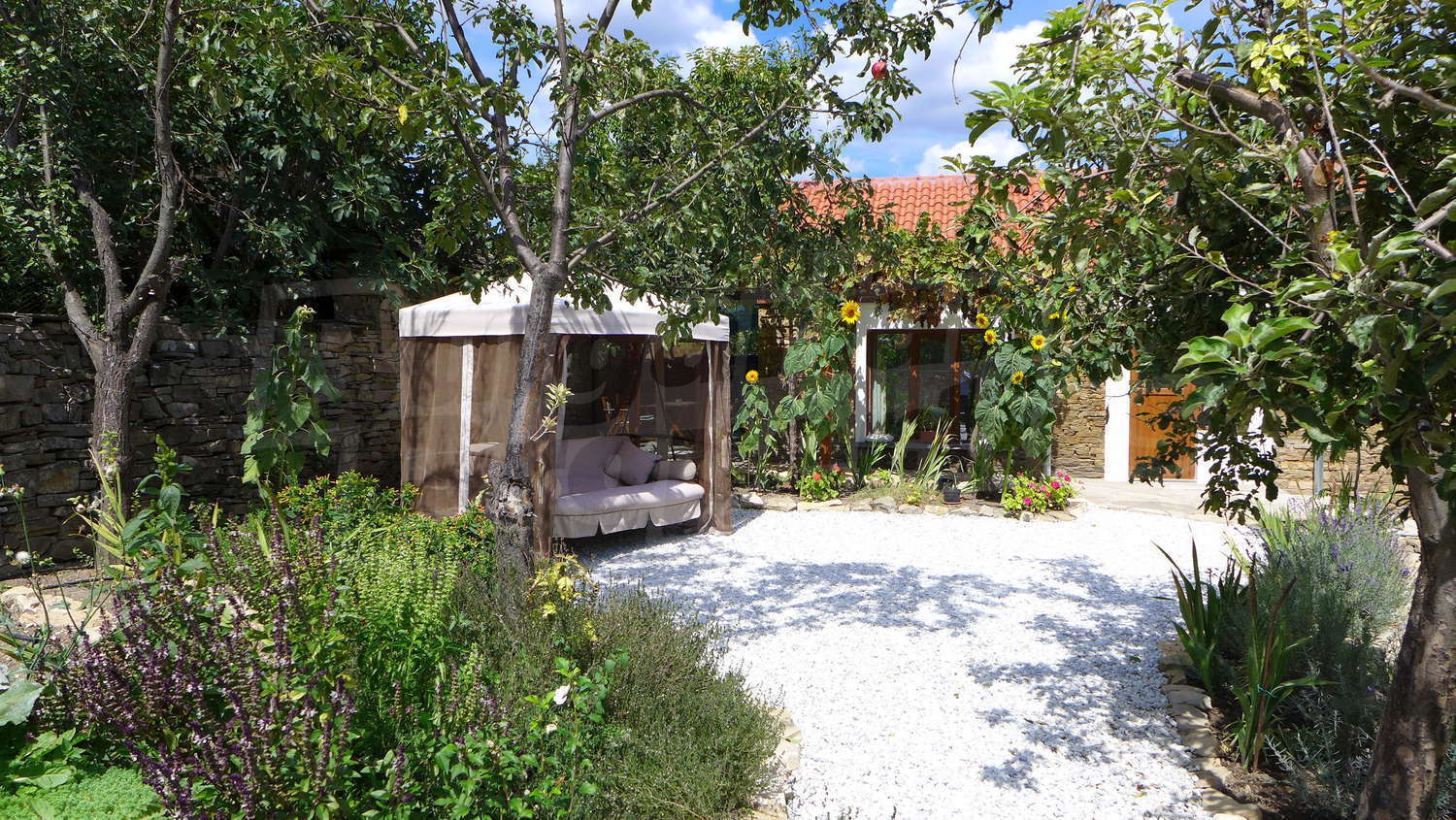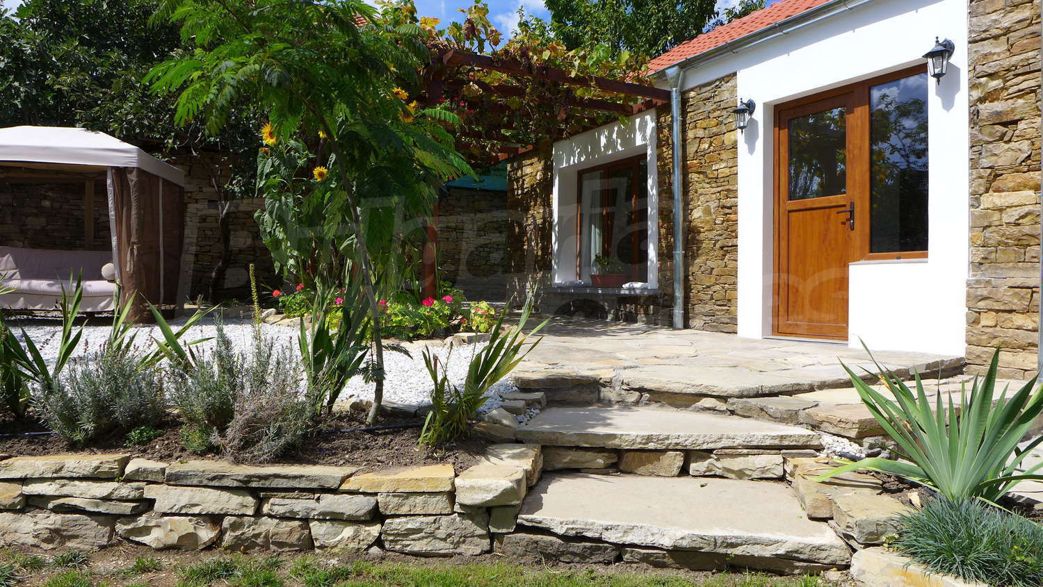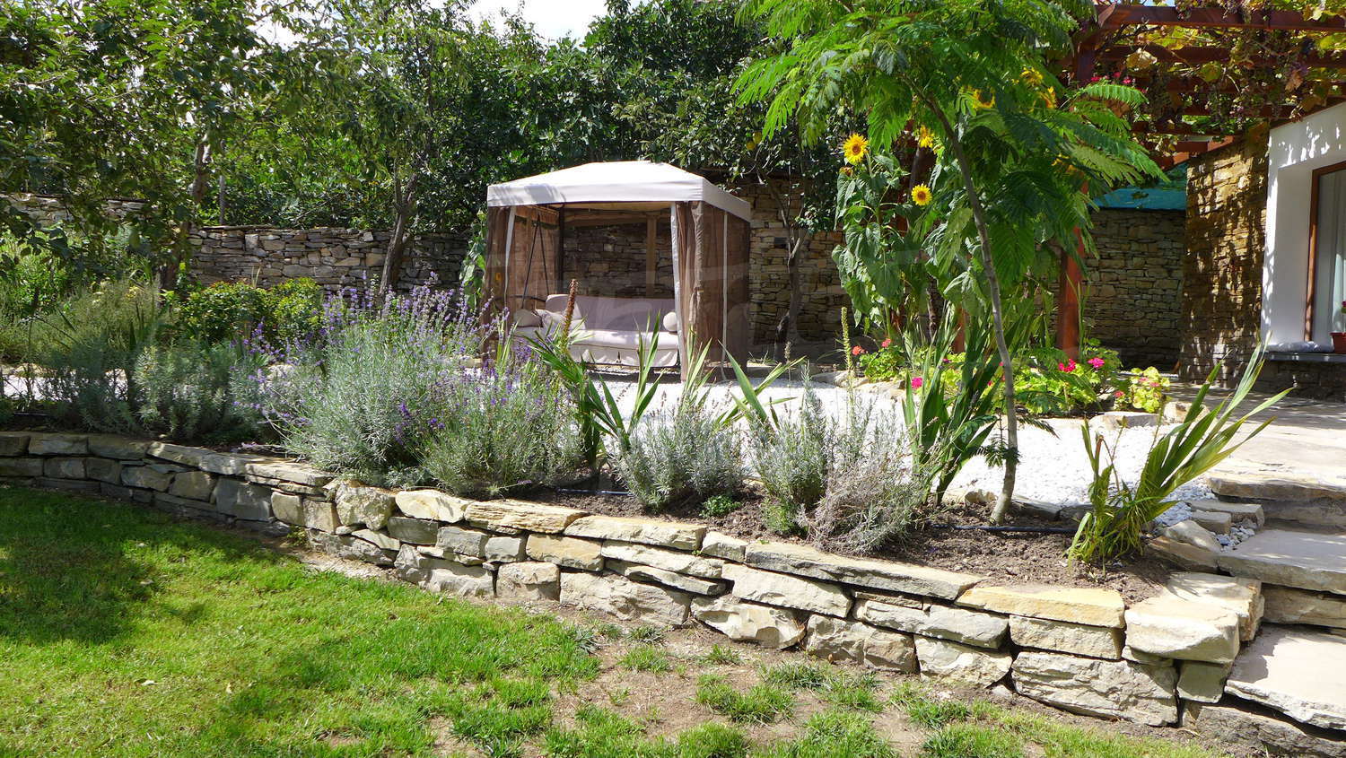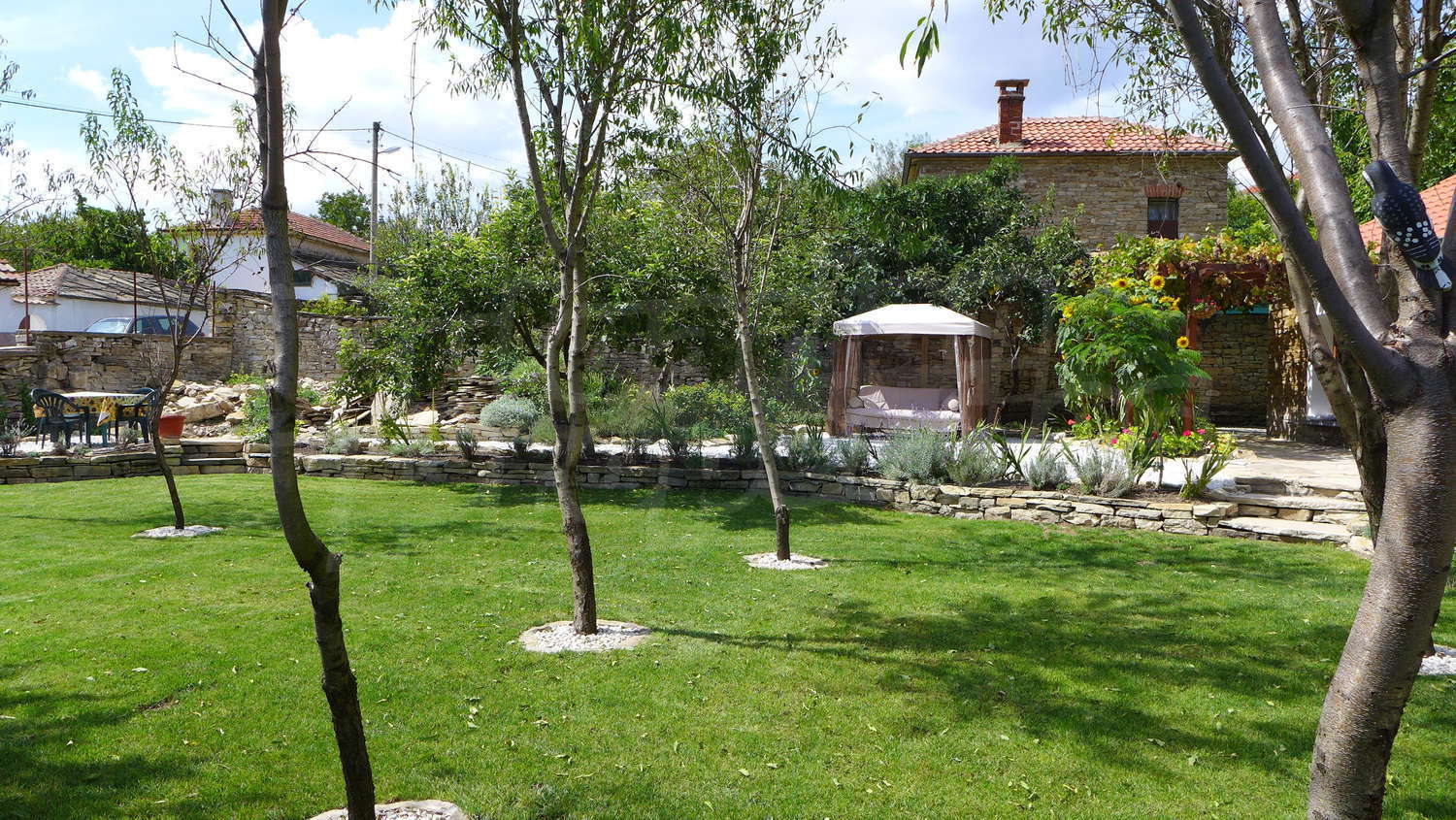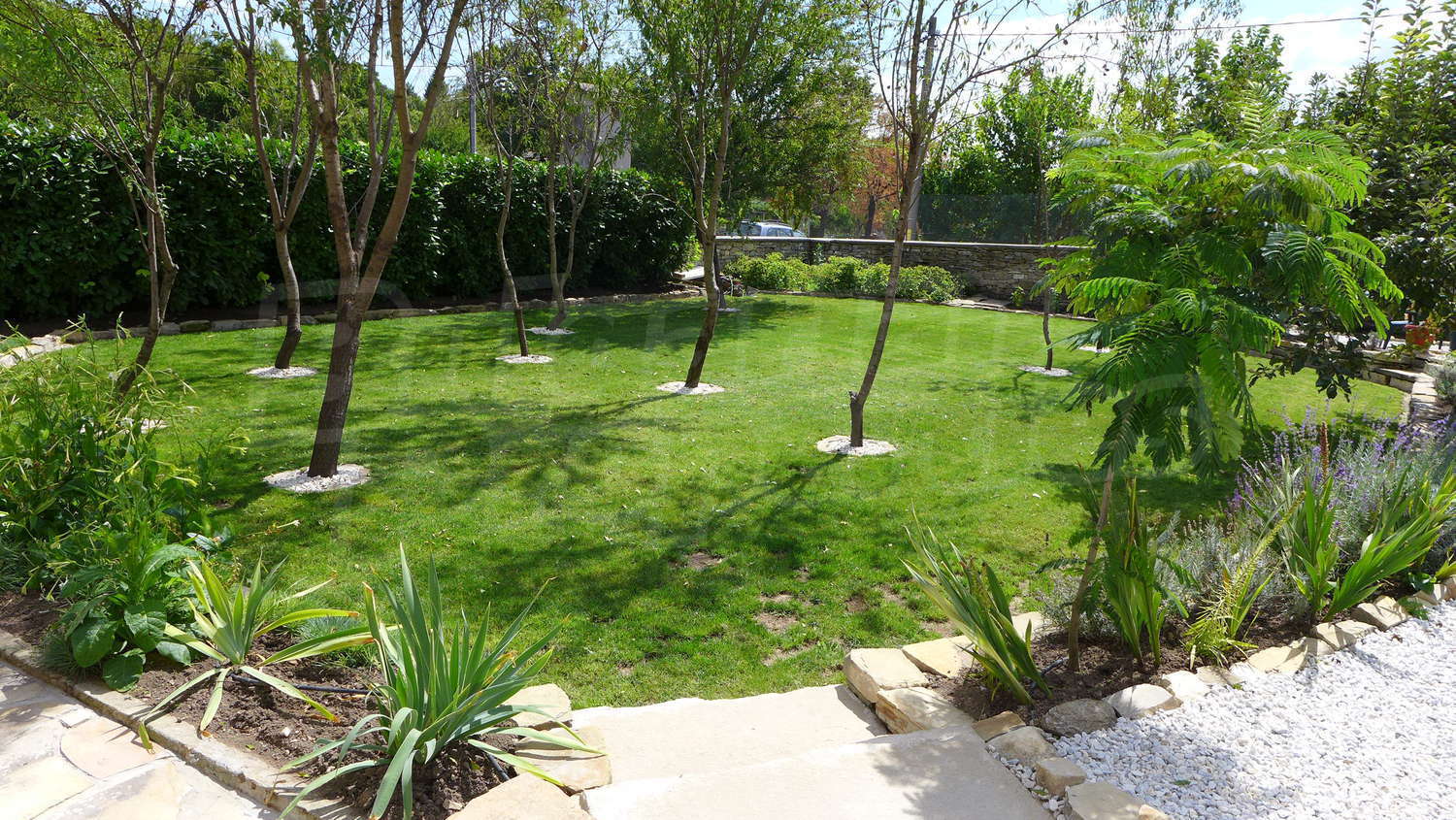 Сад хорошо ухоженный. В настоящее время здесь высажены миндаль, фруктовые деревья, фиговые деревья, виноградная лоза и декоративные кустарники. Есть система полива с капельным орошением.