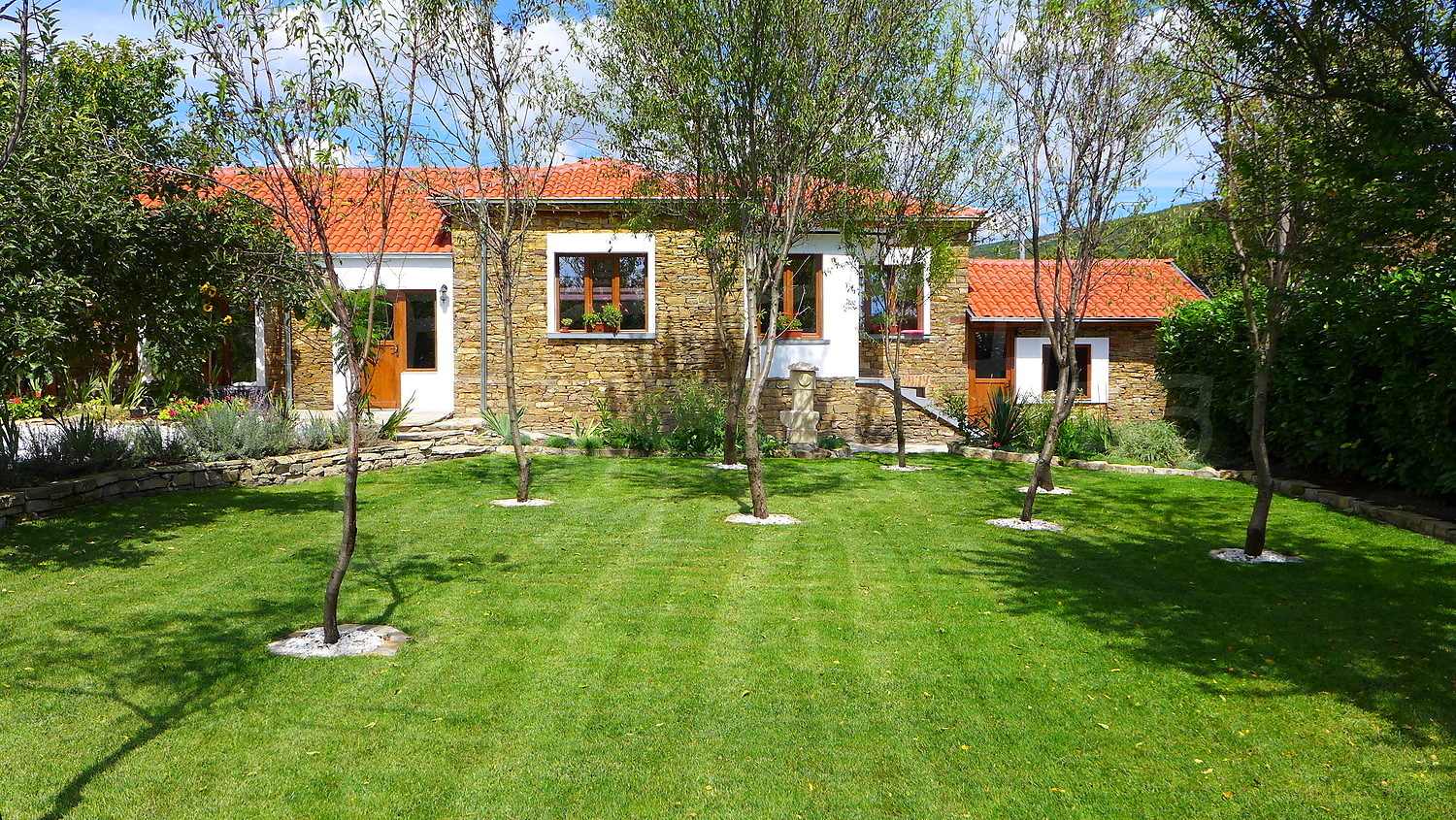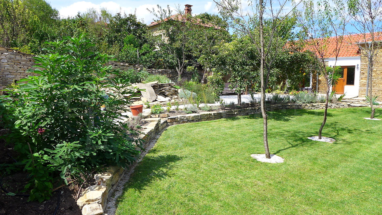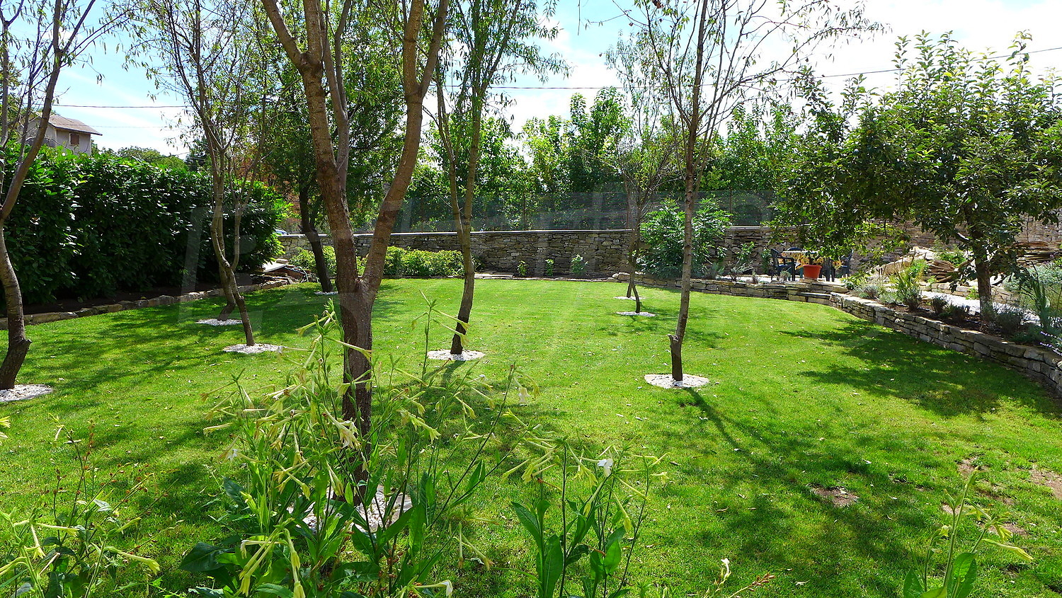 Сад хорошо ухоженный. В настоящее время здесь высажены миндаль, фруктовые деревья, фиговые деревья, виноградная лоза и декоративные кустарники. Есть система полива с капельным орошением.