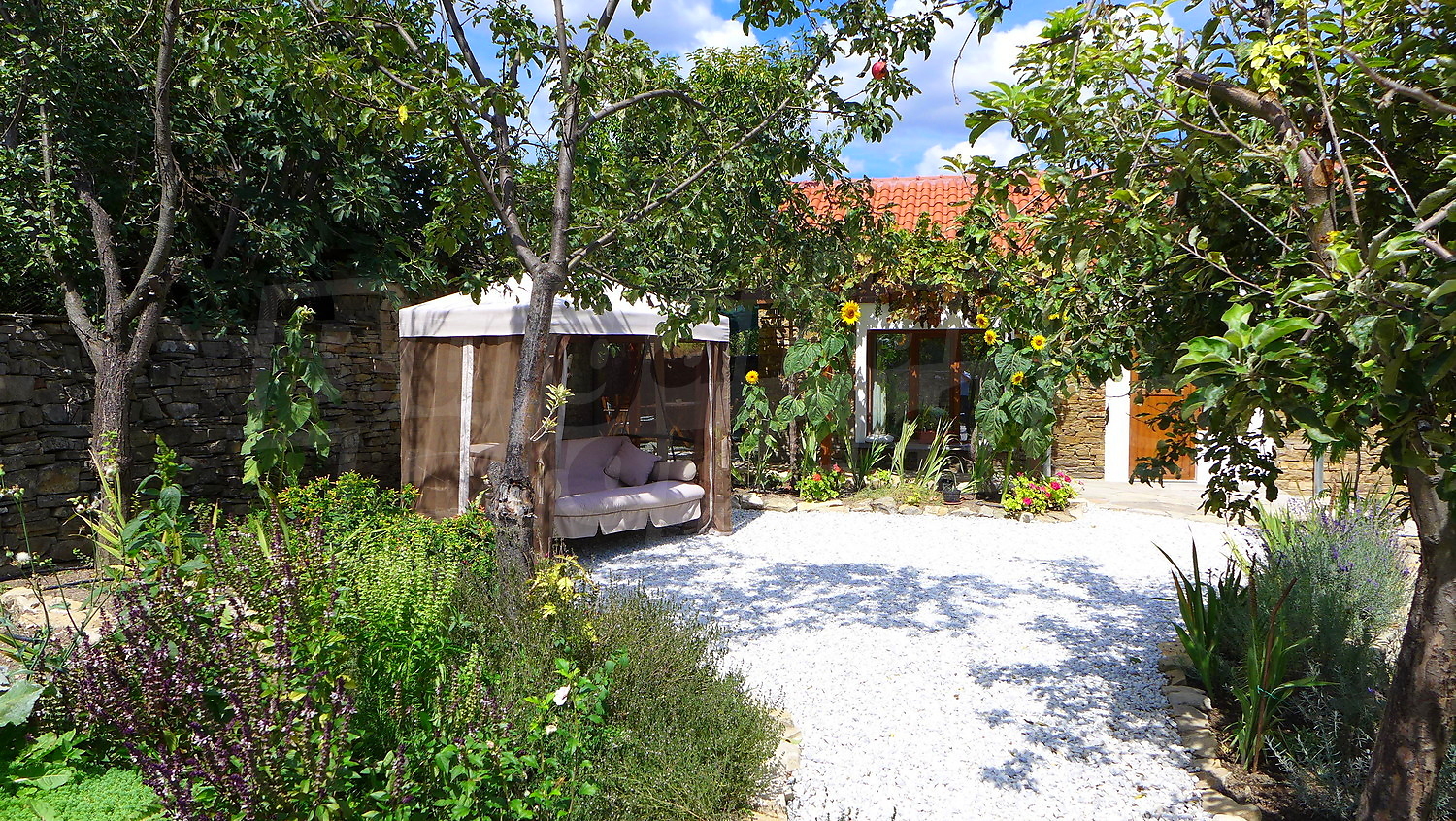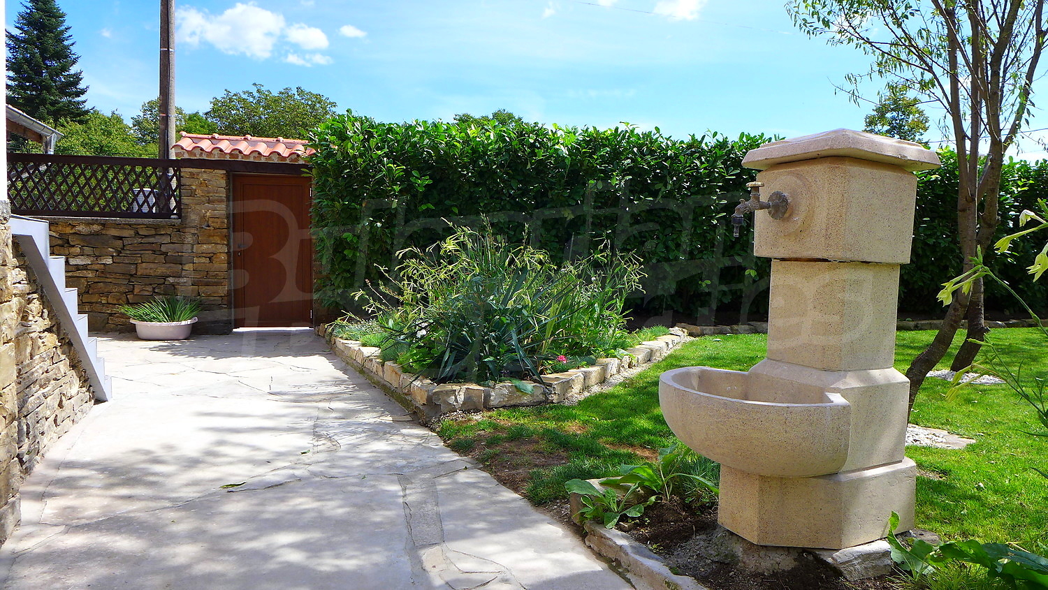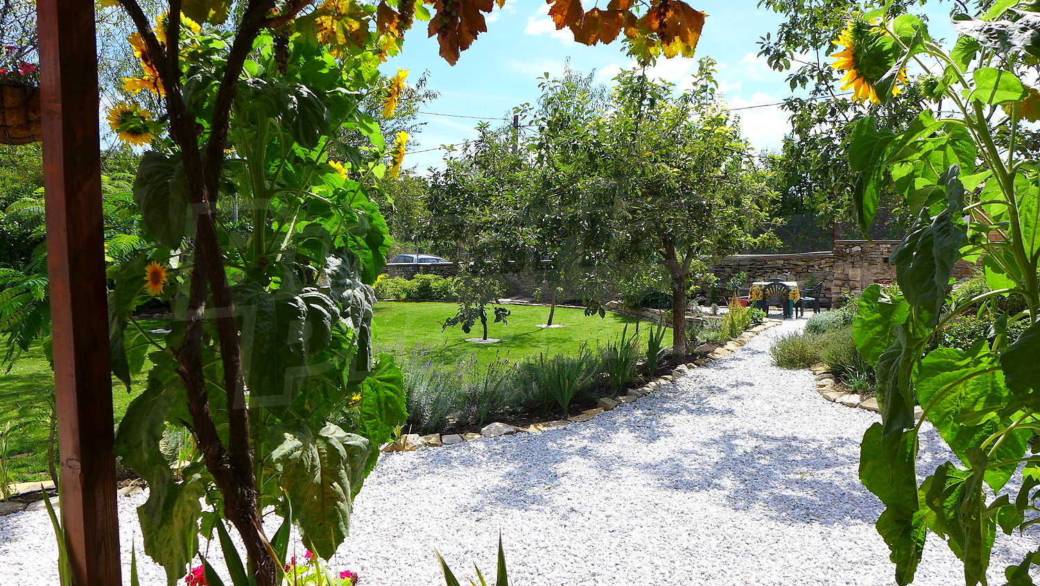 Сад хорошо ухоженный. В настоящее время здесь высажены миндаль, фруктовые деревья, фиговые деревья, виноградная лоза и декоративные кустарники. Есть система полива с капельным орошением.