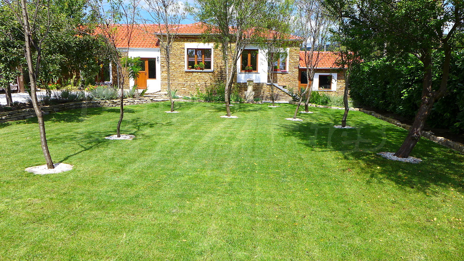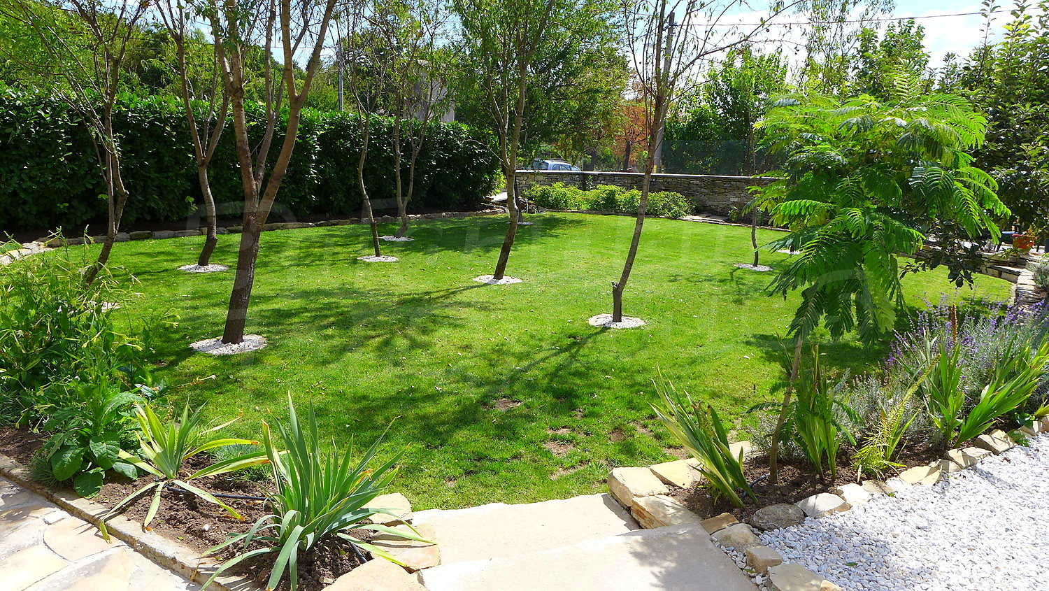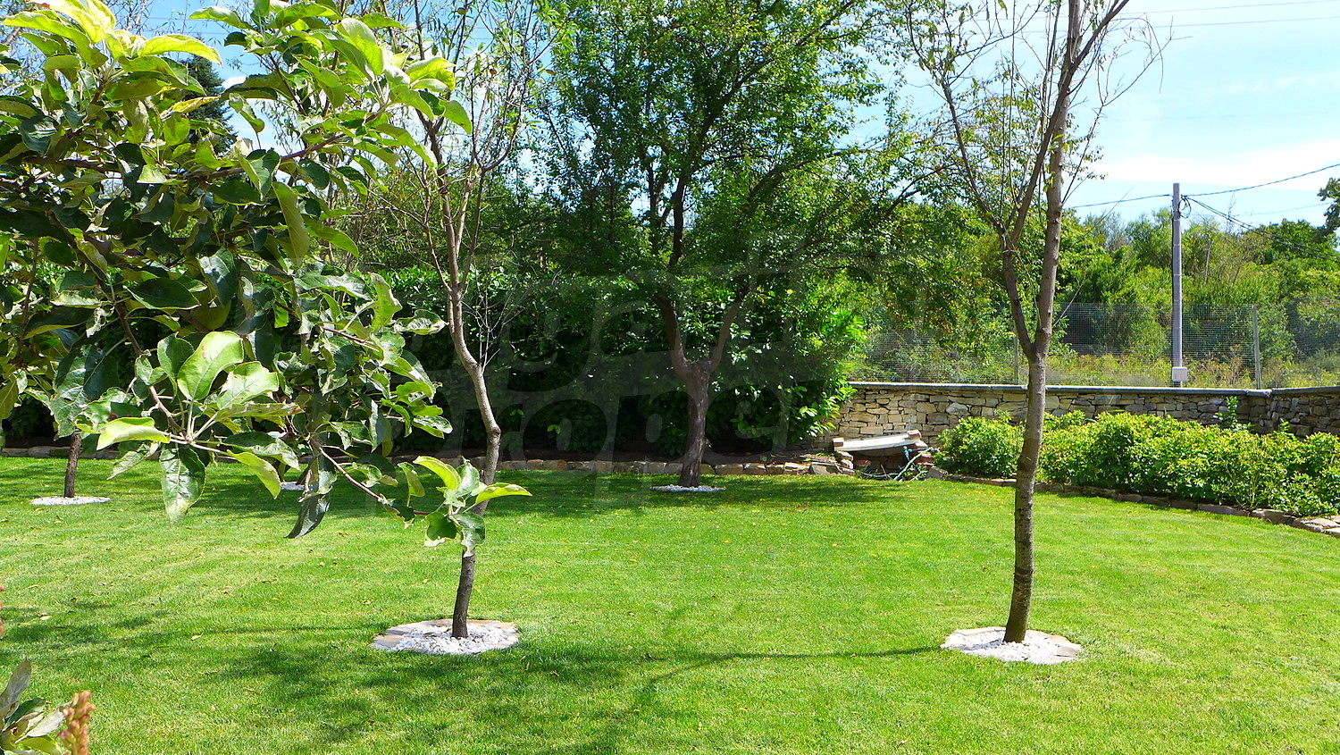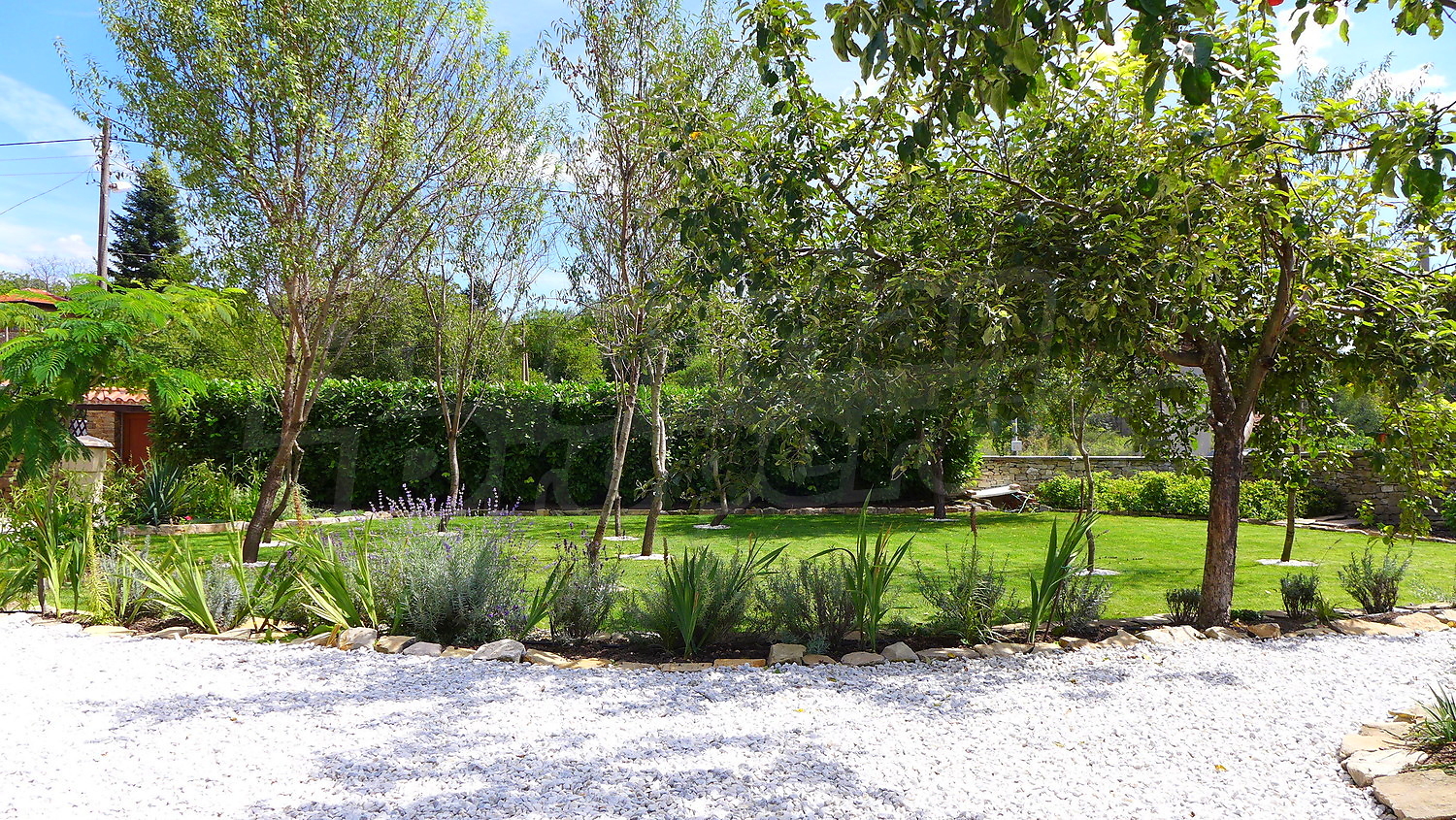 Сад хорошо ухоженный. В настоящее время здесь высажены миндаль, фруктовые деревья, фиговые деревья, виноградная лоза и декоративные кустарники. Есть система полива с капельным орошением.