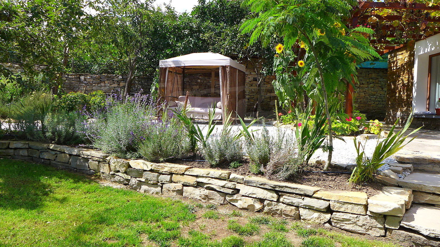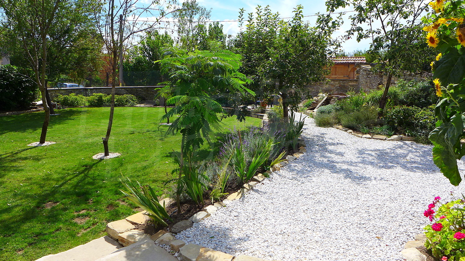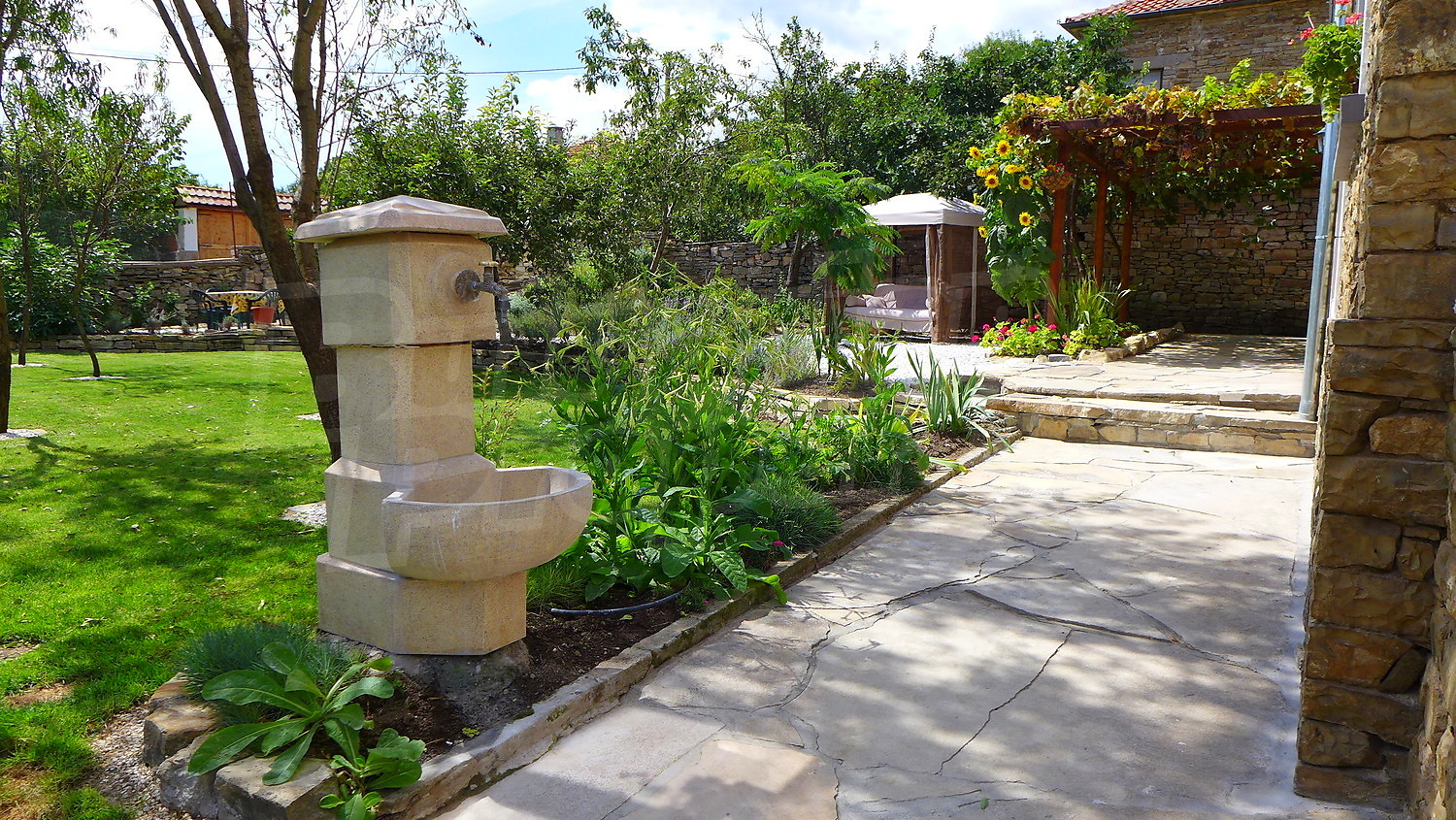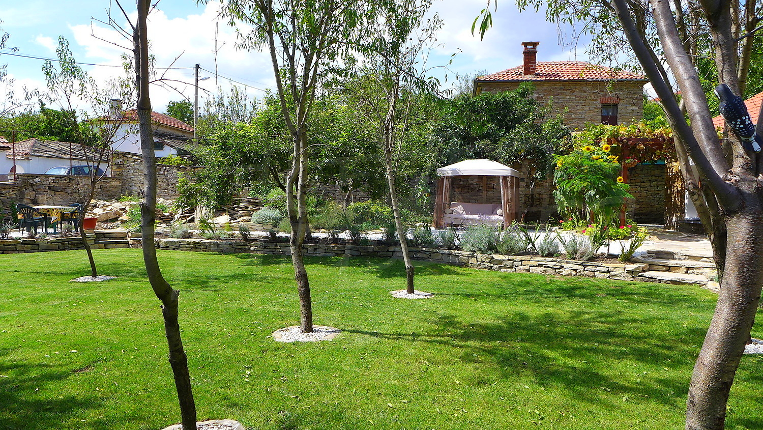 Сад хорошо ухоженный. В настоящее время здесь высажены миндаль, фруктовые деревья, фиговые деревья, виноградная лоза и декоративные кустарники. Есть система полива с капельным орошением.
