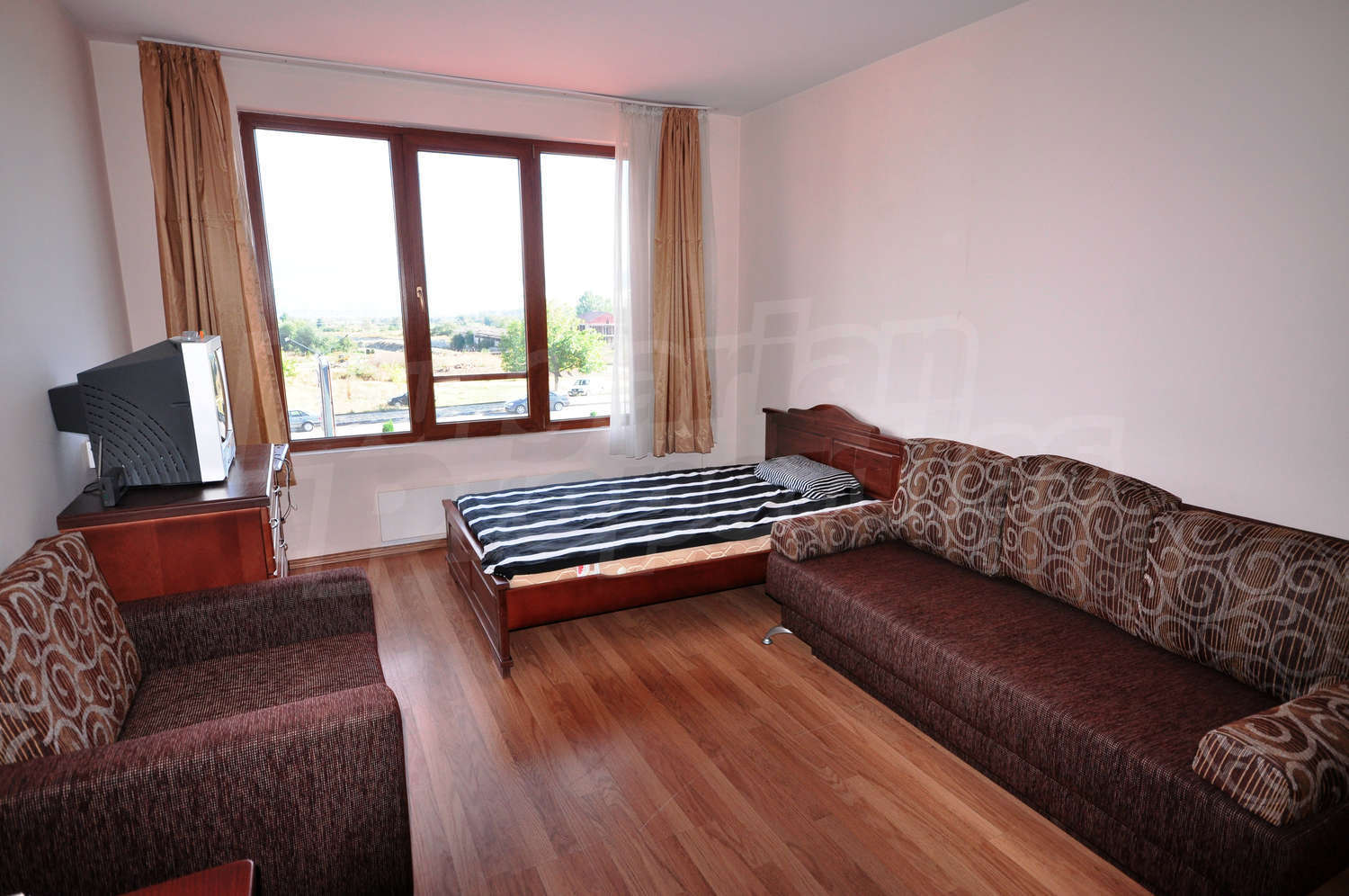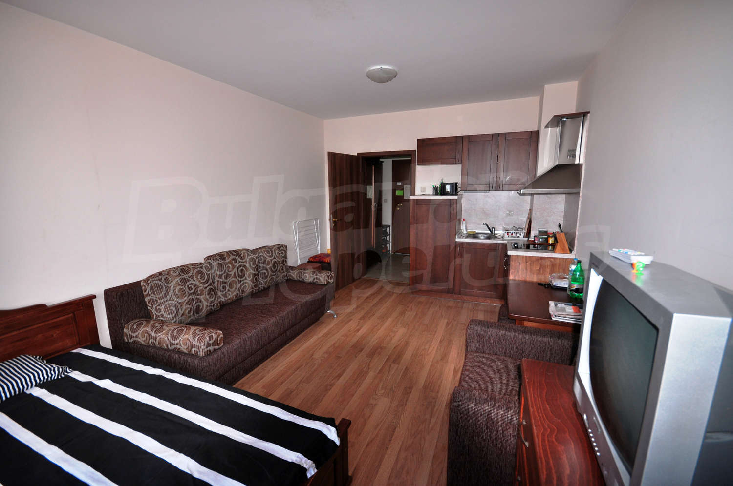 Квартира-студия площадью 35 кв.м. Предлагаемая недвижимость построена в 2006. Отопление на электрических радиаторах. Ламинированный пол, окна пвх, покрашенные стены и терракотовый пол имеются в предлагаемой недвижимости. Недвижимость включает следующую меблировку и оборудование: бойлер электрический, встроенная кухня, вытяжка, душевая, меблировку, оборудованная ванная комната, телевизор и холодильник. Из основных коммуникаций обеспечены электричество, вода и канализация. Ванная комната с туалетом, комплекс закрытого типа, консьерж, лифт, общие части с отделкой люкс, интернет и кабельное телевидение имеются в наличии среди прочих указанных характеристик предлагаемого объекта, что обеспечит дополнительные удобства для пользования. Виды на горы открываются с недвижимости, раскрывая часть красот живописной Болгарии.