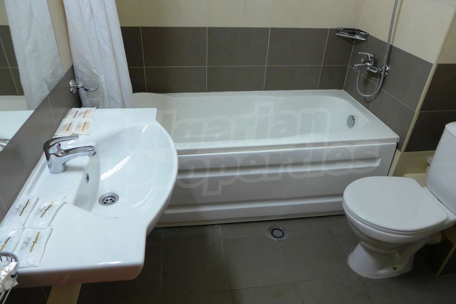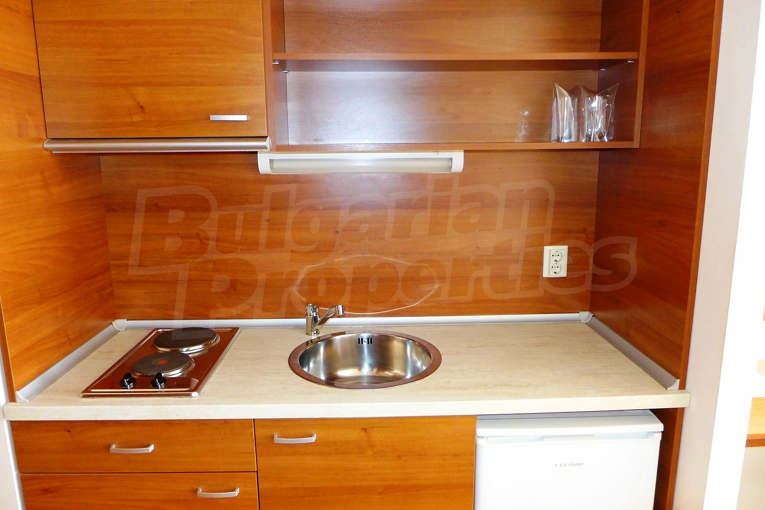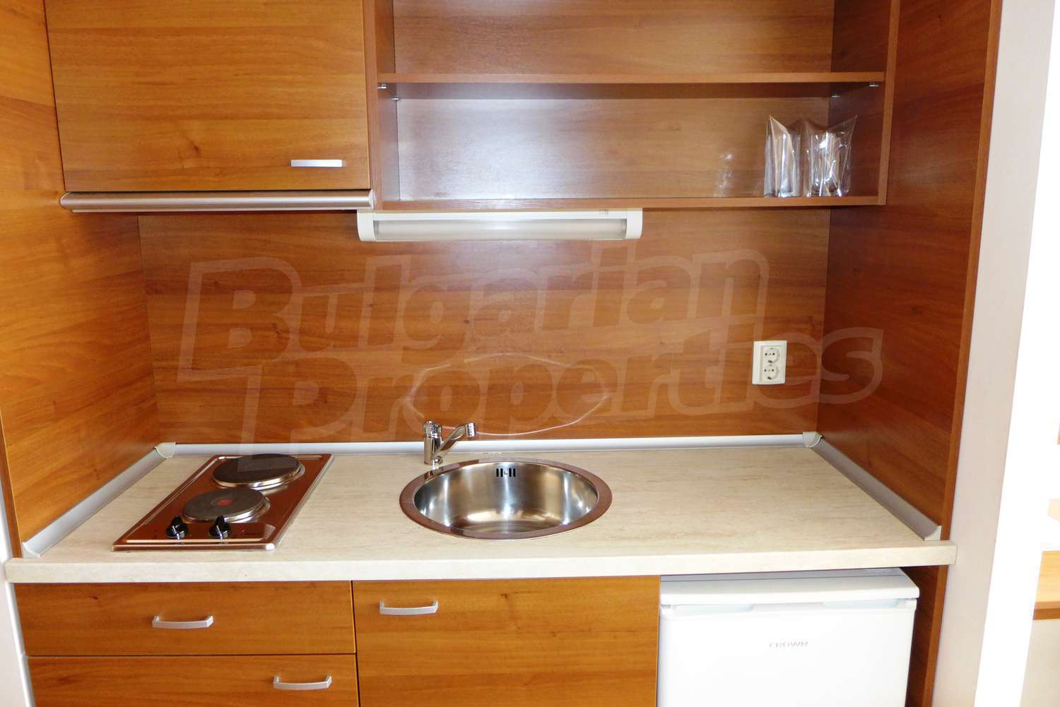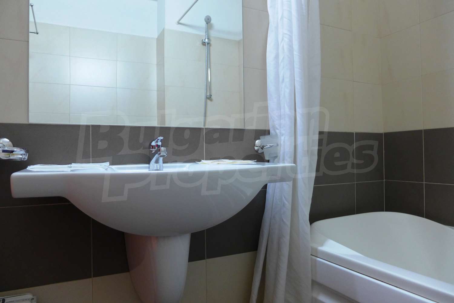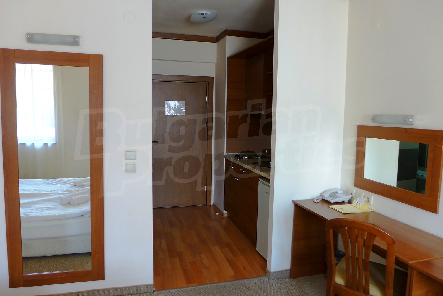 Квартира-студия площадью 40.22 кв. метров. Предлагаемая недвижимость построена в 2006. Отопление на электрических радиаторах. Ковровый настил, межкомнатные двери, окна пвх и терракотовый пол имеются в предлагаемой недвижимости. Недвижимость включает следующую меблировку и оборудование: бойлер электрический, ванна, встроенная кухня, вытяжка, меблировку, оборудованная ванная комната, телевизор и холодильник. Из основных коммуникаций обеспечены электричество, вода, центральное водоснабжение и центральная канализация. Внутренний туалет, внутренняя ванная, парковка вне дороги, терраса, бассейн, консьерж, лифт, общие части с отделкой люкс, сауна, тренажерный зал, заасфальтированная дорога, интернет, интернет Wi-Fi, кабельное телевидение, система охранной сигнализации и телефон имеются в наличии среди прочих упомянутых характеристик предлагаемого объекта, что обеспечит дополнительный комфорт для пользования. Виды на внутренний двор открываются с недвижимости, раскрывая часть красот живописной Болгарии.
