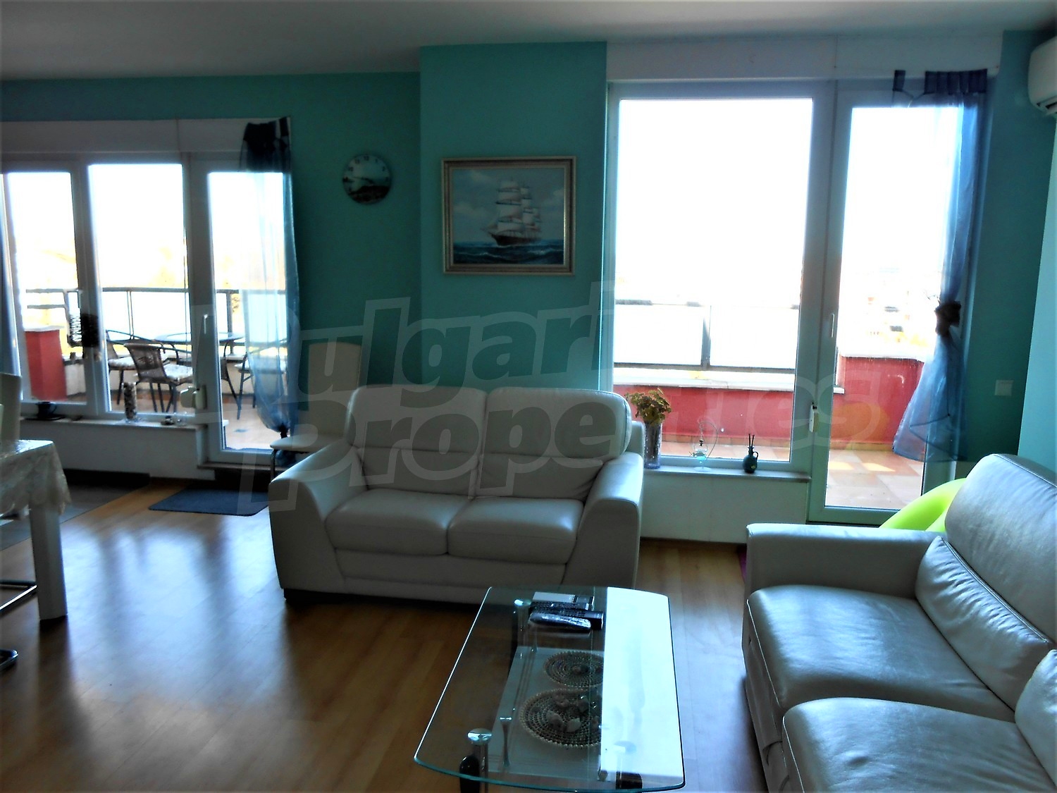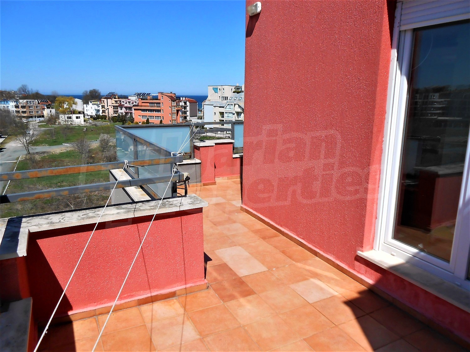 Большая терраса охватывает одну спальню, кухню, гостиную / - 41,67кв.м., А небольшая терраса - ко второй спальне и имеет площадь 4,74кв.м. Все комнаты и террасы имеют вид на море, который не прерывается зданиями и сооружениями.