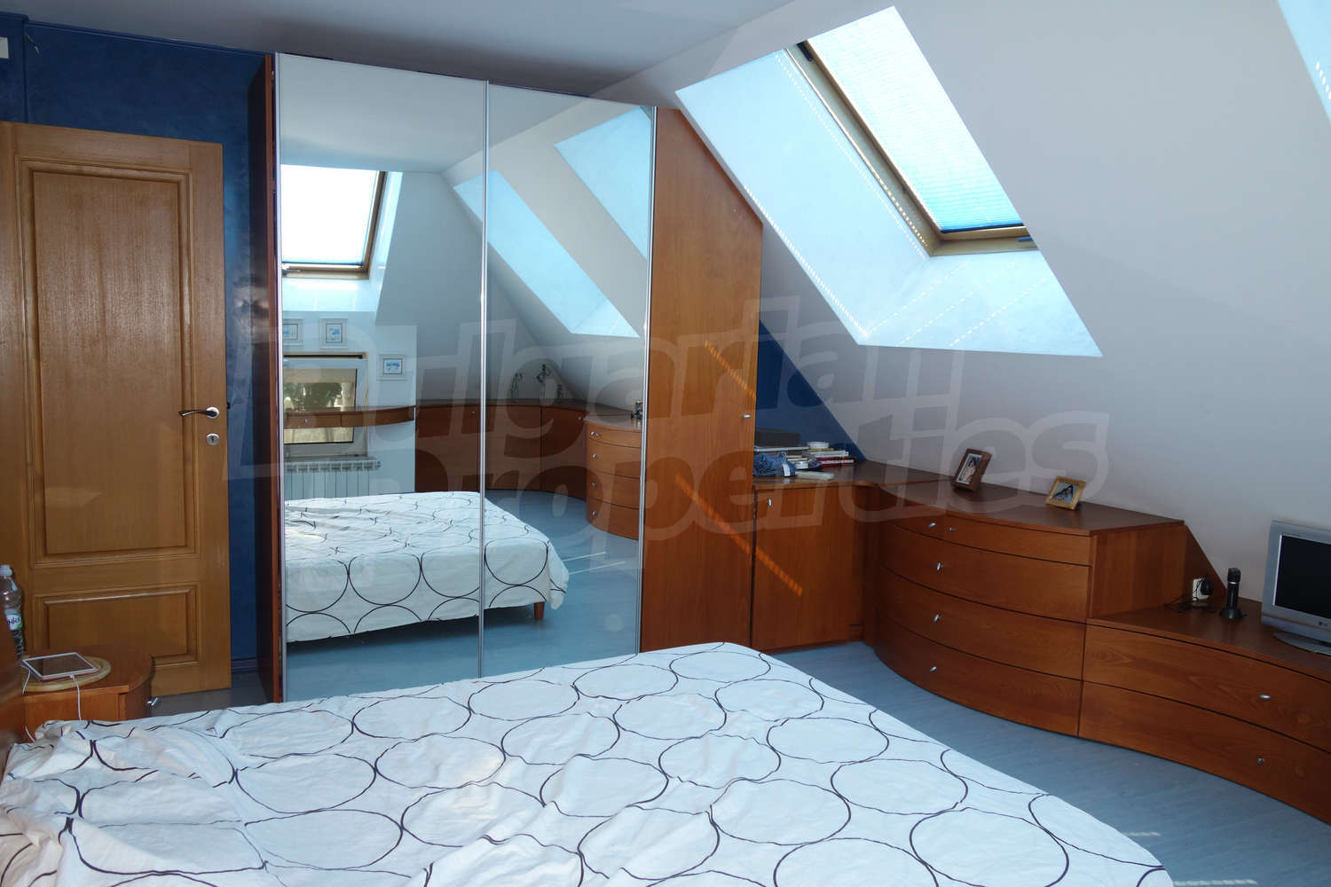 Пентхаус в двух уровнях площадью 216 кв. метров. Предлагаемая недвижимость построена в 1999. Камин, локальное отопление и отопление кондиционером. Внешняя изоляция, ламинированный пол, окна пвх, паркетный пол и покрашенные стены имеются в предлагаемой недвижимости. Недвижимость включает следующую меблировку и оснащение: меблировку и оборудованная ванная комната. Из основных коммуникаций обеспечены электричество, вода и канализация. Балконы, ванная комната с туалетом, кладовая, подвал, туалет, консьерж, лифт, интернет, кабельное телевидение и система охранной сигнализации имеются в наличии среди прочих характеристик предлагаемого объекта, что обеспечит дополнительный комфорт для пользования. Виды на город, виды на горы и виды на парк открываются с недвижимости, раскрывая часть красот живописной Болгарии.