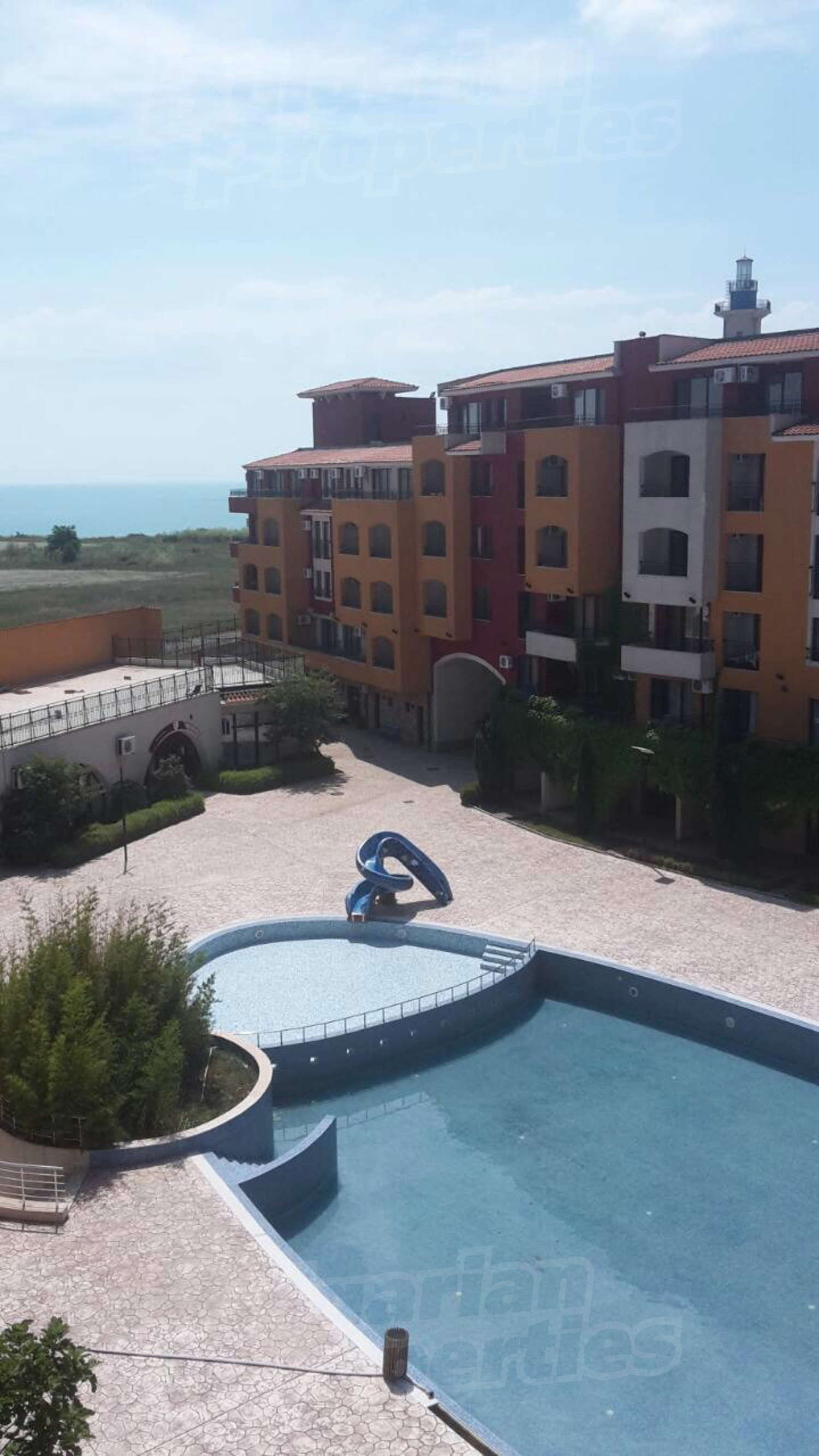 Квартира-студия площадью 45.50 кв.м. Отопление кондиционером. Обеспечено кондиционирование следующего типа: стандартные кондиционеры. Двойной стеклопакет, ковровый настил, межкомнатные двери, окна пвх, стены покрашенные латексной краской и терракотовый пол имеются в предлагаемой недвижимости. Недвижимость включает следующую меблировку и оснащение: встроенная кухня, вытяжка, кондиционер, меблировку, оборудованная ванная комната и холодильник. Из основных коммуникаций обеспечены электричество, центральное водоснабжение и центральная канализация. Балконы, ванная комната с туалетом, обозначенная стоянка, бассейн, джакузи, комплекс закрытого типа, консьерж, лифт, общие части с отделкой люкс, сауна, теннисный корт, тренажерный зал, заасфальтированная дорога, интернет, интернет Wi-Fi, кабельное телевидение, система охранной сигнализации и телефон имеются в наличии среди прочих отличительных характеристик предлагаемого объекта, что обеспечит дополнительный комфорт для пользования. Виды на бассейн и виды на море открываются с недвижимости, раскрывая часть красот живописной Болгарии.
