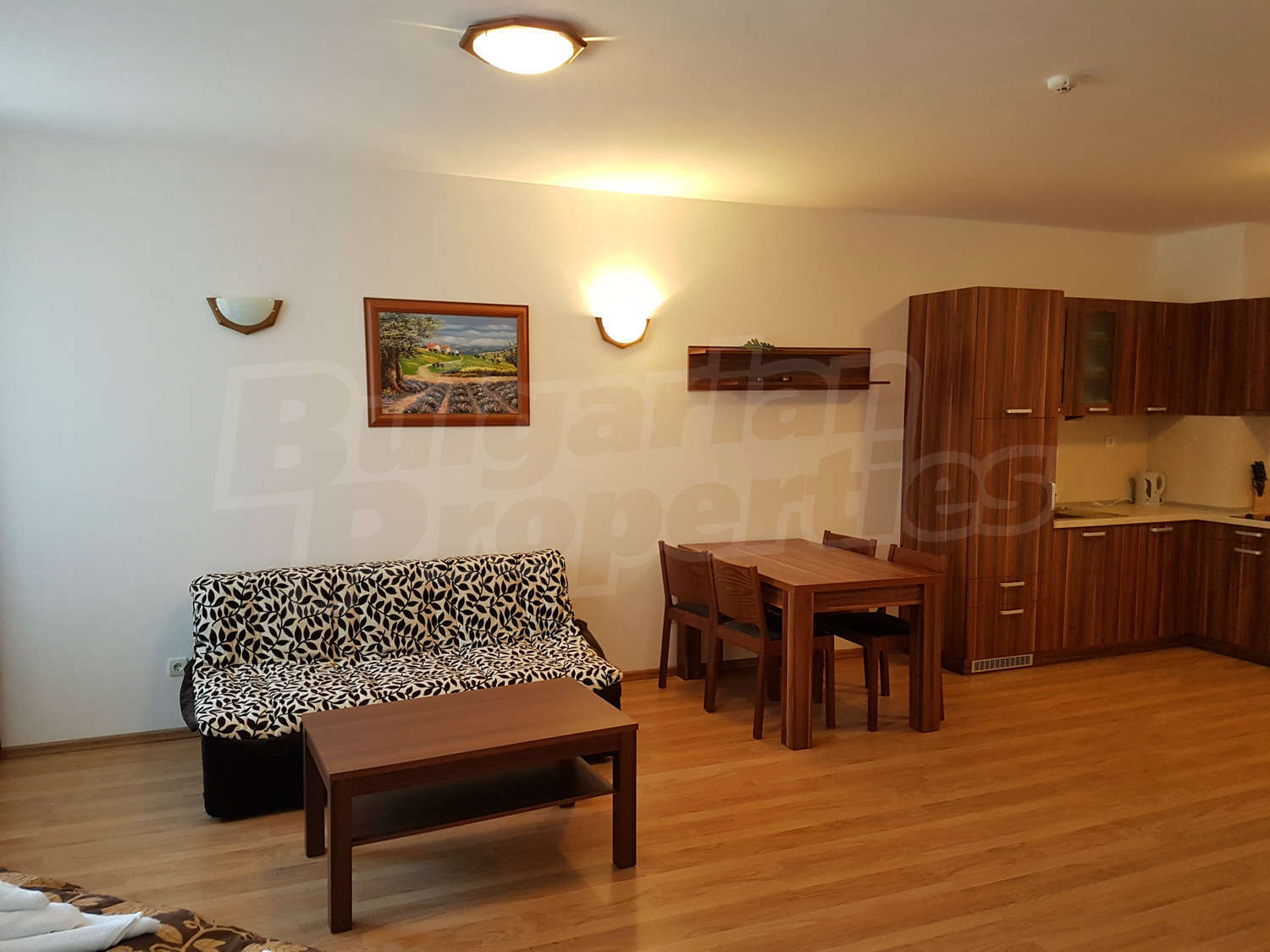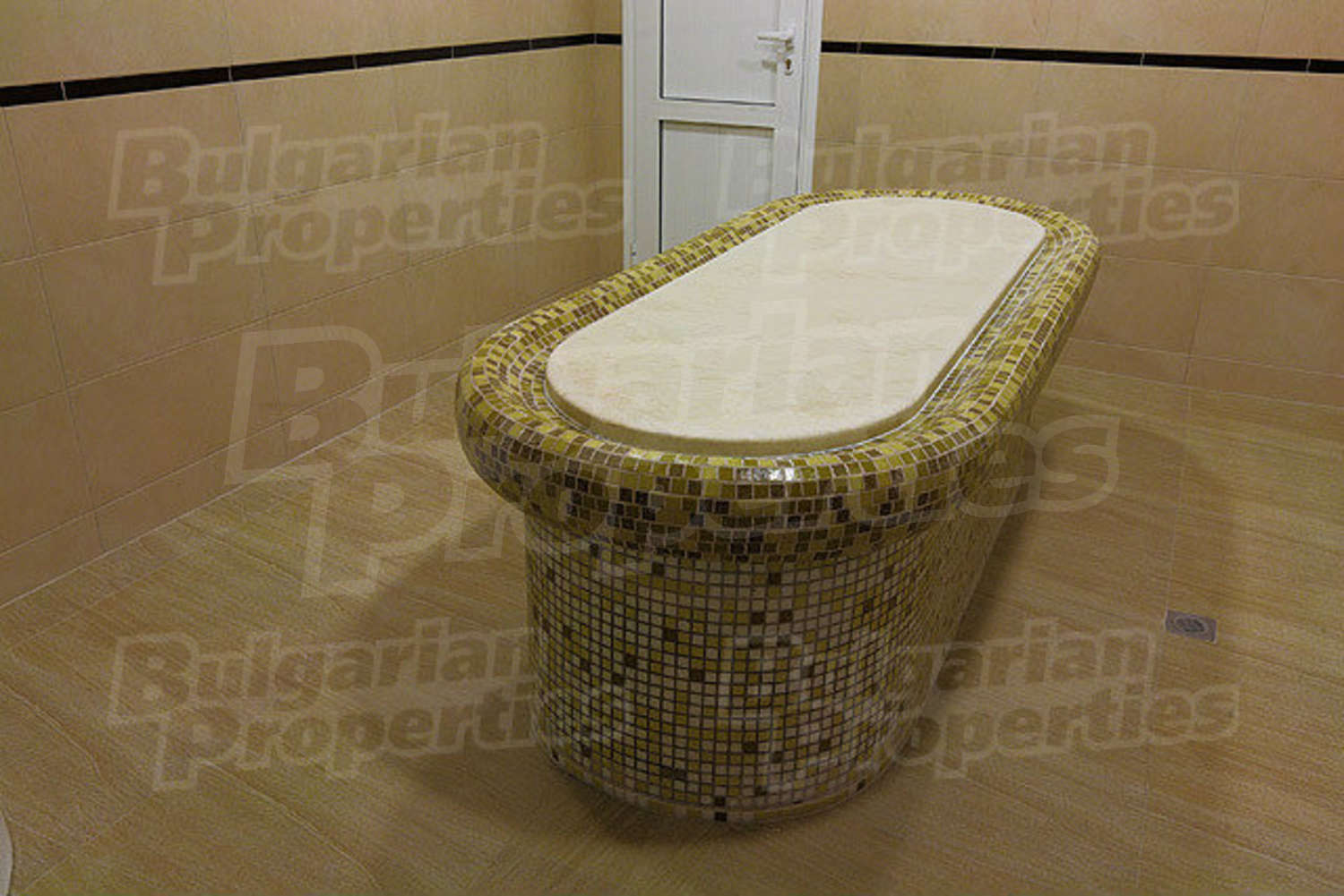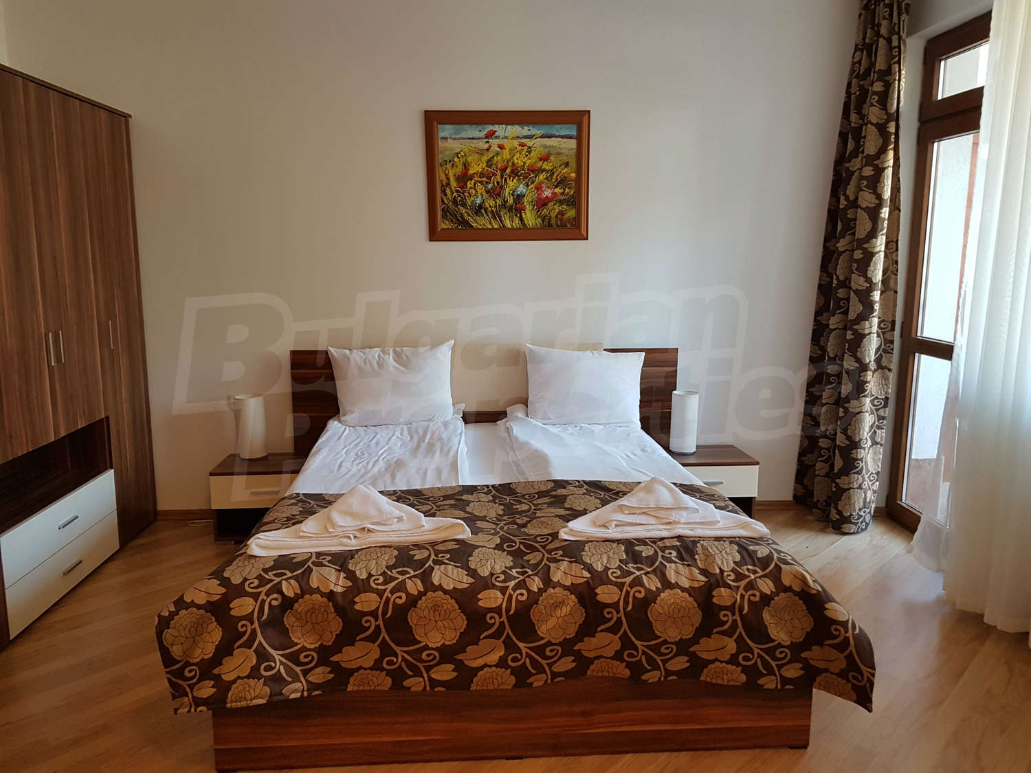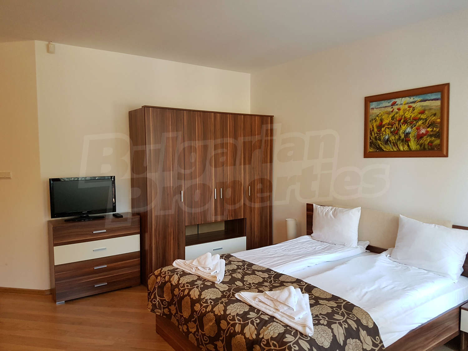 Квартира-студия площадью 70.94 кв.м. Предлагаемая недвижимость построена в 2008. Отопление на электроконвекторах. Деревянные оконные рамы, керамогранитный пол, ламинированный пол и покрашенные стены имеются в предлагаемой недвижимости. Недвижимость включает следующую меблировку и оборудование: встроенная кухня, вытяжка, духовка, меблировку, оборудованная ванная комната, телевизор и холодильник. Из основных коммуникаций обеспечены электричество, вода и центральная канализация. Ванная комната с туалетом, терраса, комплекс закрытого типа, общие части с отделкой люкс, сауна, тренажерный зал, заасфальтированная дорога, интернет, интернет Wi-Fi, кабельное телевидение, спутниковое тв и телефон имеются в наличии среди прочих упомянутых характеристик предлагаемого объекта, что обеспечит дополнительные удобства для пользования. Виды на внутренний двор и виды на лес открываются с недвижимости, раскрывая часть красот живописной Болгарии.