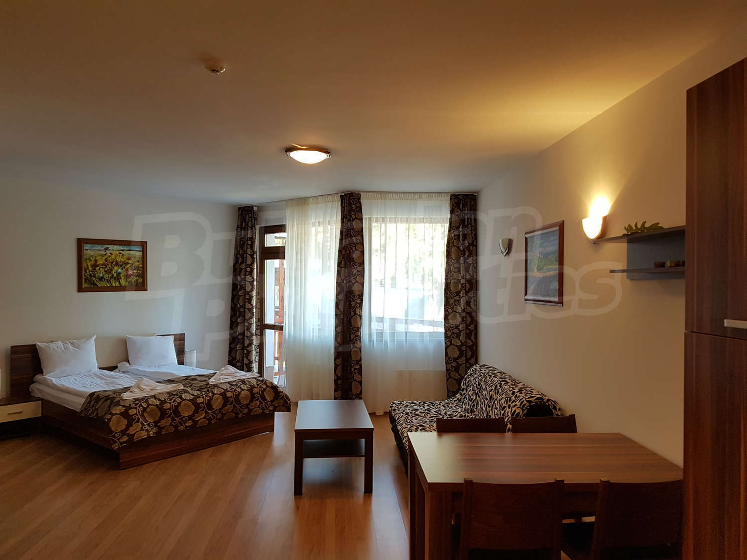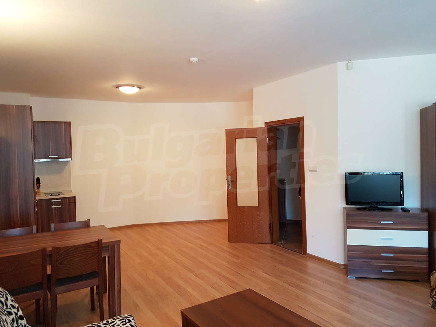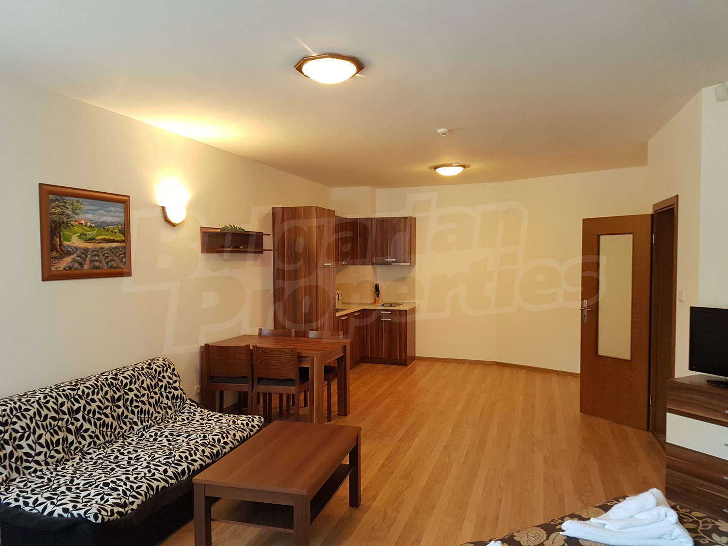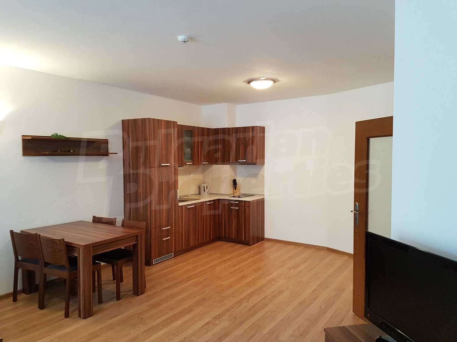 Квартира-студия площадью 70.94 кв.м. Предлагаемая недвижимость построена в 2008. Отопление на электроконвекторах. Деревянные оконные рамы, керамогранитный пол, ламинированный пол и покрашенные стены имеются в предлагаемой недвижимости. Недвижимость включает следующую меблировку и оборудование: встроенная кухня, вытяжка, духовка, меблировку, оборудованная ванная комната, телевизор и холодильник. Из основных коммуникаций обеспечены электричество, вода и центральная канализация. Ванная комната с туалетом, терраса, комплекс закрытого типа, общие части с отделкой люкс, сауна, тренажерный зал, заасфальтированная дорога, интернет, интернет Wi-Fi, кабельное телевидение, спутниковое тв и телефон имеются в наличии среди прочих упомянутых характеристик предлагаемого объекта, что обеспечит дополнительные удобства для пользования. Виды на внутренний двор и виды на лес открываются с недвижимости, раскрывая часть красот живописной Болгарии.