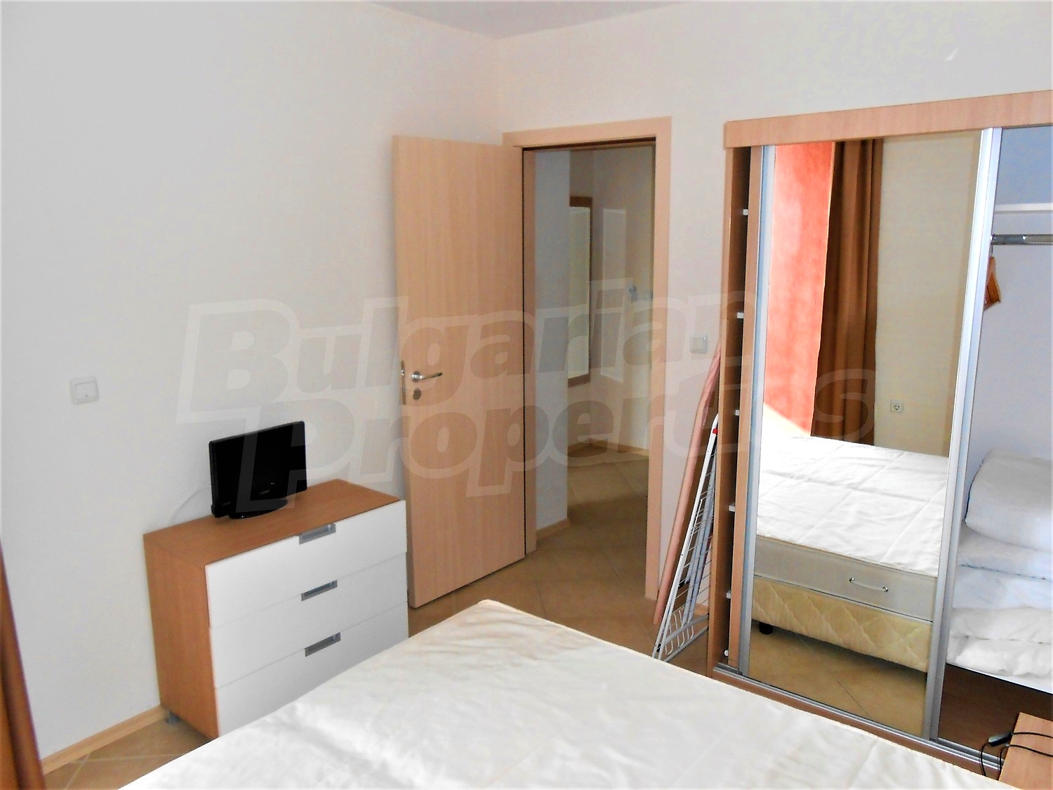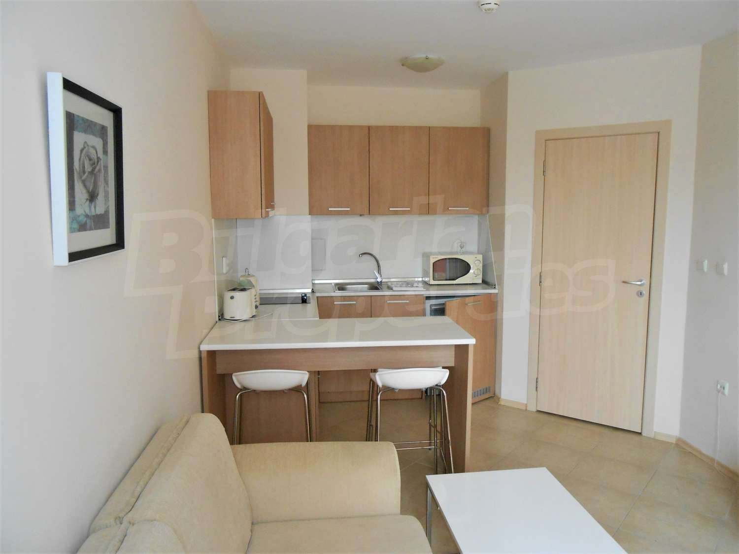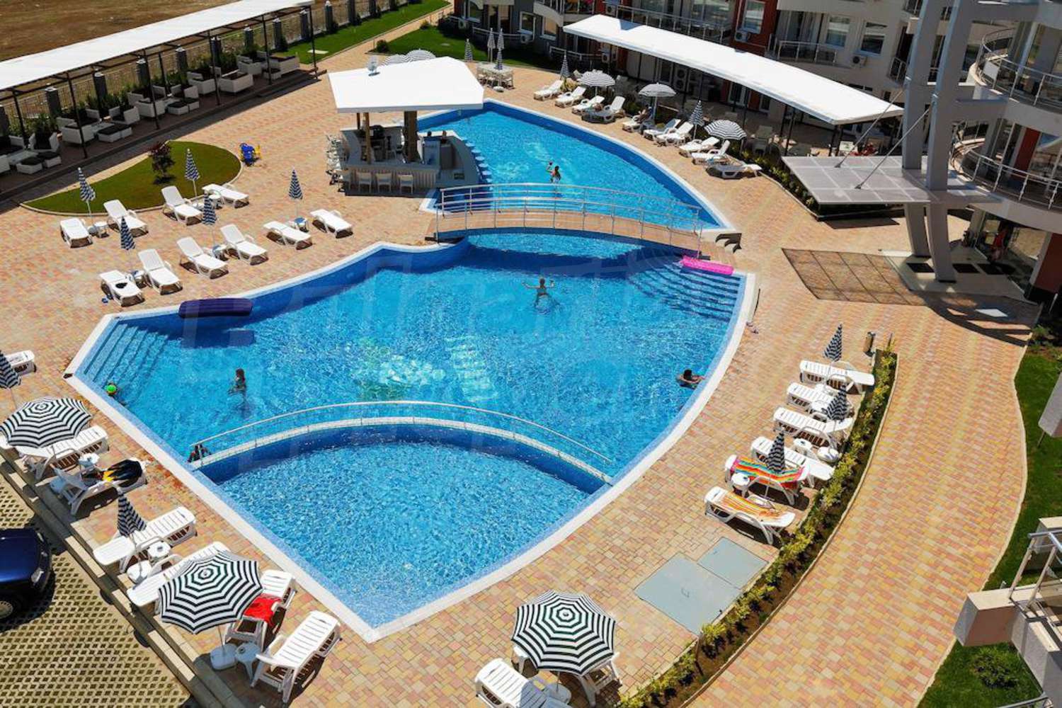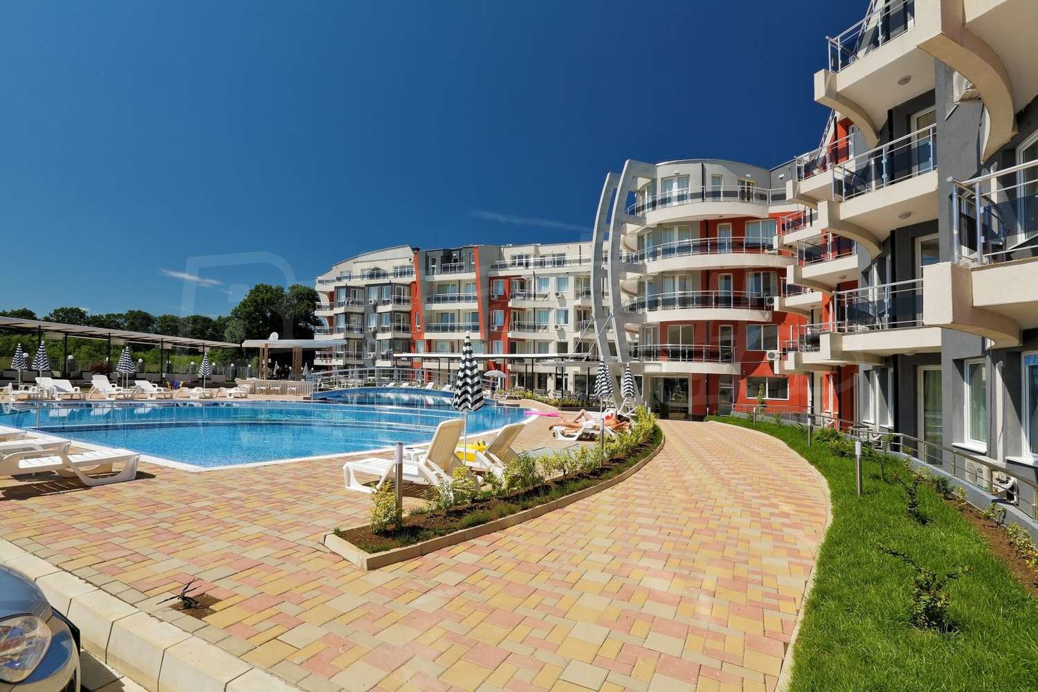 Двухкомнатная квартира площадью 46.26 м2. Предлагаемая недвижимость построена в 2008. Отопление кондиционером. Обеспечено кондиционирование следующего типа: стандартные кондиционеры. Керамогранитный пол, межкомнатные двери, окна пвх и стены покрашенные латексной краской имеются в предлагаемой недвижимости. Недвижимость включает следующую меблировку и оборудование: бойлер электрический, встроенная кухня, душевая, кондиционер, меблировку, оборудованная ванная комната, телевизор и холодильник. Из основных коммуникаций обеспечены электричество, центральное водоснабжение и центральная канализация. Ванная комната с туалетом, терраса, бассейн, комплекс закрытого типа, лифт, заасфальтированная дорога, интернет, интернет Wi-Fi и кабельное телевидение имеются в наличии среди прочих характеристик предлагаемого объекта, что обеспечит дополнительные удобства для пользования. Виды на бассейн открываются с недвижимости, раскрывая часть красот живописной Болгарии.