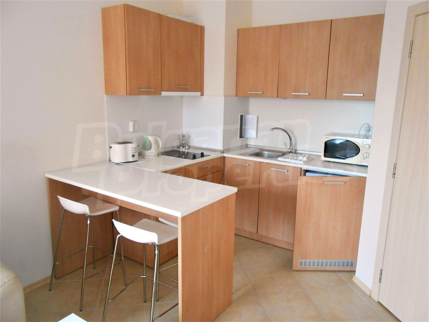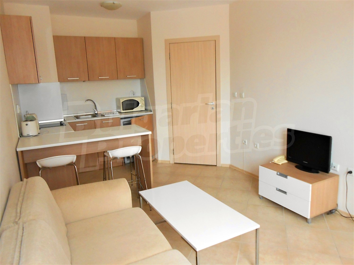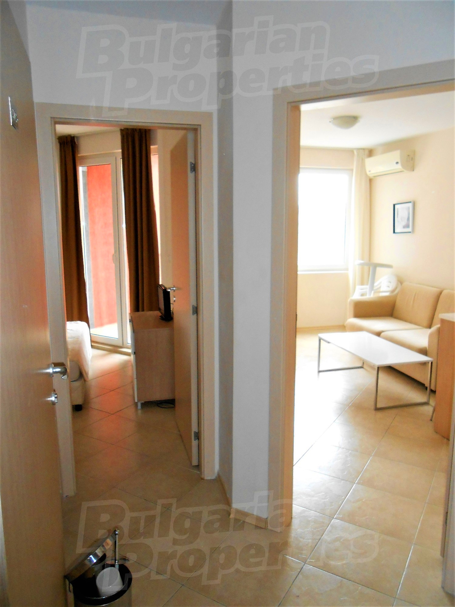 Двухкомнатная квартира площадью 46.26 м2. Предлагаемая недвижимость построена в 2008. Отопление кондиционером. Обеспечено кондиционирование следующего типа: стандартные кондиционеры. Керамогранитный пол, межкомнатные двери, окна пвх и стены покрашенные латексной краской имеются в предлагаемой недвижимости. Недвижимость включает следующую меблировку и оборудование: бойлер электрический, встроенная кухня, душевая, кондиционер, меблировку, оборудованная ванная комната, телевизор и холодильник. Из основных коммуникаций обеспечены электричество, центральное водоснабжение и центральная канализация. Ванная комната с туалетом, терраса, бассейн, комплекс закрытого типа, лифт, заасфальтированная дорога, интернет, интернет Wi-Fi и кабельное телевидение имеются в наличии среди прочих характеристик предлагаемого объекта, что обеспечит дополнительные удобства для пользования. Виды на бассейн открываются с недвижимости, раскрывая часть красот живописной Болгарии.