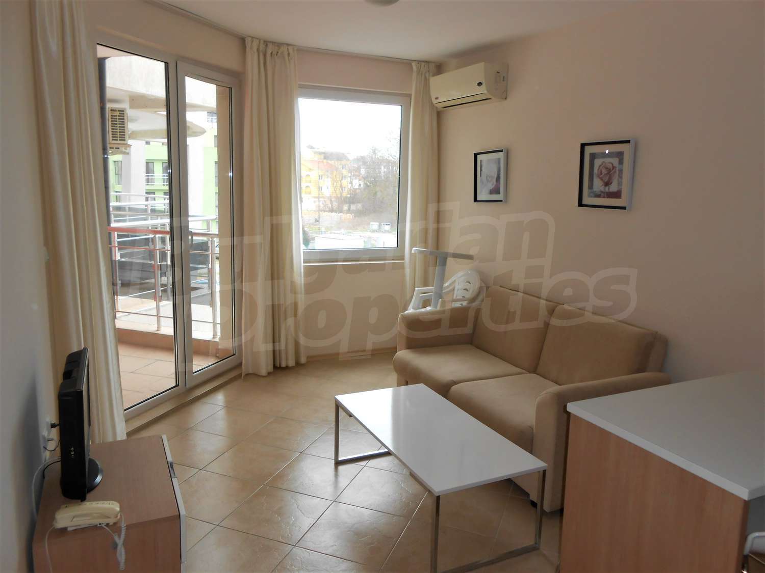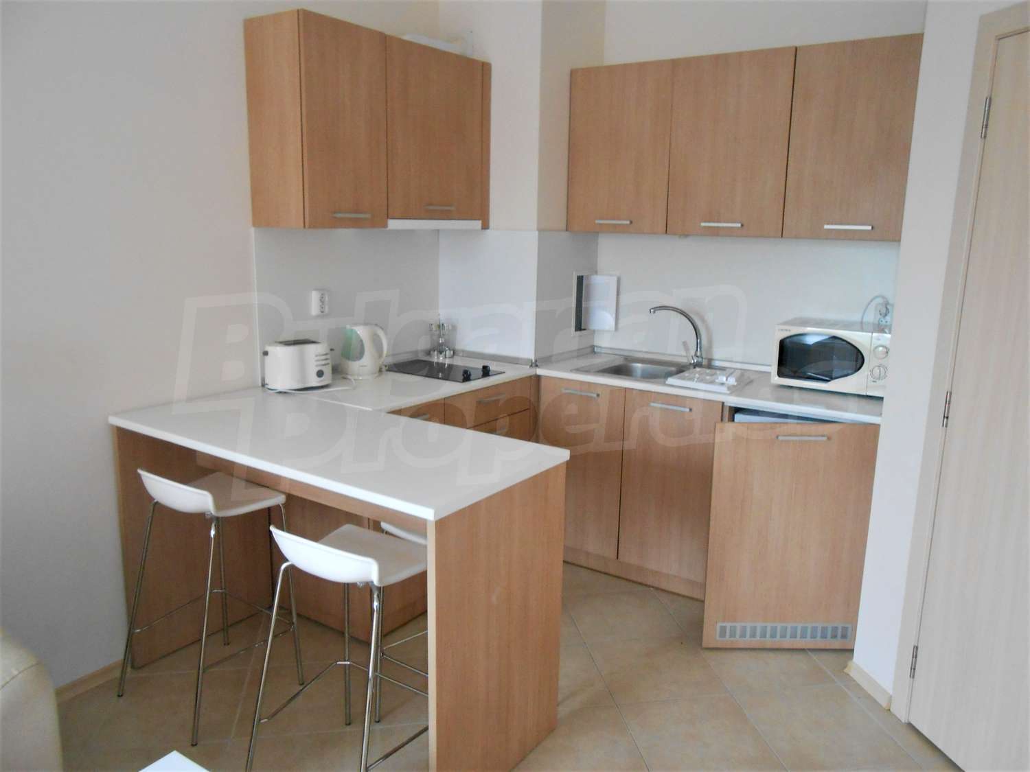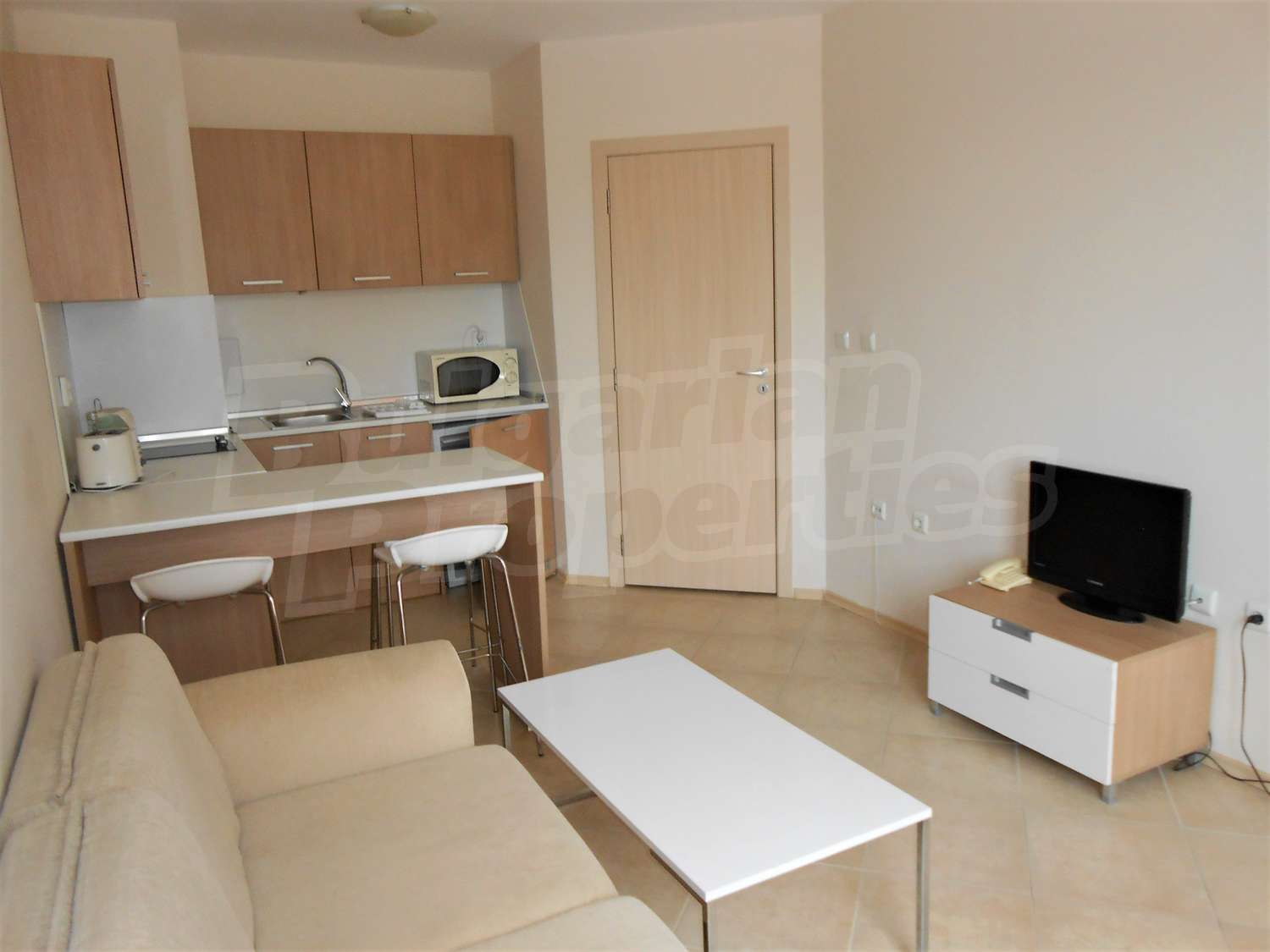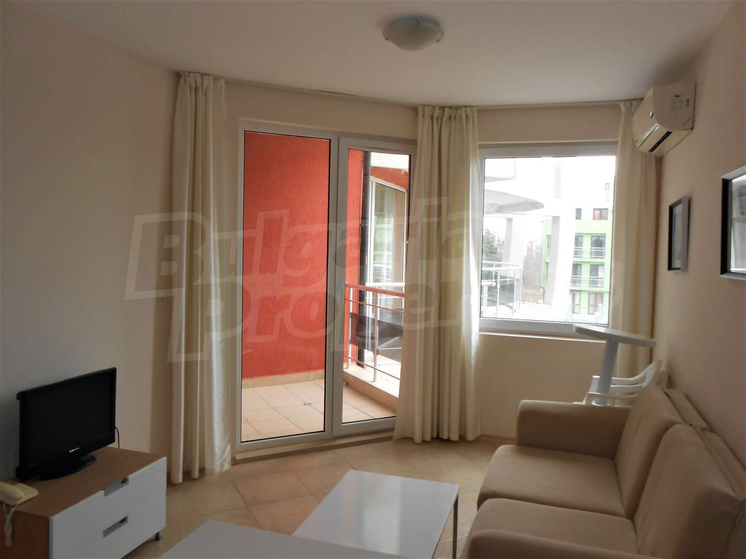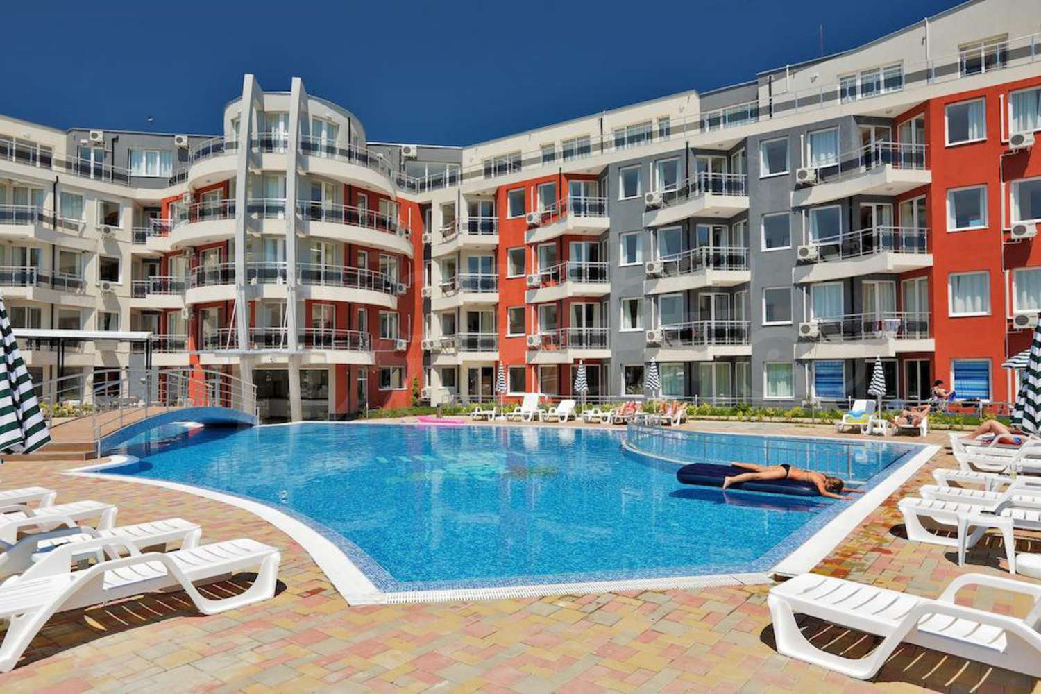 Двухкомнатная квартира площадью 46.26 м2. Предлагаемая недвижимость построена в 2008. Отопление кондиционером. Обеспечено кондиционирование следующего типа: стандартные кондиционеры. Керамогранитный пол, межкомнатные двери, окна пвх и стены покрашенные латексной краской имеются в предлагаемой недвижимости. Недвижимость включает следующую меблировку и оборудование: бойлер электрический, встроенная кухня, душевая, кондиционер, меблировку, оборудованная ванная комната, телевизор и холодильник. Из основных коммуникаций обеспечены электричество, центральное водоснабжение и центральная канализация. Ванная комната с туалетом, терраса, бассейн, комплекс закрытого типа, лифт, заасфальтированная дорога, интернет, интернет Wi-Fi и кабельное телевидение имеются в наличии среди прочих характеристик предлагаемого объекта, что обеспечит дополнительные удобства для пользования. Виды на бассейн открываются с недвижимости, раскрывая часть красот живописной Болгарии.