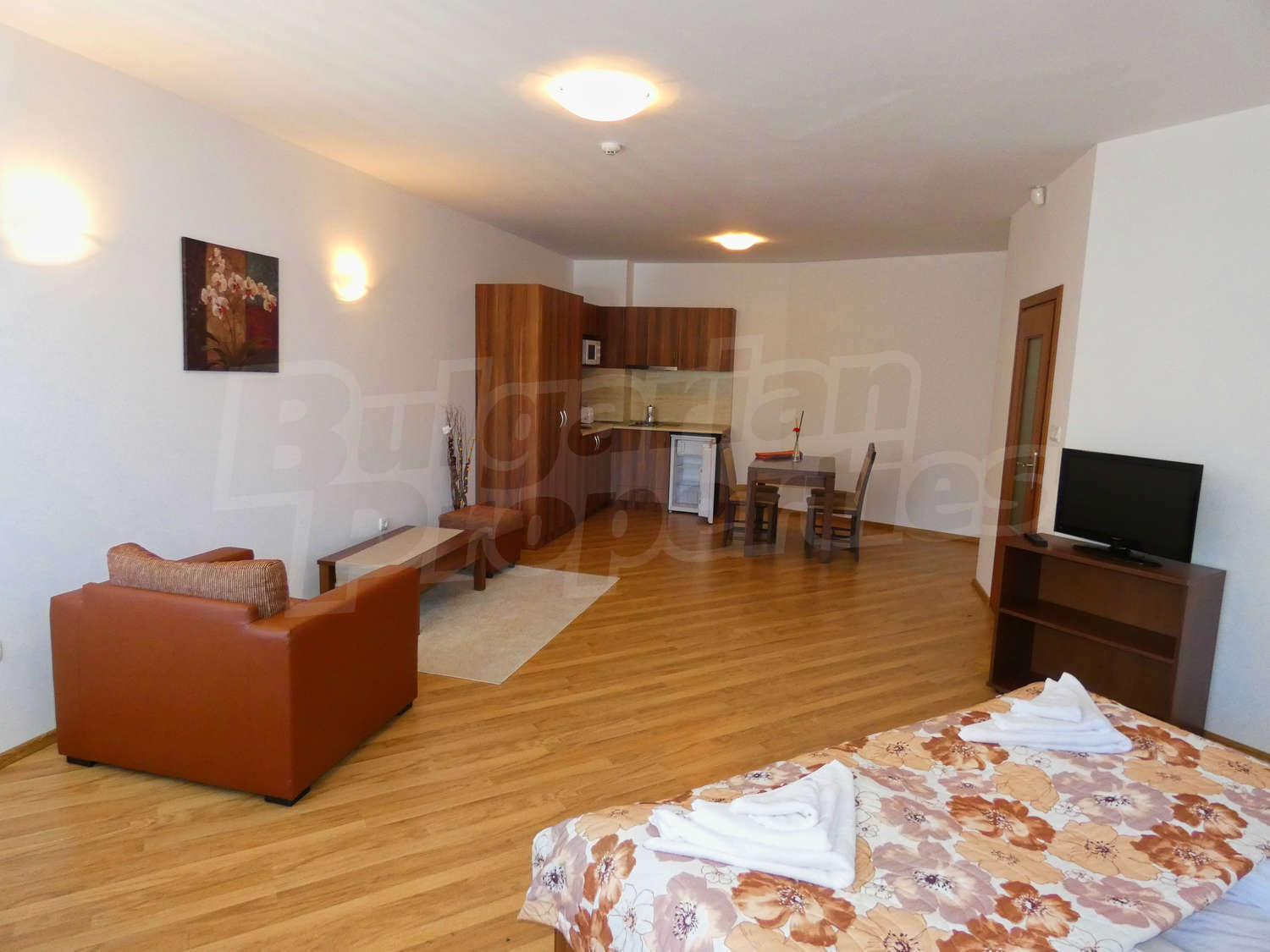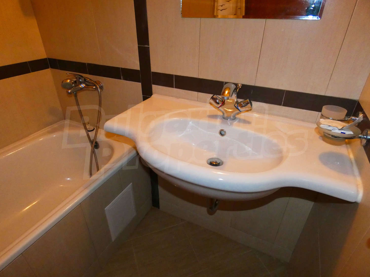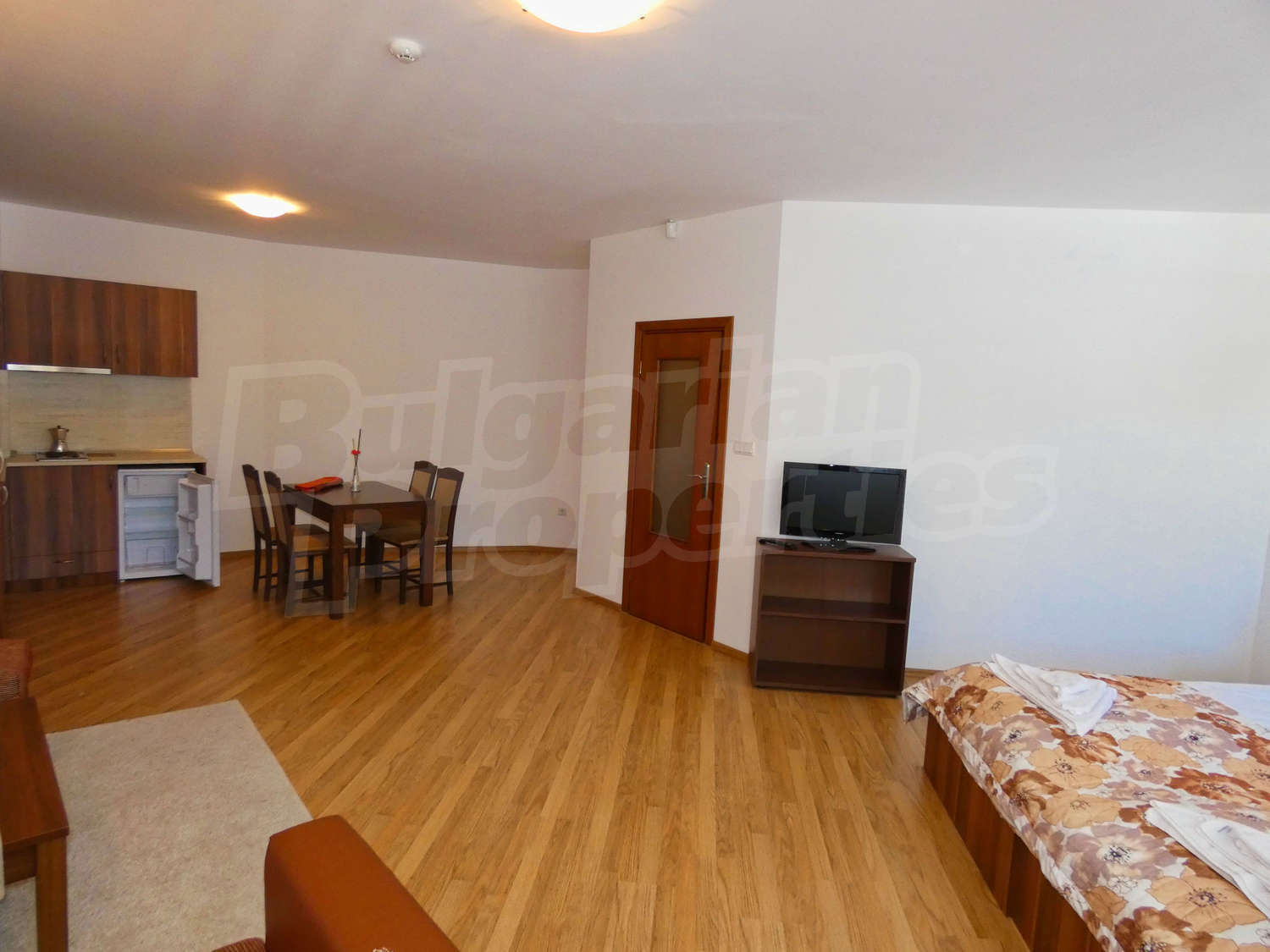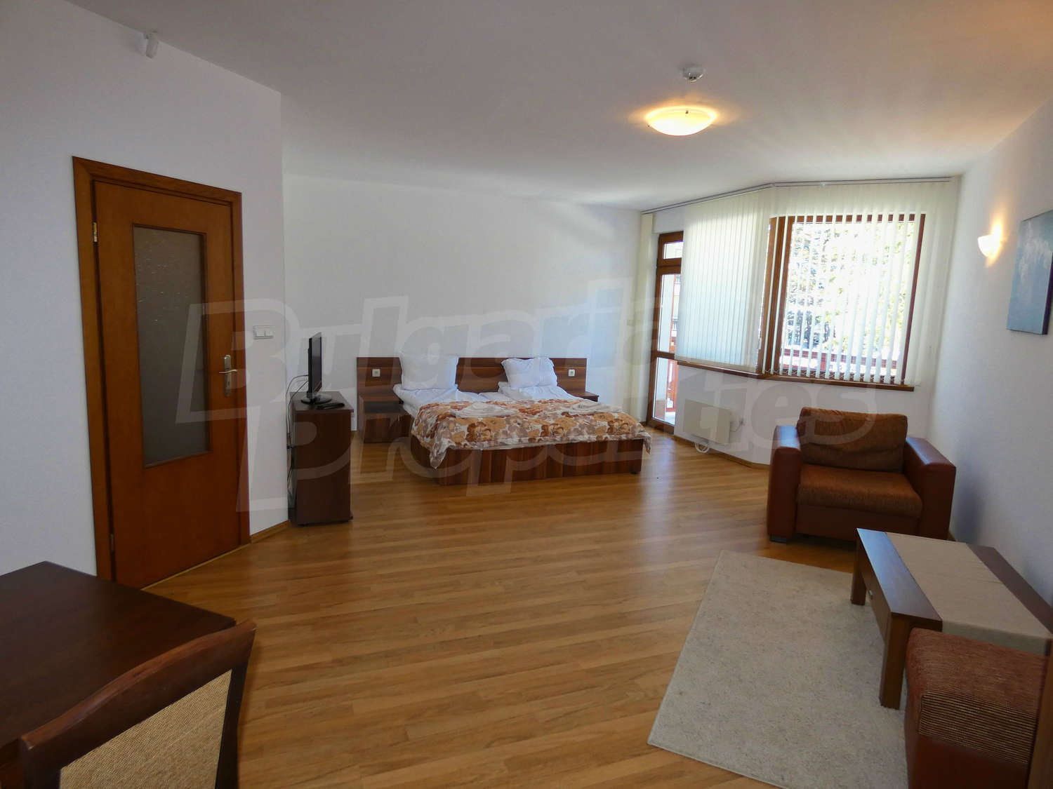 Квартира-студия площадью 70.94 кв.м. Предлагаемая недвижимость построена в 2008. Отопление на электроконвекторах. Деревянные оконные рамы, керамогранитный пол, ламинированный пол, межкомнатные двери, окна пвх и стены покрашенные латексной краской имеются в предлагаемой недвижимости. Недвижимость включает следующую мебель и оснащение: бойлер электрический, ванна, встроенная кухня, вытяжка, духовка, мебель, оборудованная ванная комната, телевизор и холодильник. Из основных коммуникаций обеспечены электричество, вода и центральная канализация. Ванная комната с туалетом, парковка вне дороги, подземная стоянка, стоянка, терраса, комплекс закрытого типа, консьерж, лифт, общие части с отделкой люкс, сауна, тренажерный зал, заасфальтированная дорога, интернет, интернет Wi-Fi, кабельное телевидение, спутниковое тв и телефон имеются в наличии среди прочих упомянутых характеристик предлагаемого объекта, что обеспечит дополнительный комфорт для пользования. Виды на внутренний двор и виды на лес открываются с недвижимости, раскрывая часть красот живописной Болгарии.