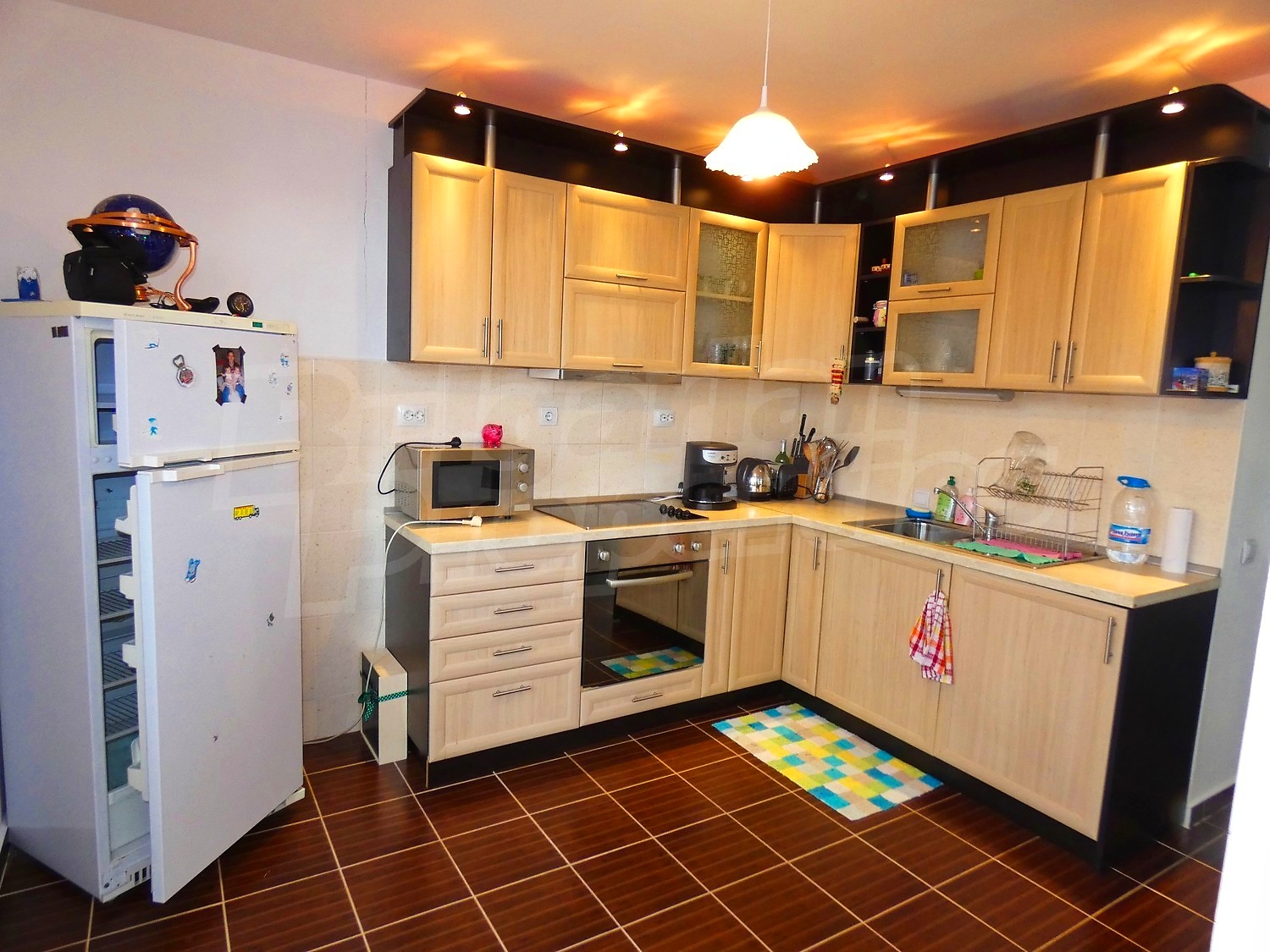 • Кухня со столовой: полностью оборудована керамической плитой, раковиной, кухонными шкафами, вытяжкой, столом с шестью стульями, холодильником, диваном, шкафом для телевизора и телевизор