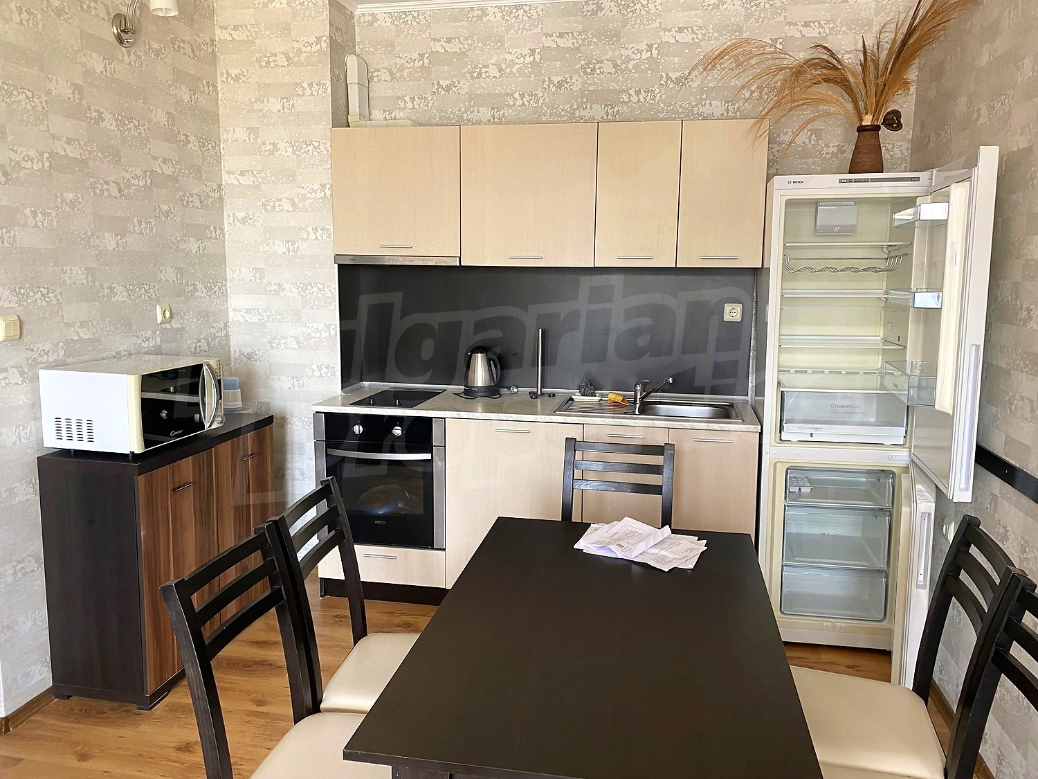Трехкомнатная квартира площадью 109.84 кв.м. Предлагаемая недвижимость построена в 2010. Отопление кондиционером. Керамогранитный пол, ламинированный пол, межкомнатные двери, окна пвх, покрашенные стены и терракотовый пол имеются в предлагаемой недвижимости. Недвижимость включает следующую мебель и оснащение: встроенная кухня, вытяжка, духовка, душевая, кондиционер, мебель, оборудованная ванная комната и холодильник. Из основных коммуникаций обеспечены электричество, вода и центральная канализация. Ванная комната с туалетом, кладовая, обозначенная стоянка, терраса, интернет, кабельное телевидение и телефон имеются в наличии среди прочих указанных характеристик предлагаемого объекта, что обеспечит дополнительные удобства для пользования. Виды на бассейн, виды на внутренний двор и виды на море открываются с недвижимости, раскрывая часть красот живописной Болгарии.