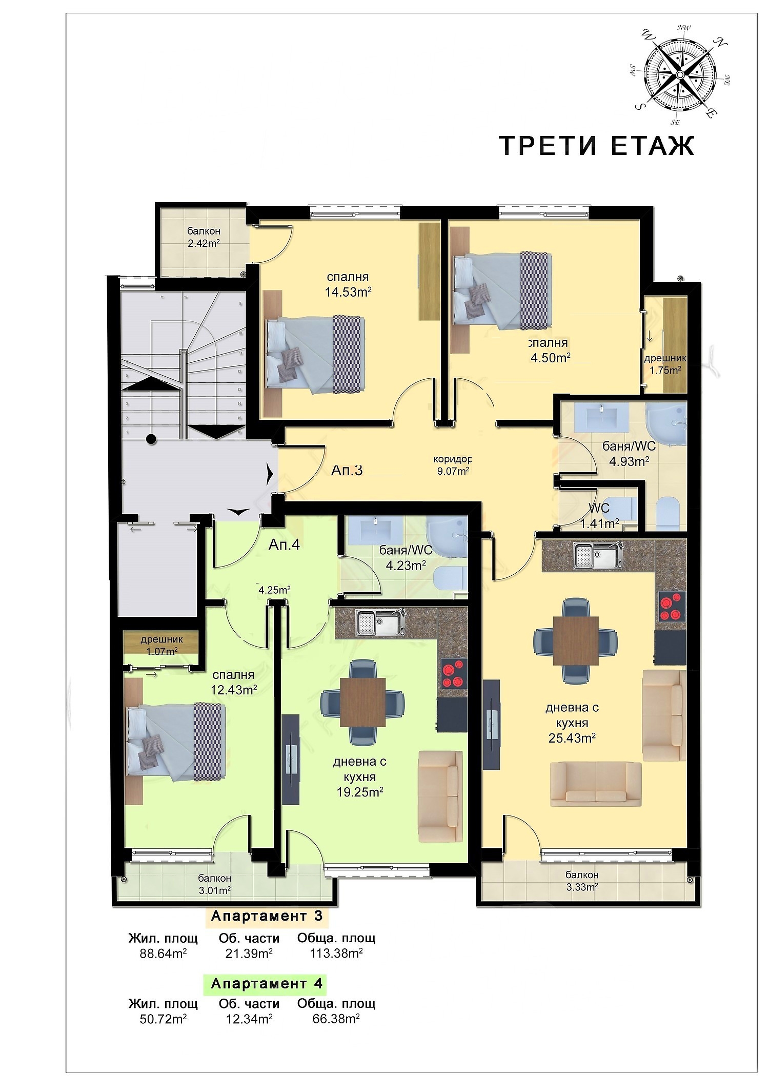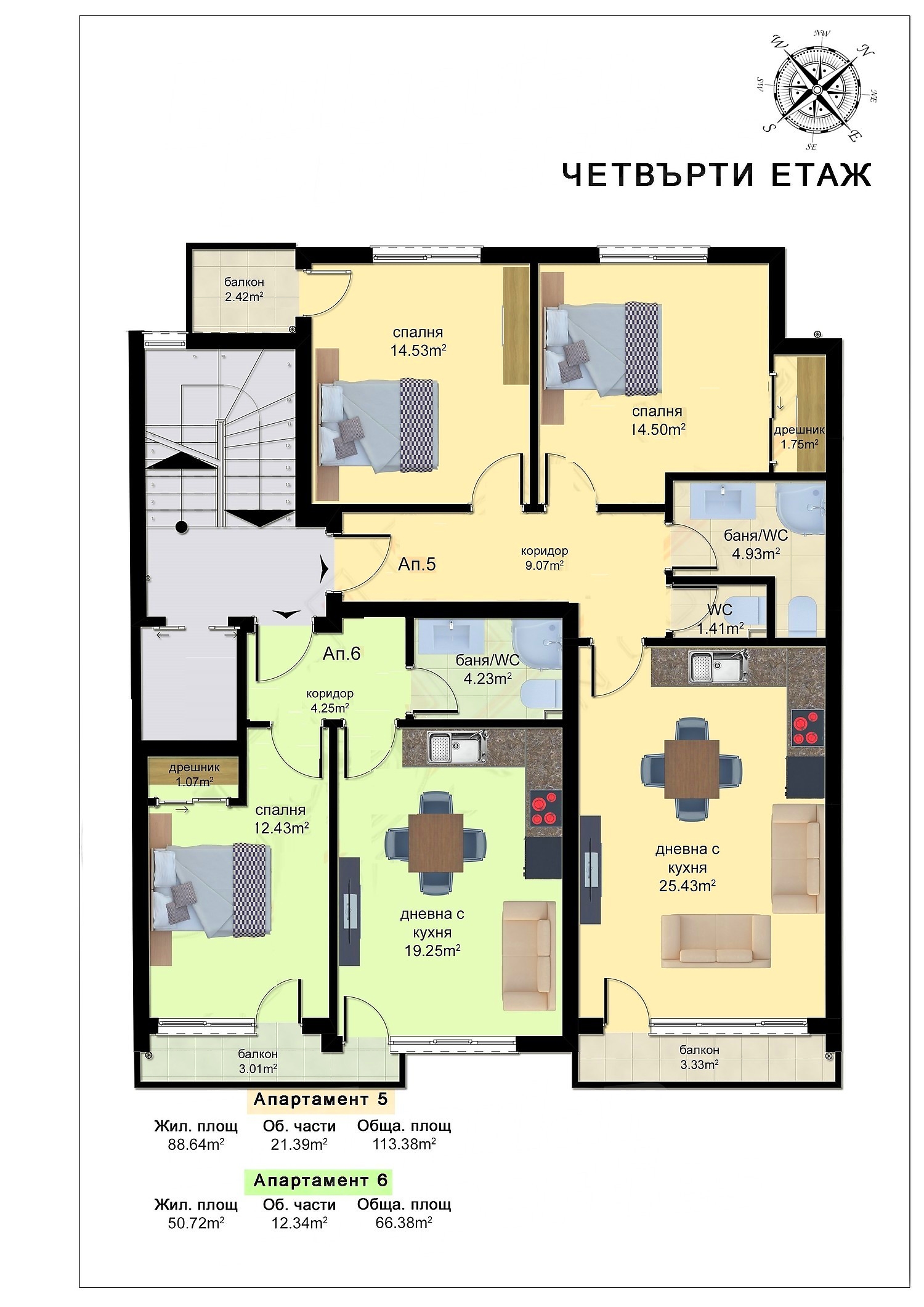 107.81 м2 (жилая площадь: 86.77 м2 плюс общие части: 21.04 м2) еще