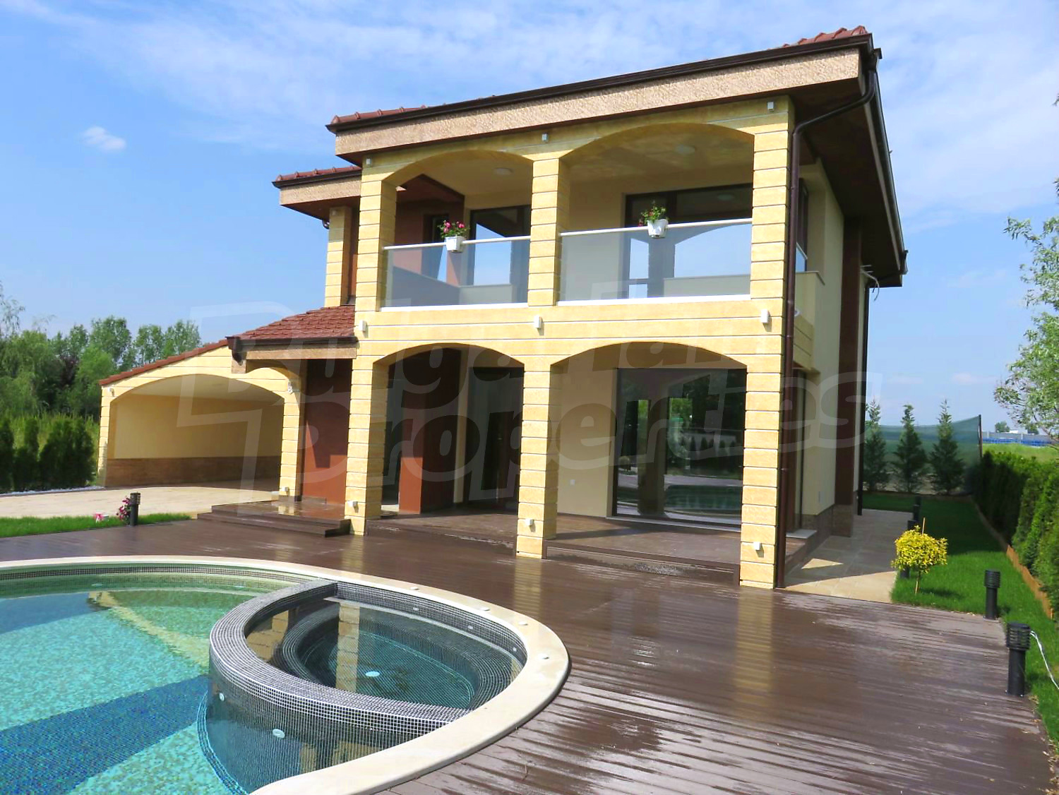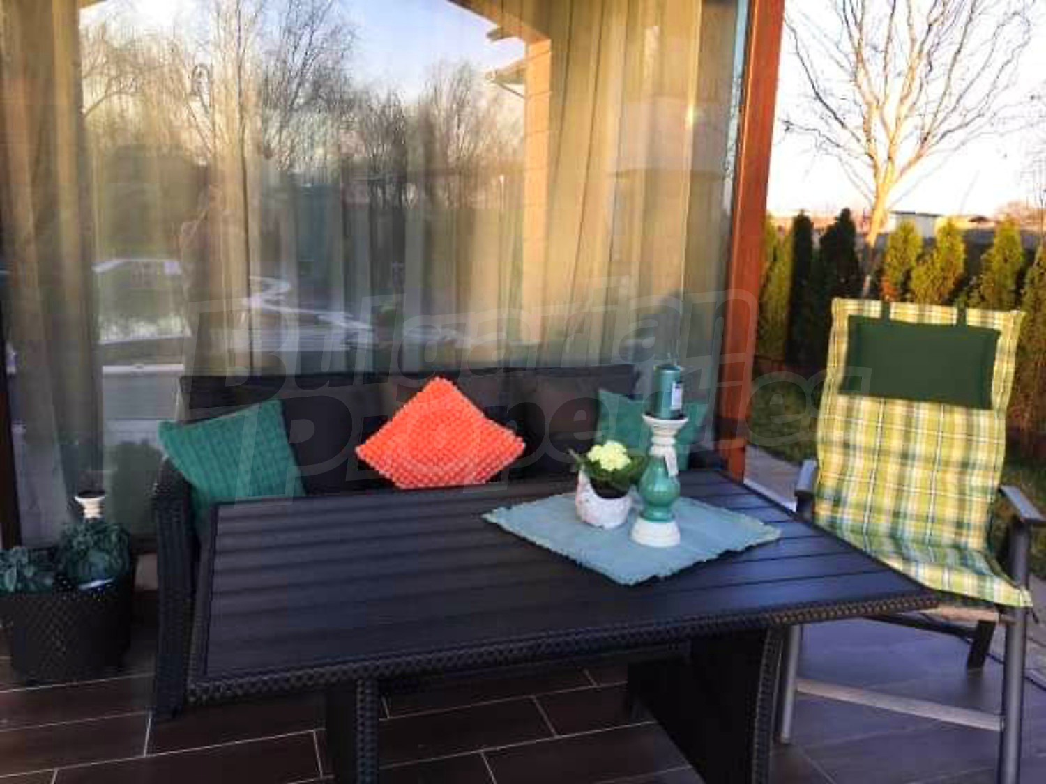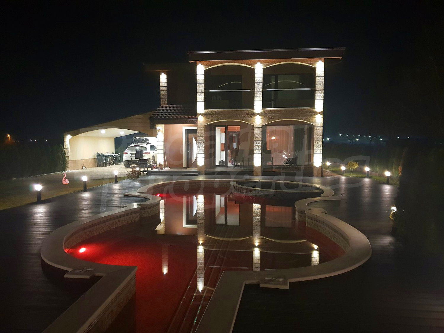 Дом площадью 246 кв. метров. Предлагаемая недвижимость построена в 2019. Газовая система отопления и локальное отопление. Ламинированный пол, окна пвх и покрашенные стены имеются в предлагаемой недвижимости. Недвижимость включает следующую мебель и оборудование: мебель, оборудованная ванная комната и телевизор. Из основных коммуникаций обеспечены отопление на газу, электричество, центральное водоснабжение и центральная канализация. Балконы, гараж, комплекс закрытого типа, общие части с отделкой люкс и заасфальтированная дорога имеются в наличии среди прочих характеристик предлагаемого объекта, что обеспечит дополнительный комфорт для пользования. Виды на бассейн и виды на внутренний двор открываются с недвижимости, раскрывая часть красот живописной Болгарии.