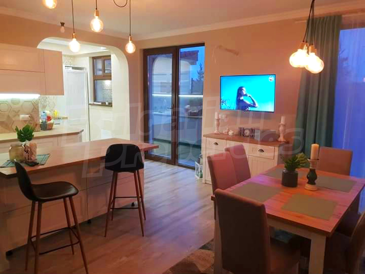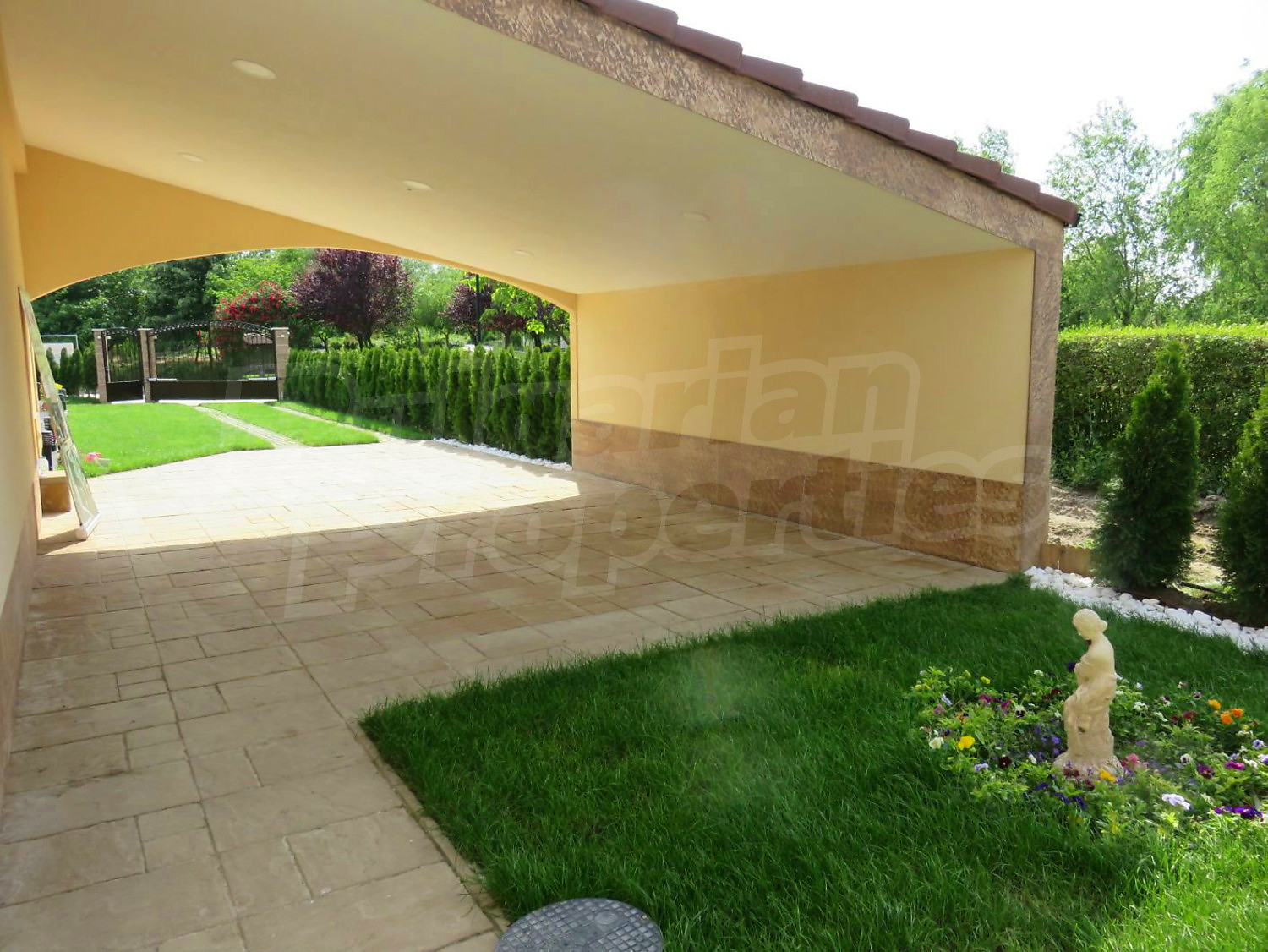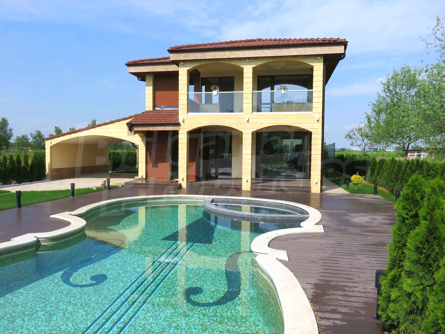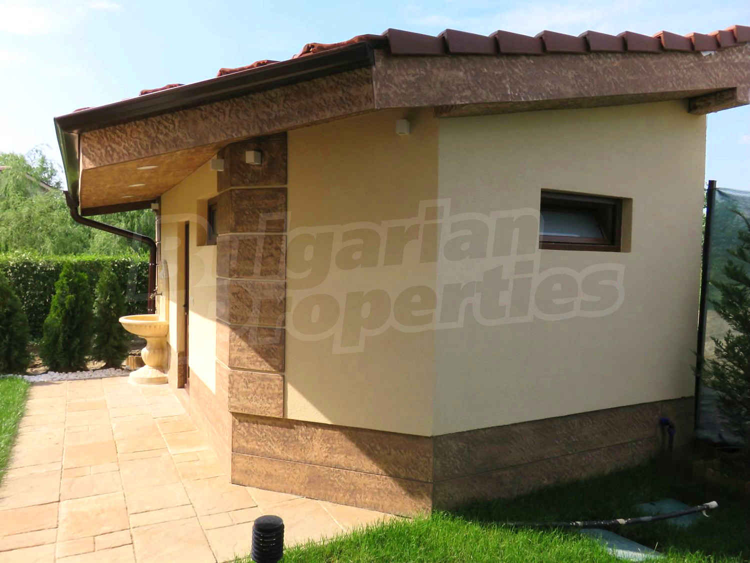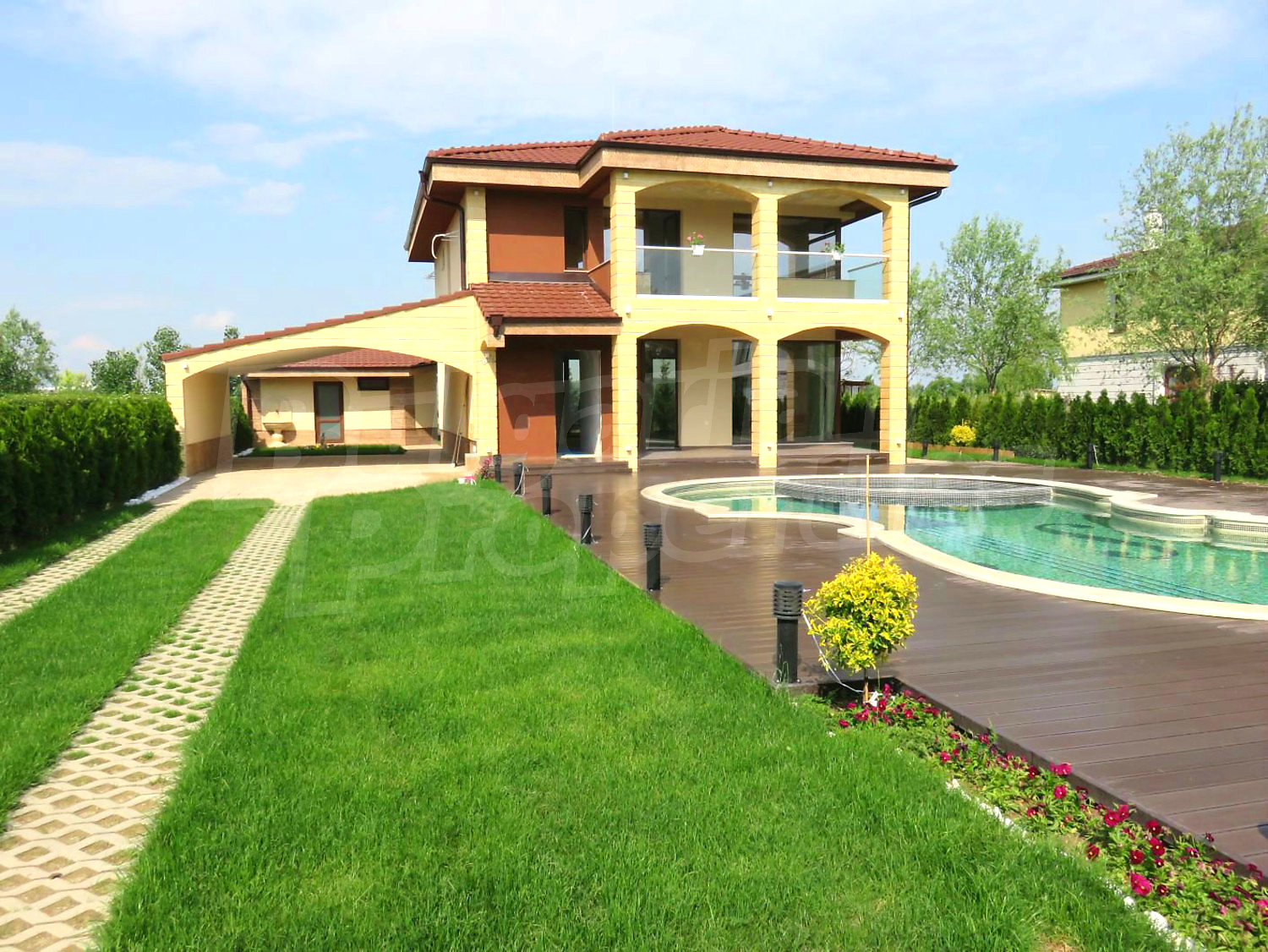 Дом площадью 246 кв. метров. Предлагаемая недвижимость построена в 2019. Газовая система отопления и локальное отопление. Ламинированный пол, окна пвх и покрашенные стены имеются в предлагаемой недвижимости. Недвижимость включает следующую мебель и оборудование: мебель, оборудованная ванная комната и телевизор. Из основных коммуникаций обеспечены отопление на газу, электричество, центральное водоснабжение и центральная канализация. Балконы, гараж, комплекс закрытого типа, общие части с отделкой люкс и заасфальтированная дорога имеются в наличии среди прочих характеристик предлагаемого объекта, что обеспечит дополнительный комфорт для пользования. Виды на бассейн и виды на внутренний двор открываются с недвижимости, раскрывая часть красот живописной Болгарии.
