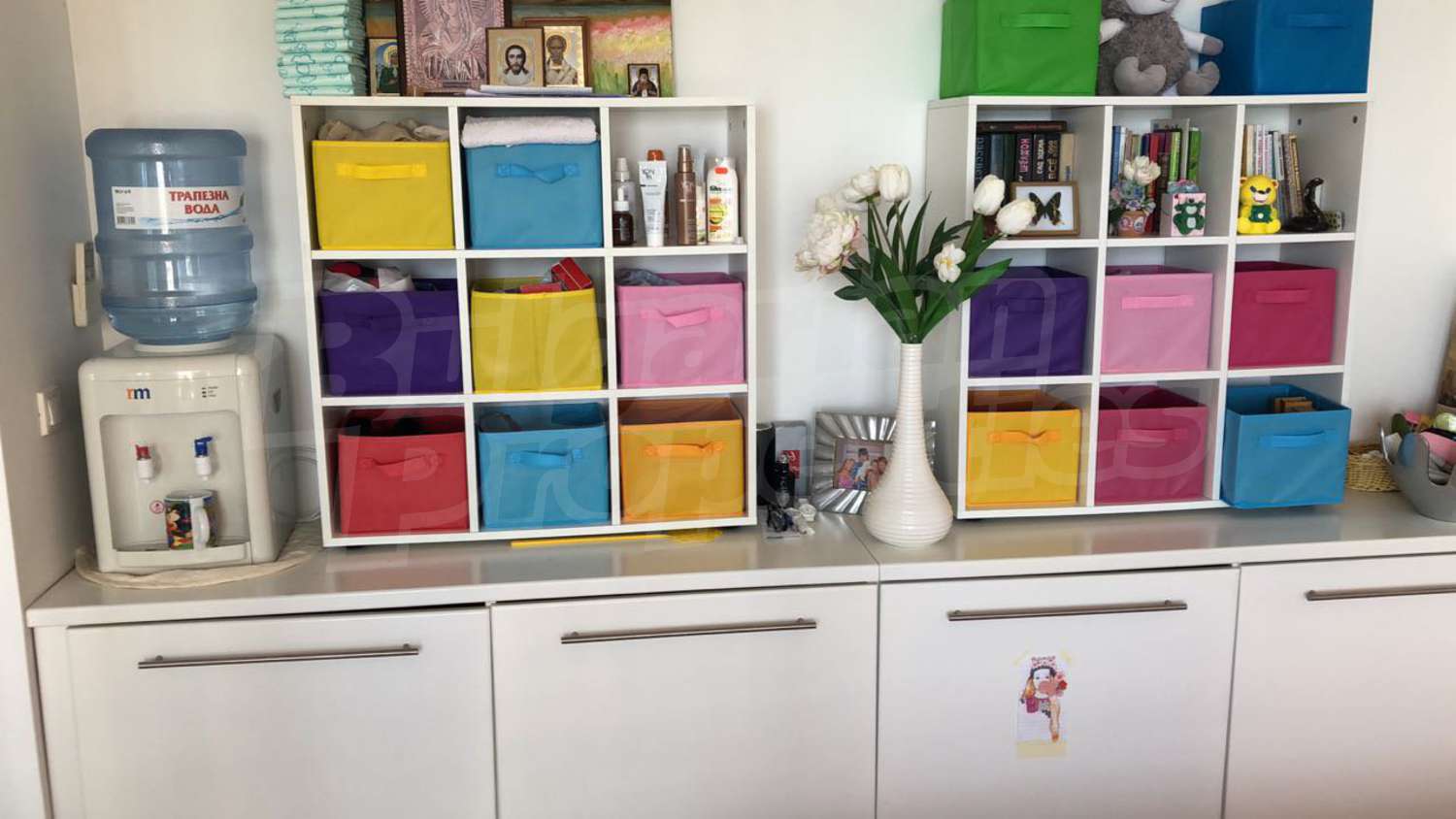 Она продается полностью меблированным, как на картинке. Мини-кухня с кухонными шкафами и всеми необходимыми электроприборами, обеденный стол со стульями, большой диван и телевизор. Яркая спальня с большой кроватью, детской кроватью и шкафами. Полностью оборудованная ванная комната.