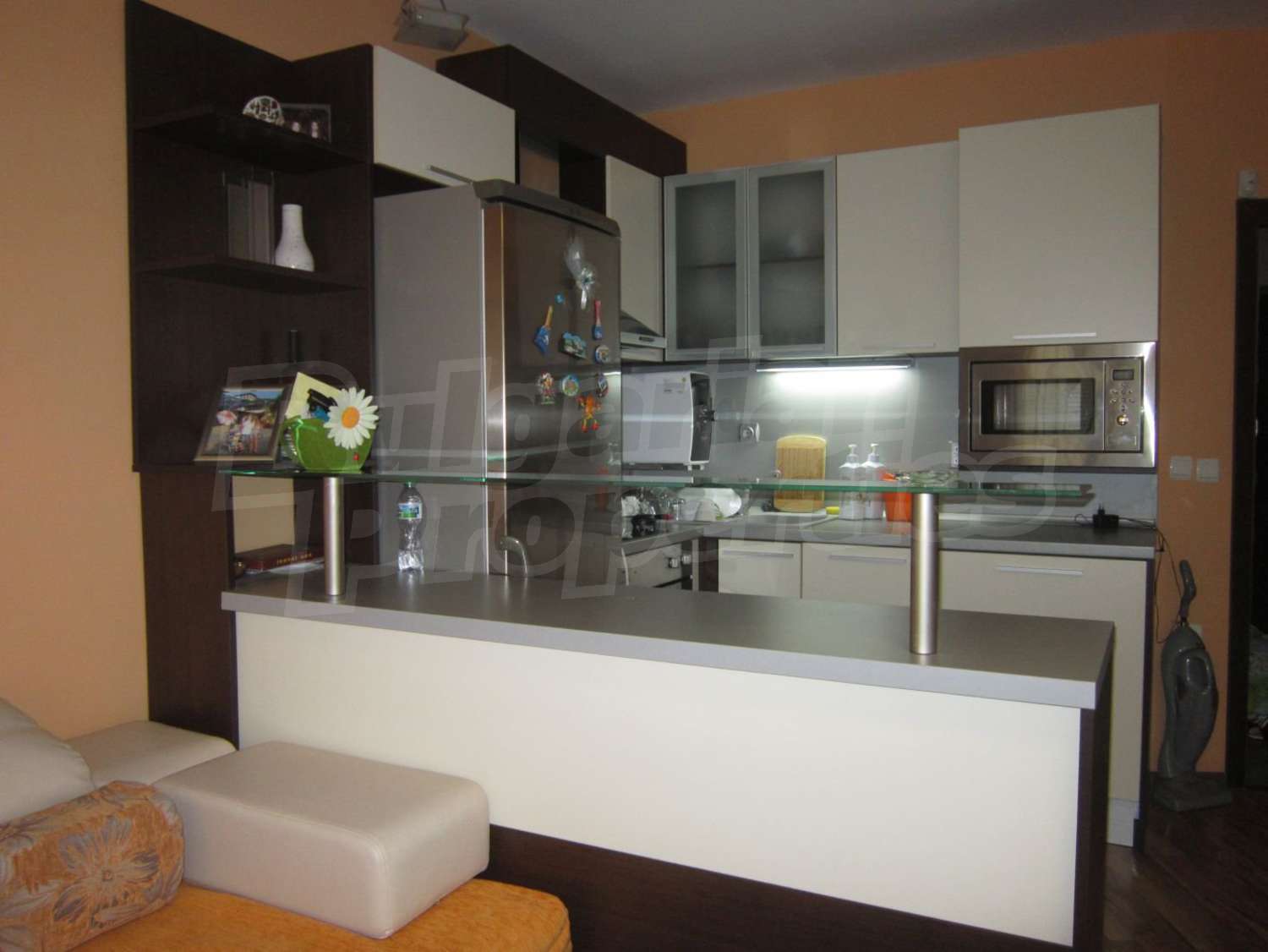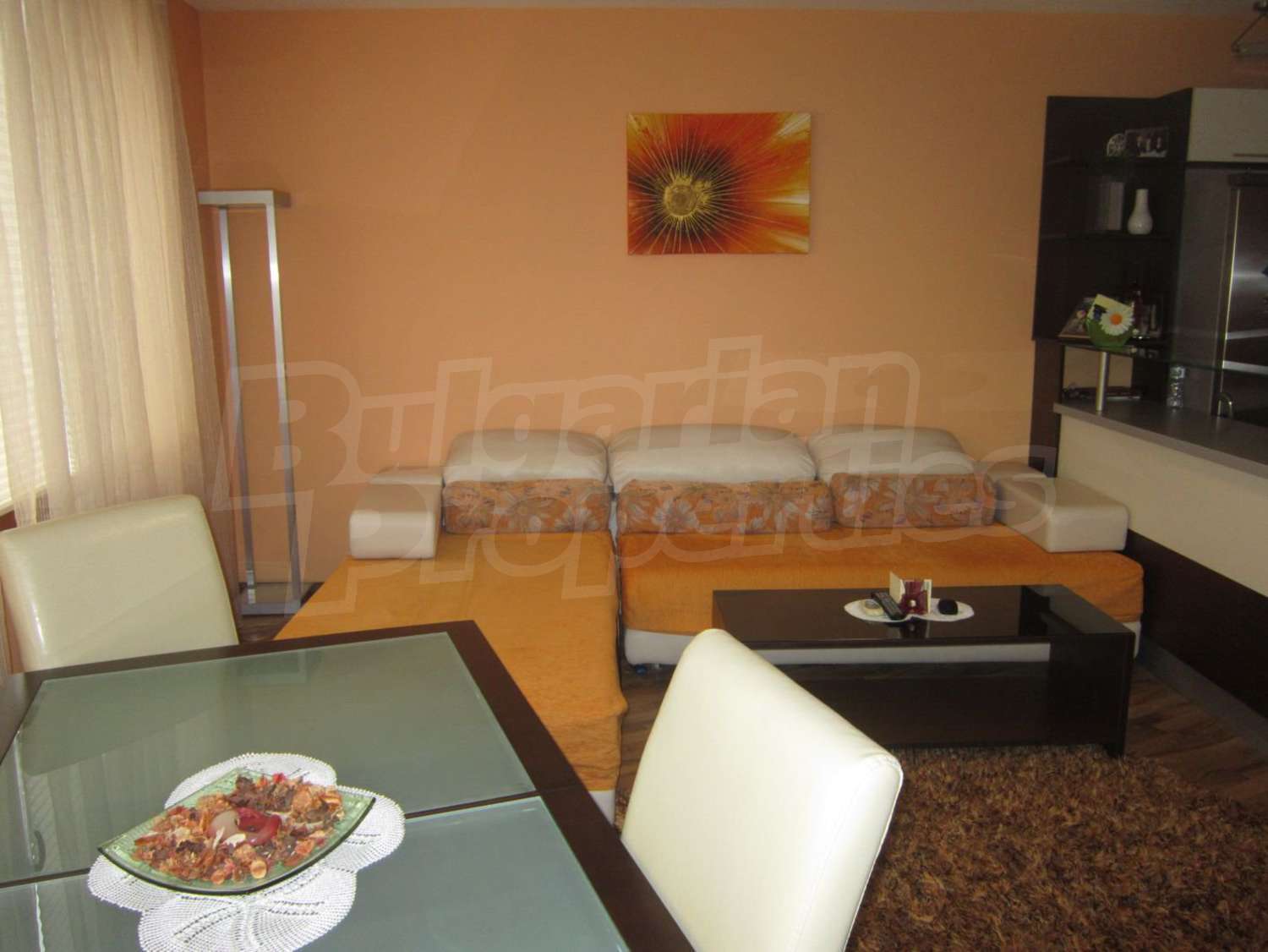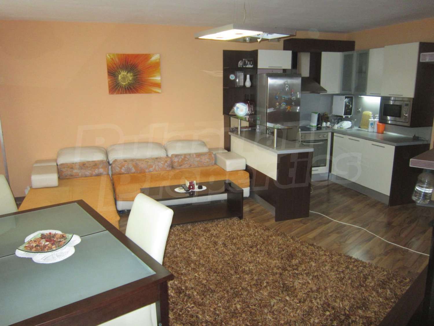 Двухкомнатная квартира площадью 65 кв. метров. Предлагаемая недвижимость построена в 2010. Отопление кондиционером. Обеспечено кондиционирование следующего типа: стандартные кондиционеры. Керамогранитный пол, ламинированный пол, межкомнатные двери, окна пвх и стены покрашенные латексной краской имеются в предлагаемой недвижимости. Недвижимость включает следующую мебель и оснащение: бойлер электрический, вытяжка, духовка, душевая, кондиционер, мебель, оборудованная ванная комната, телевизор и холодильник. Из основных коммуникаций обеспечены электричество, вода, центральное водоснабжение и центральная канализация. Парковка вне дороги, парковочное место, терраса, заасфальтированная дорога, интернет, кабельное телевидение и система охранной сигнализации имеются в наличии среди прочих обозначенных характеристик предлагаемого объекта, что обеспечит дополнительные удобства для пользования. Виды на лес и виды на море открываются с недвижимости, раскрывая часть красот живописной Болгарии.